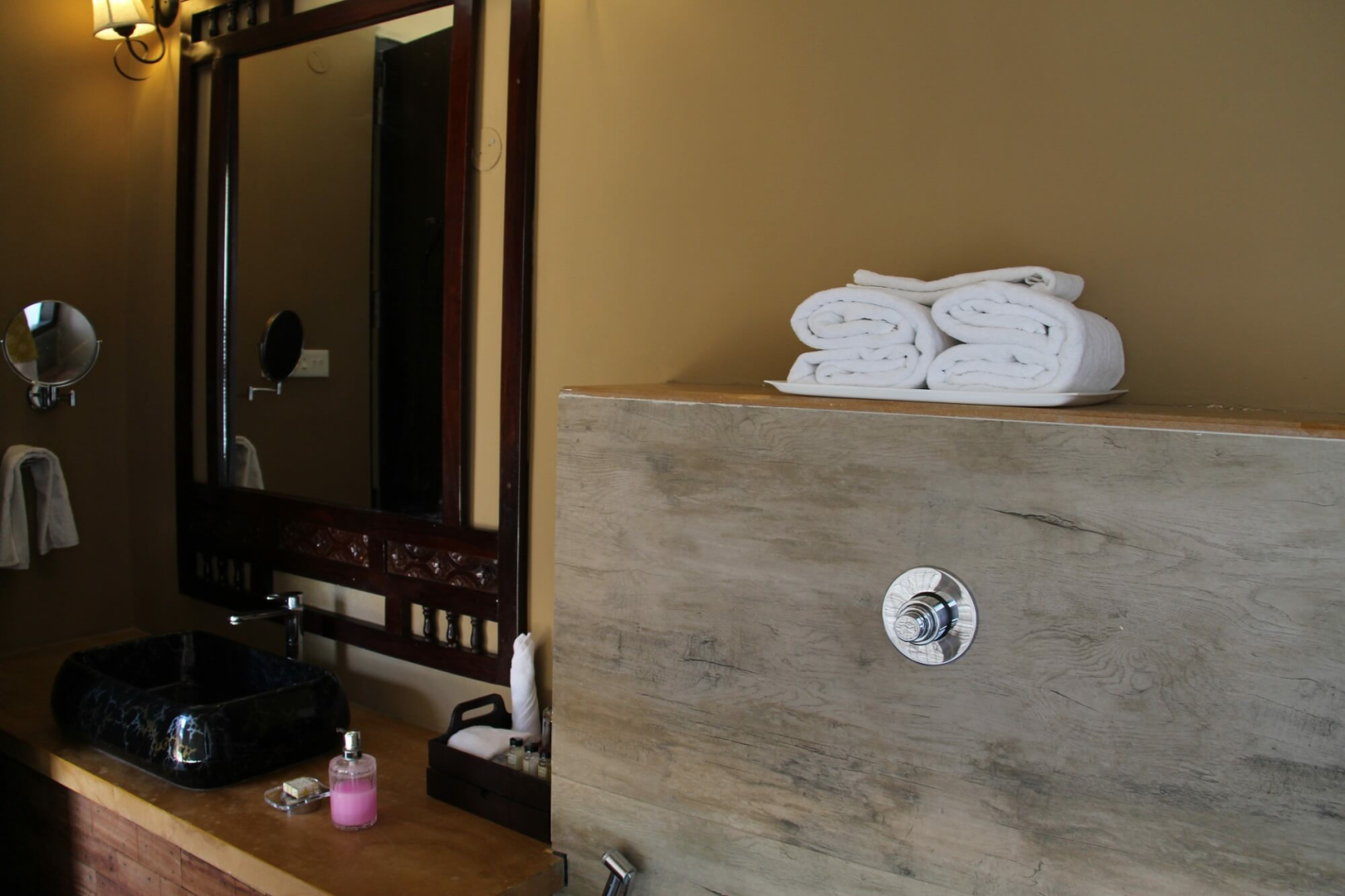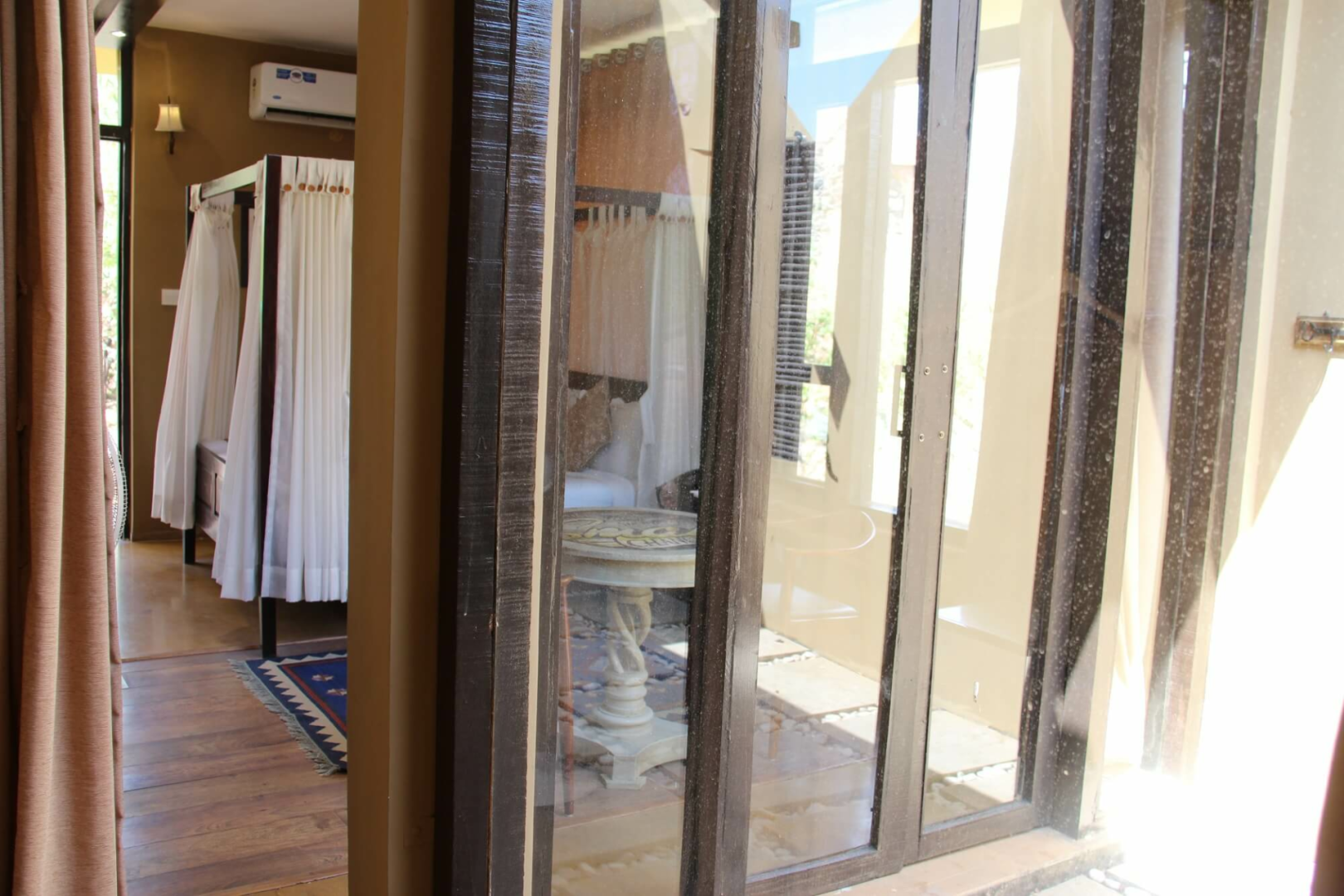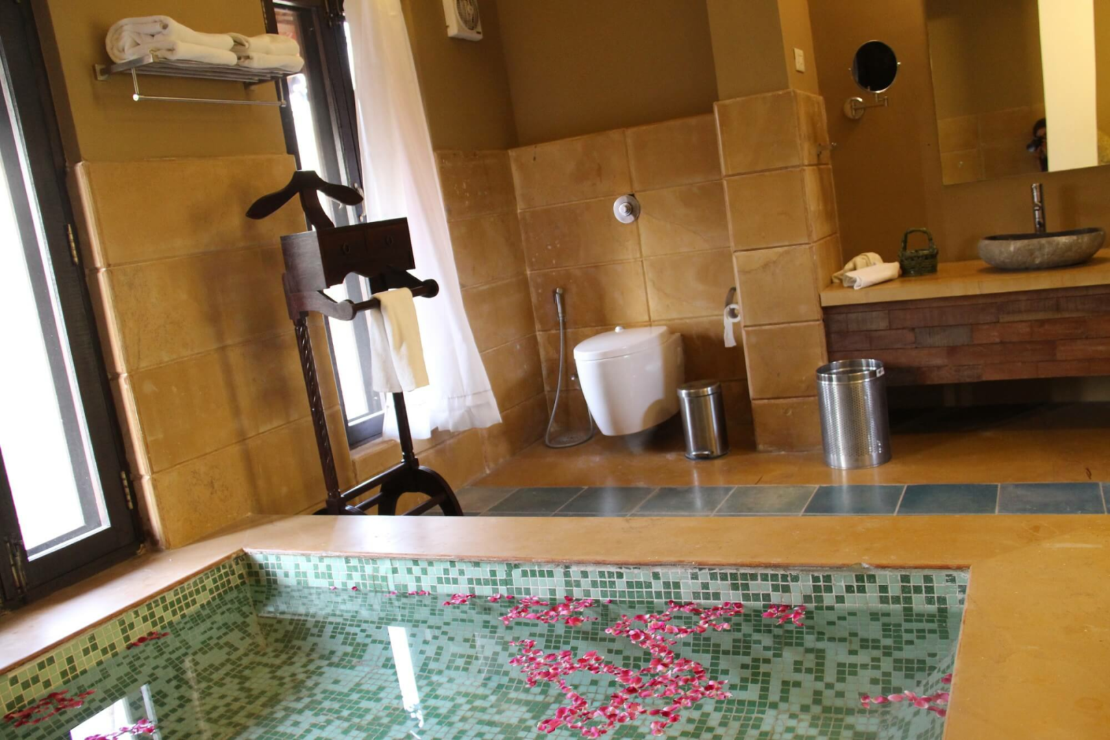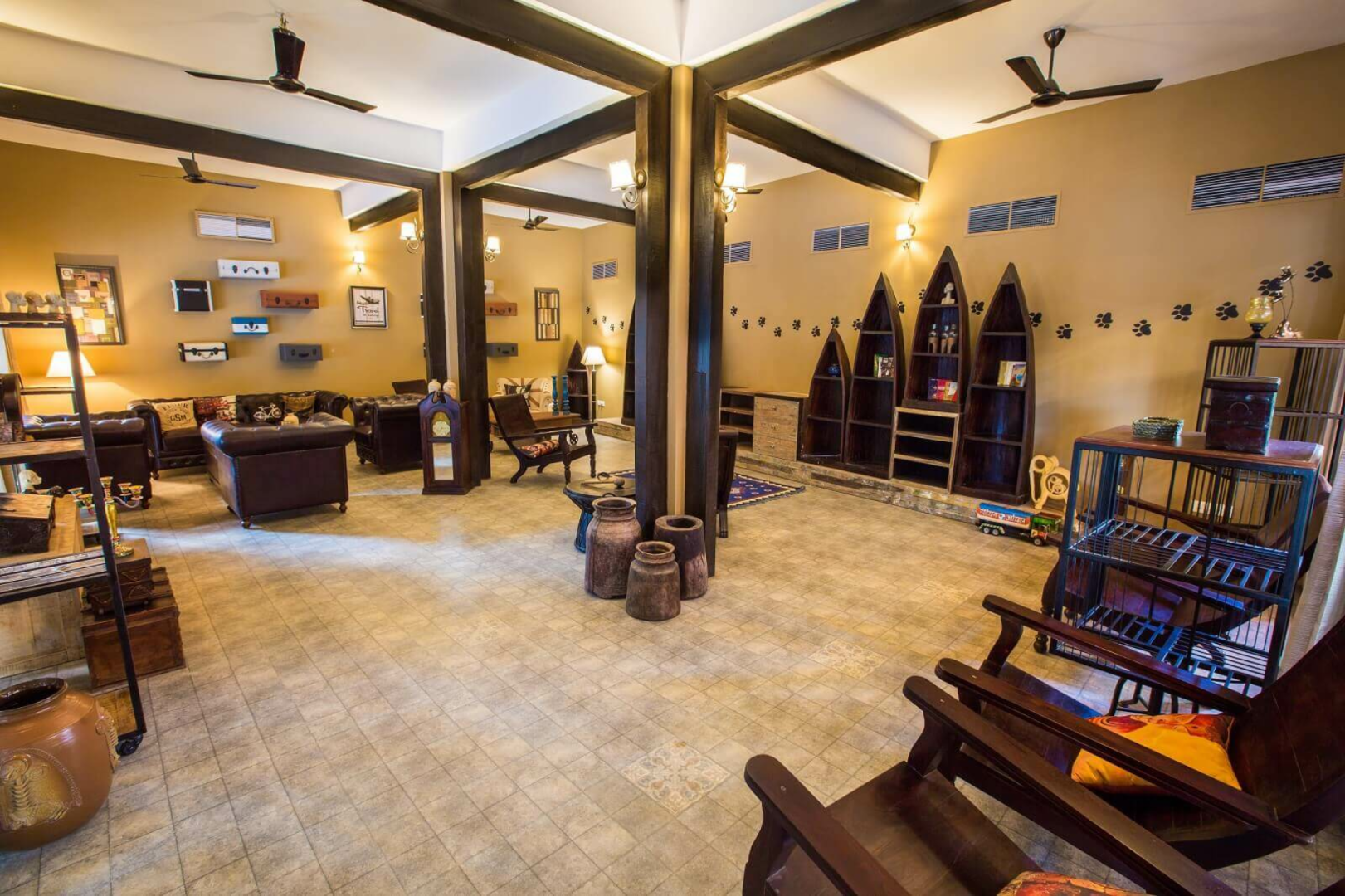 Es gibt 12 Zimmer mit drei unterschiedlichen Kategorien. Von allen sind die Standardzimmer sicherlich die Option mit dem besten Preis- Leistungsverhältnis. Diese sind sehr großzügig geschnitten und haben ein ausgeklügeltes Design, das viel Raum ermöglicht. Darüber hinaus gibt es Cottages und Machaans, welche aus zwei Stockwerken bestehen. Die Eingangstür im Erdgeschoss öffnet sich zu einem Hof auf der rechten Seite. Geradeaus fndet man das großzügige und schön dekorierte Schlafzimmer mit zwei Terrassen. Am Flur links gibt es eine Tür zum Badezimmer, wo das mit Blüten dekorierte Badebecken ein Blickfang ist. Rechts vom Flur führt eine weitere Tür zu der Treppe zum Obergeschoss, wo sich eine sehr große Terrasse mit Blick auf den umliegenden Wald befindet.