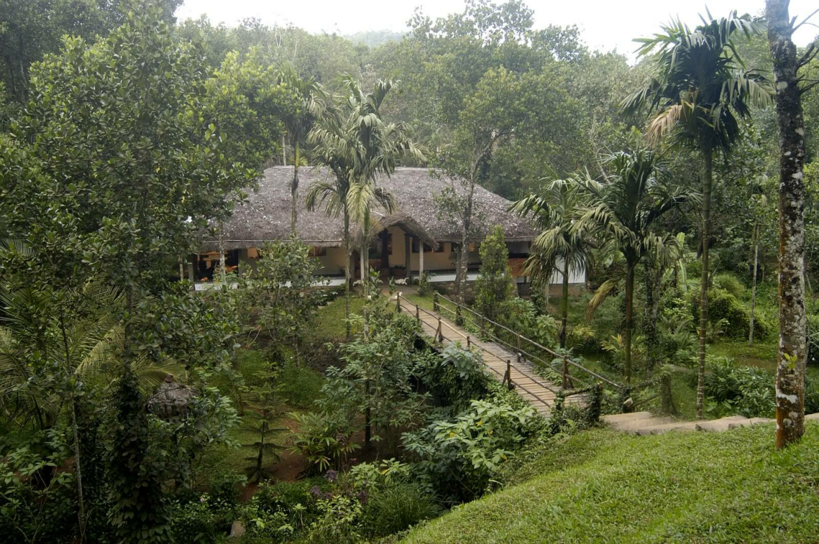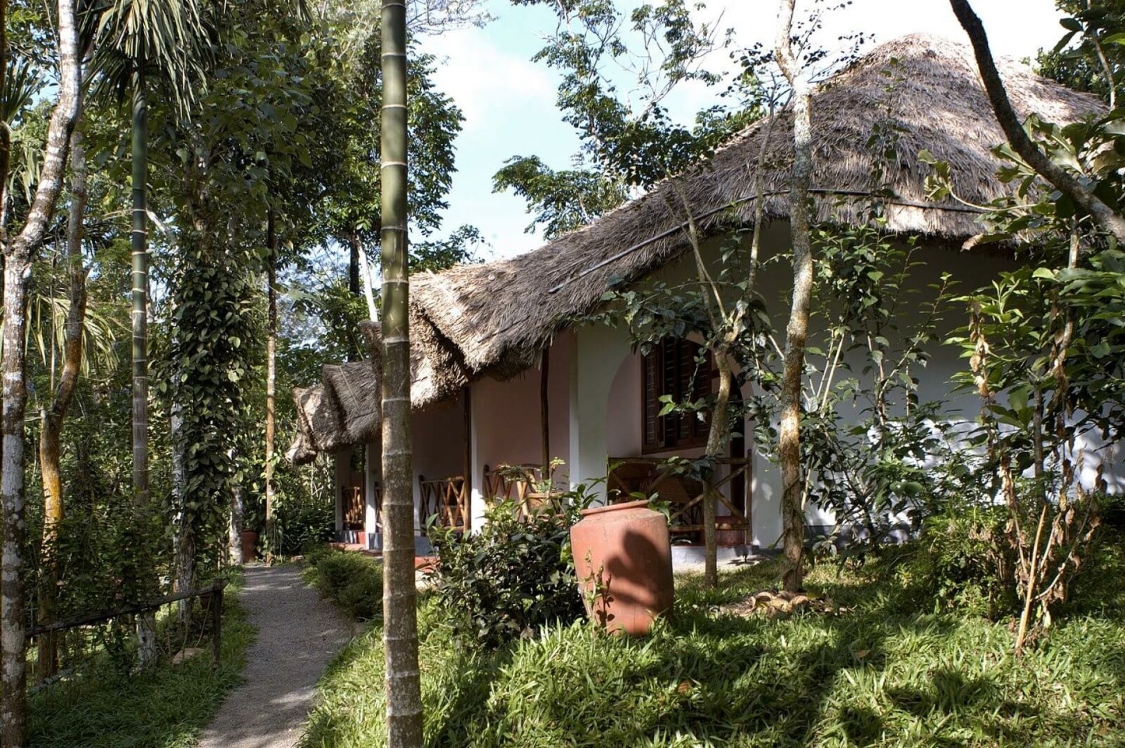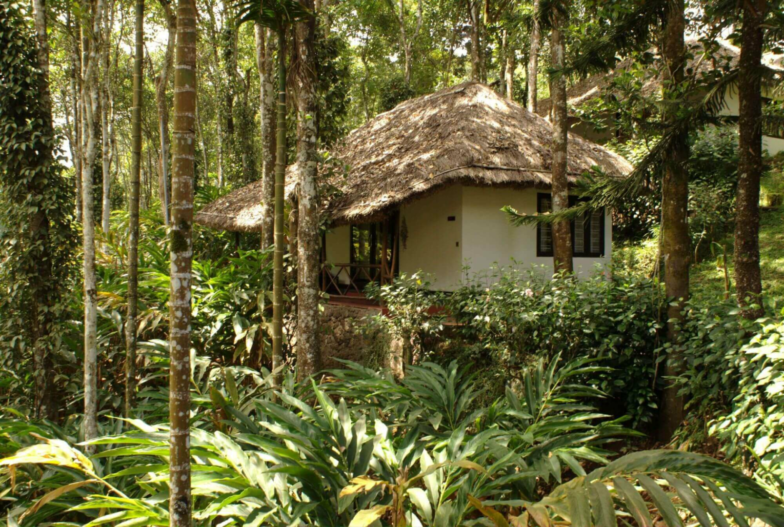 Shalimar Spice Garden ist eine schicke Bungalowanlage des oberen Preissegments am Rande eines Dorfes bei Periyar mit geschmackvoll eingerichteten Bungalows unter Reetdach inmitten einer üppigen Gartenlandschaft.