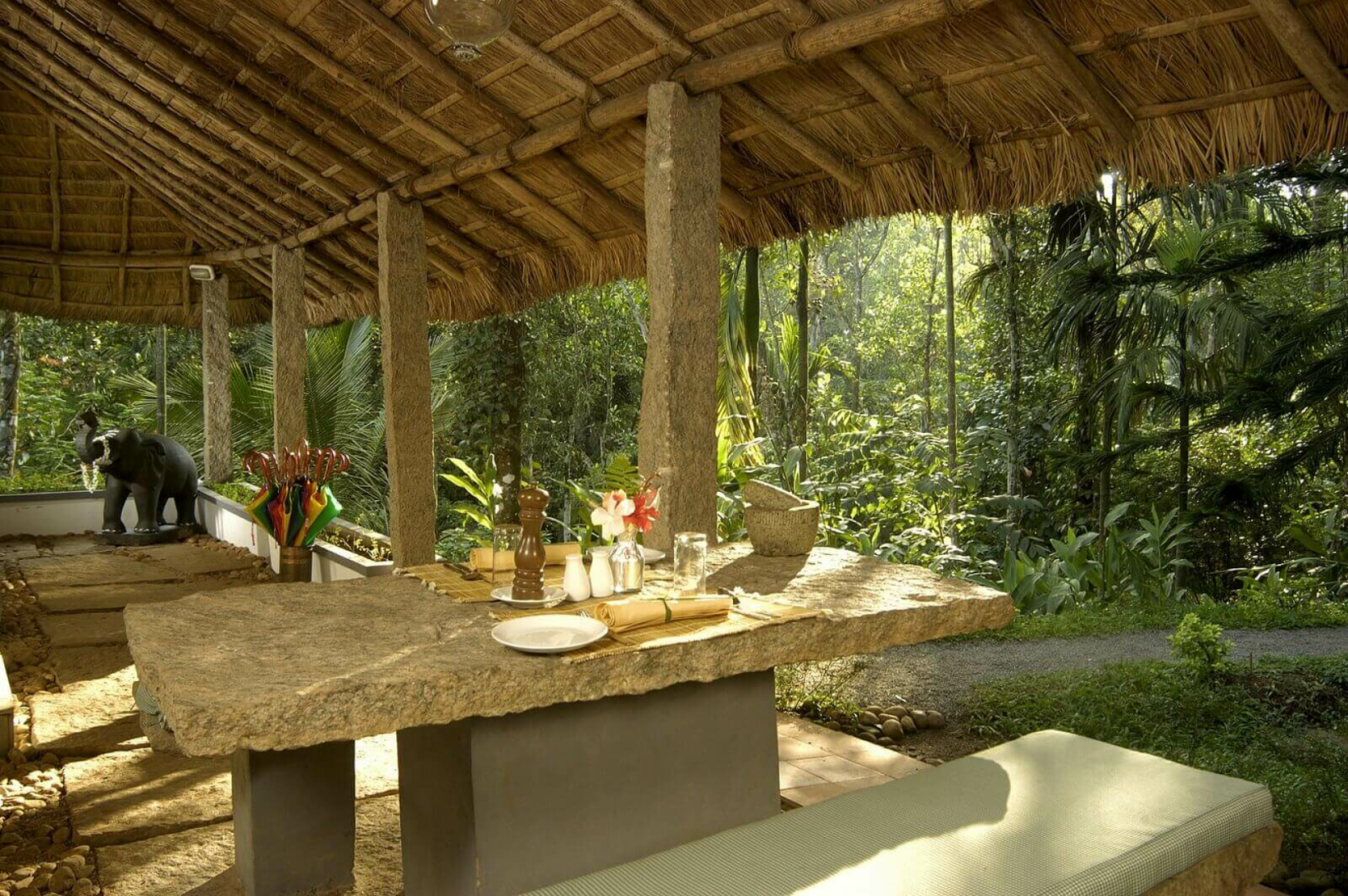 Indhrivanam ist eine kleine, ökologisch geführte Lodge zehn Kilometer nördlich von Kumily, Periyar und besteht aus liebevoll dekorierten, geräumigen Steincottages mit viel Liebe zum Detail. Es werden Liebhaber der individuellen Unterkünfte mit Charme nicht enttäuscht.