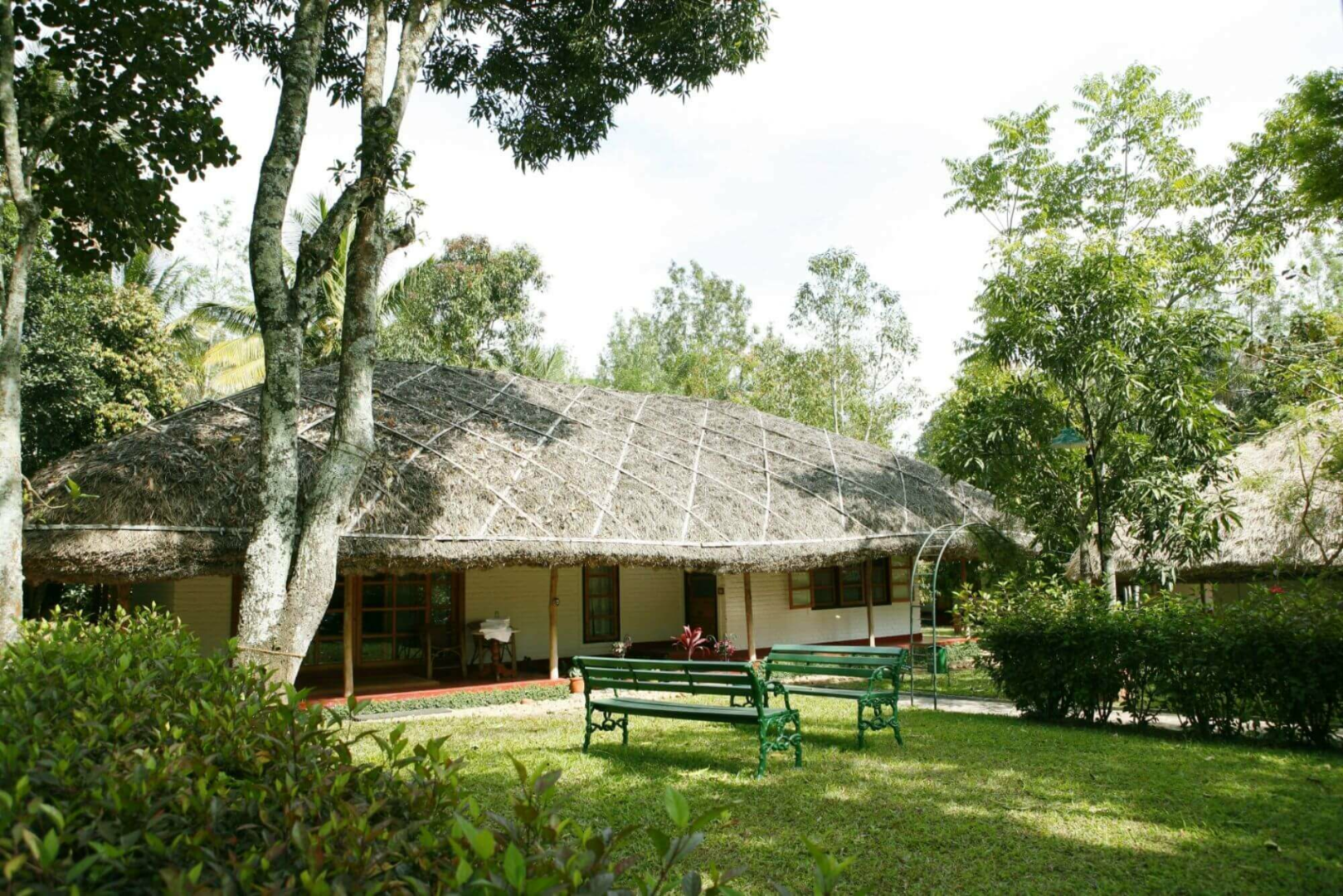 Shalimar Spice Garden ist eine schicke Bungalowanlage des oberen Preissegments am Rande eines Dorfes bei Periyar mit geschmackvoll eingerichteten Bungalows unter Reetdach inmitten einer üppigen Gartenlandschaft.