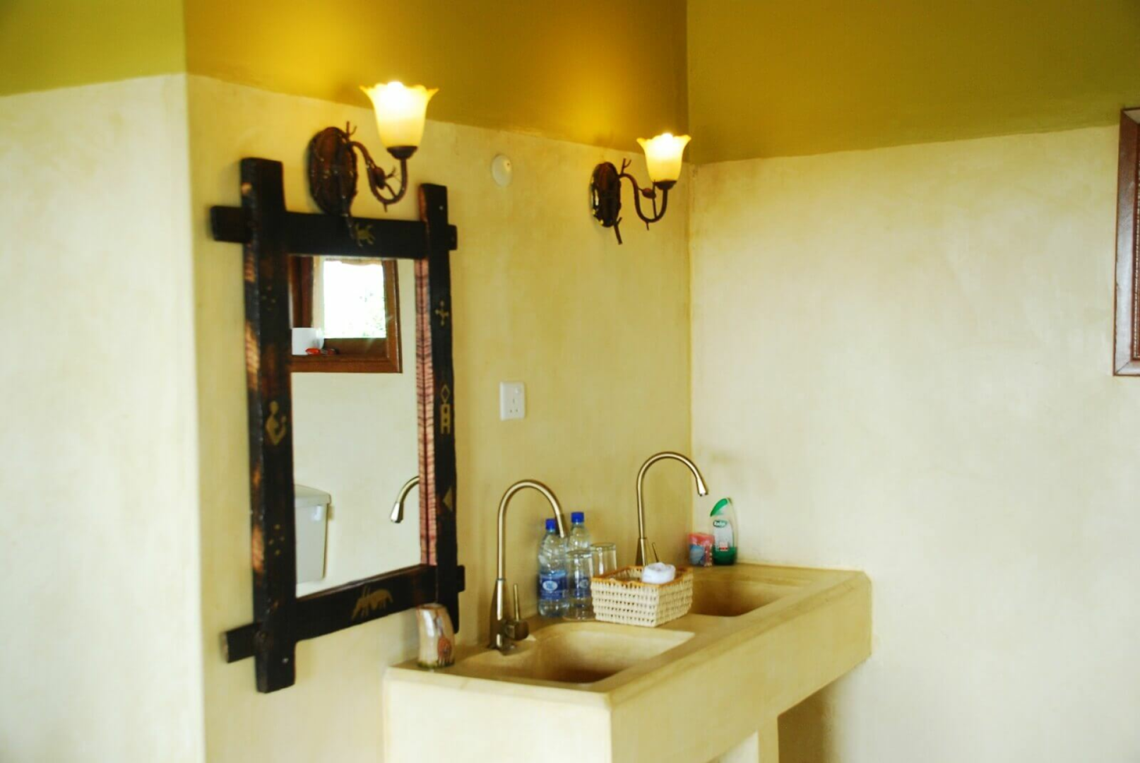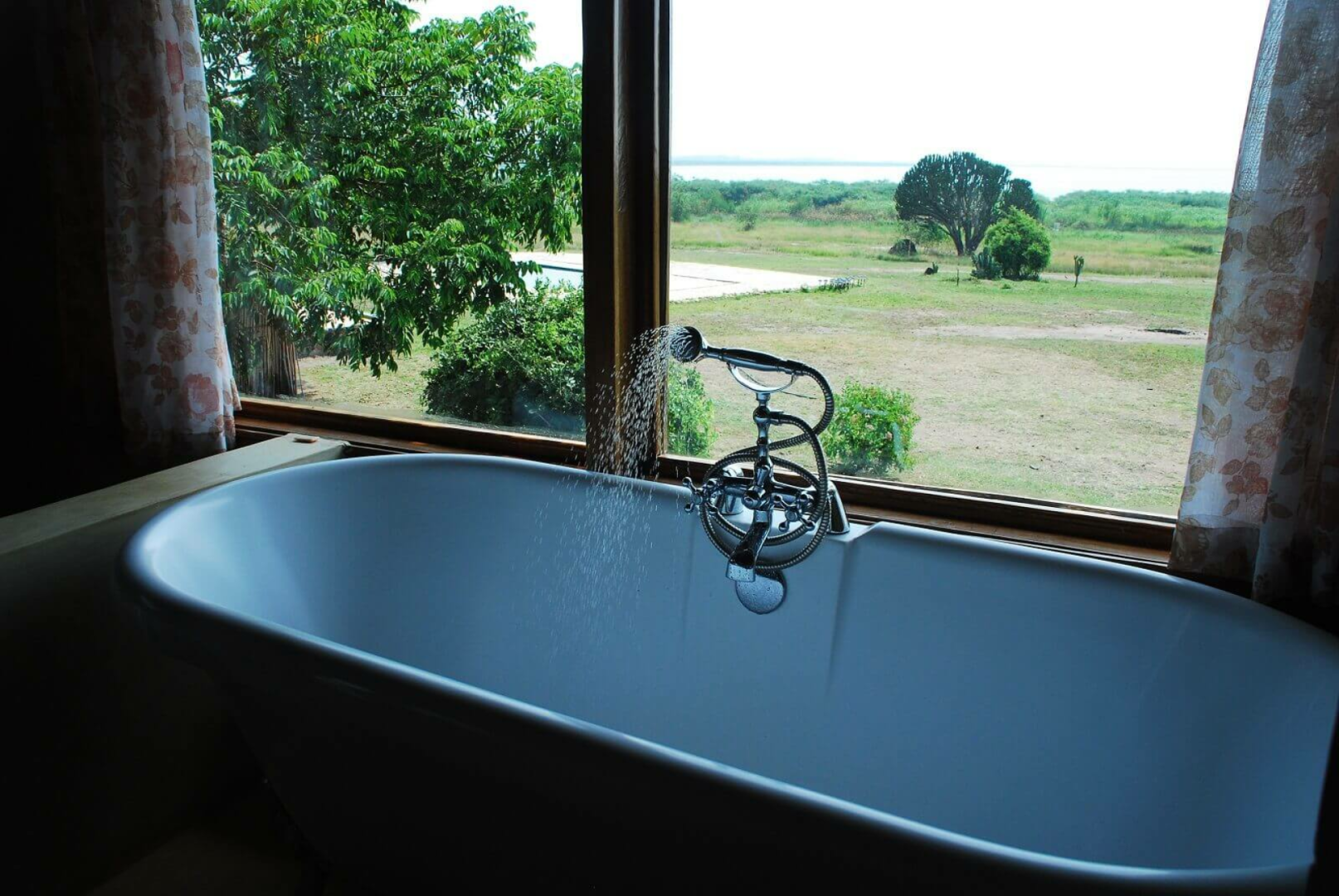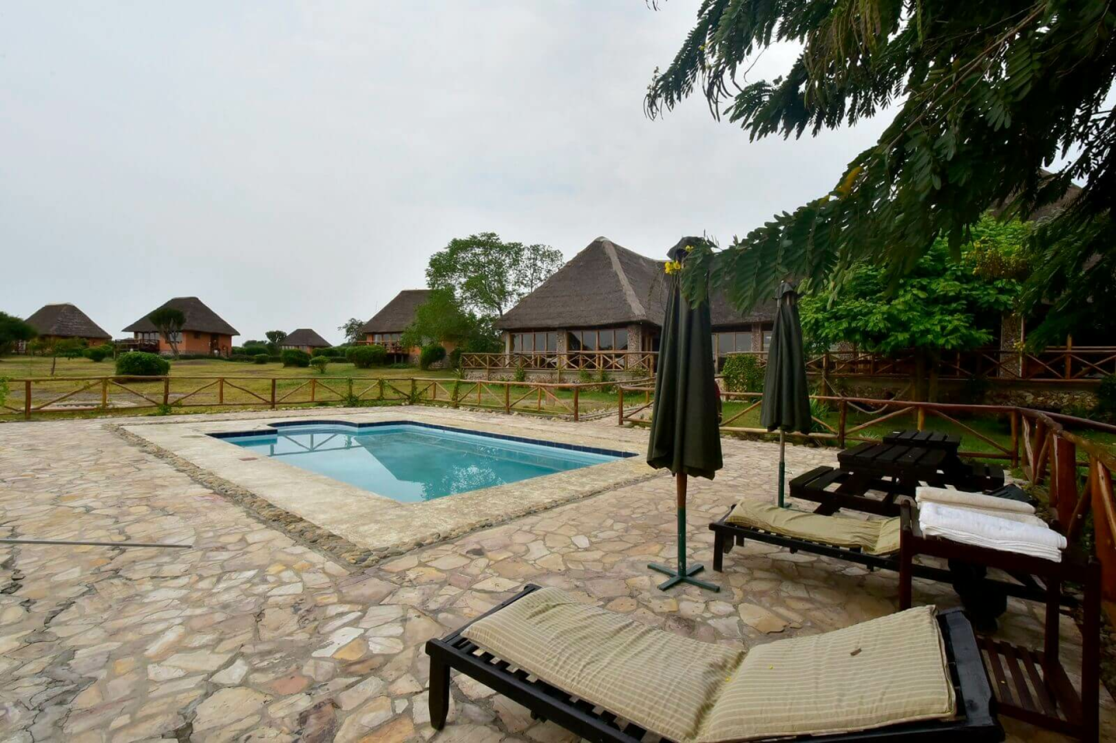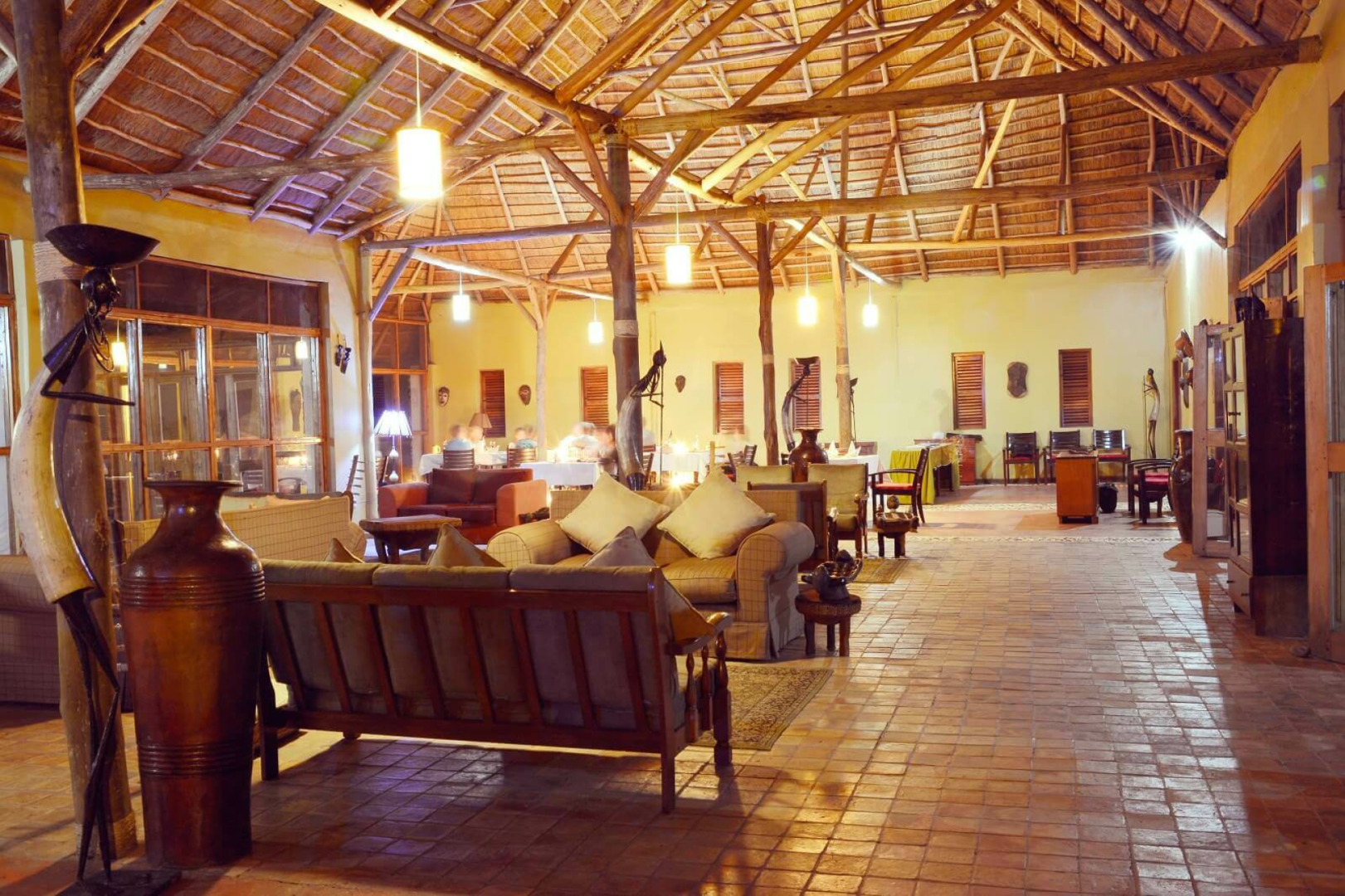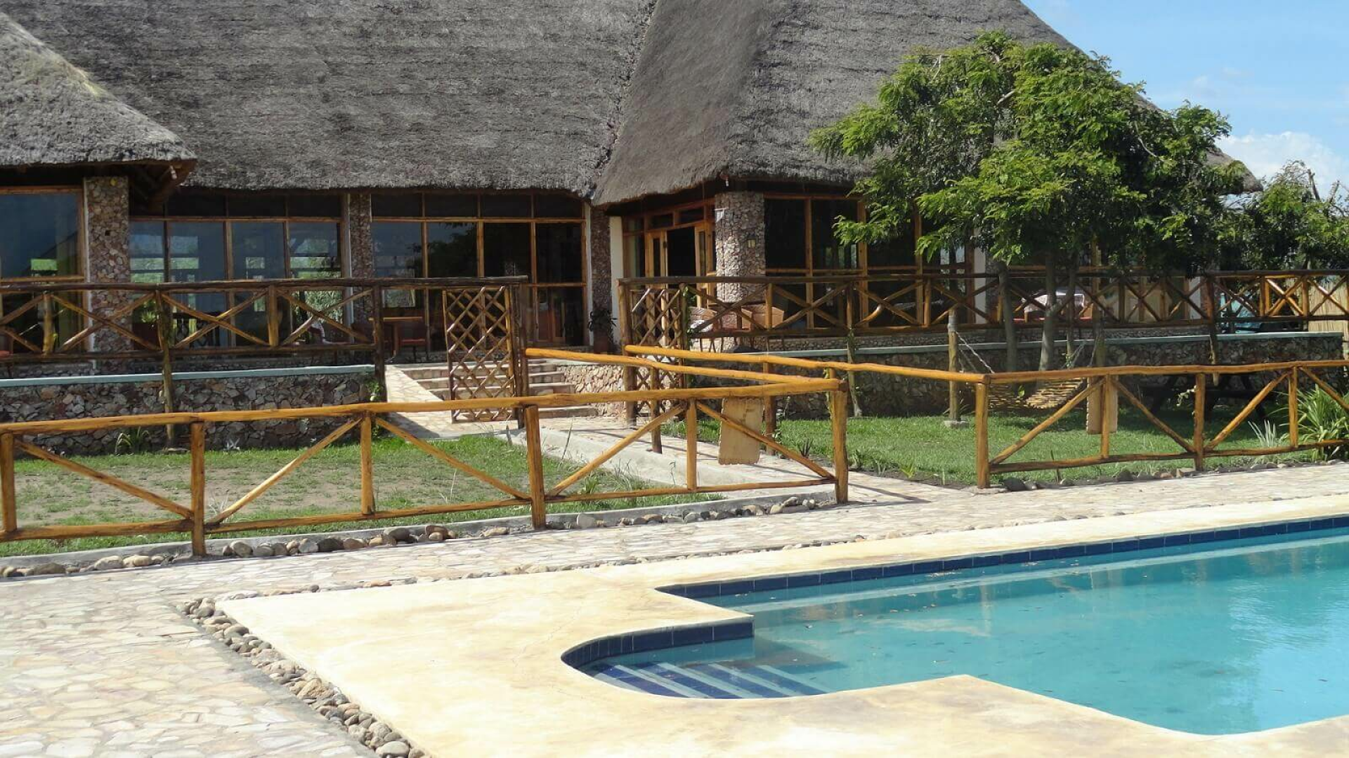 Das Zentrum der Anlage bildet das schön eingerichtete große Haupthaus unter Reetdach, in dem sich auch ein Restaurant und eine Bar befinden. Die Unterbringung erfolgt in schön eingerichteten Cottages mit Veranda und einem Bad mit Badewanne. Ein Pool (er wird leider nicht täglich gereinigt) ist auch vorhanden. Nachts wandern friedlich die Nilpferde aus dem nah gelegenen See zwischen den Cottages umher.