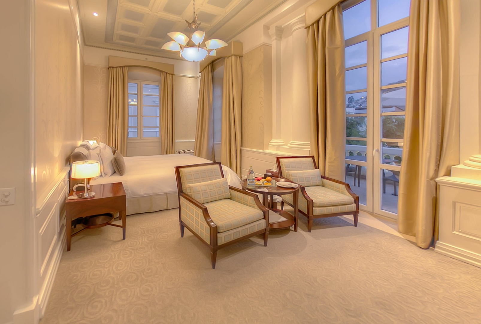 Im Inneren bietet das Hotel eine Vielzahl von hellen Räumen mit Stuckwänden, in denen sich Säulen und Arkaden mit unzähligen Blumen- und Pflanzensträußen mischen. Es gibt eine Bar im englischen Clunb-Stil mit dunklen holzgetäfelten Wänden, ein wunderbares Restaurant, in dem exquisite Sieben-Gänge-Menüs serviert werden, eine herrliche Terrasse im Obergeschoss mit Blick auf den Platz und einen schönen Innenhof mit Springbrunnen.