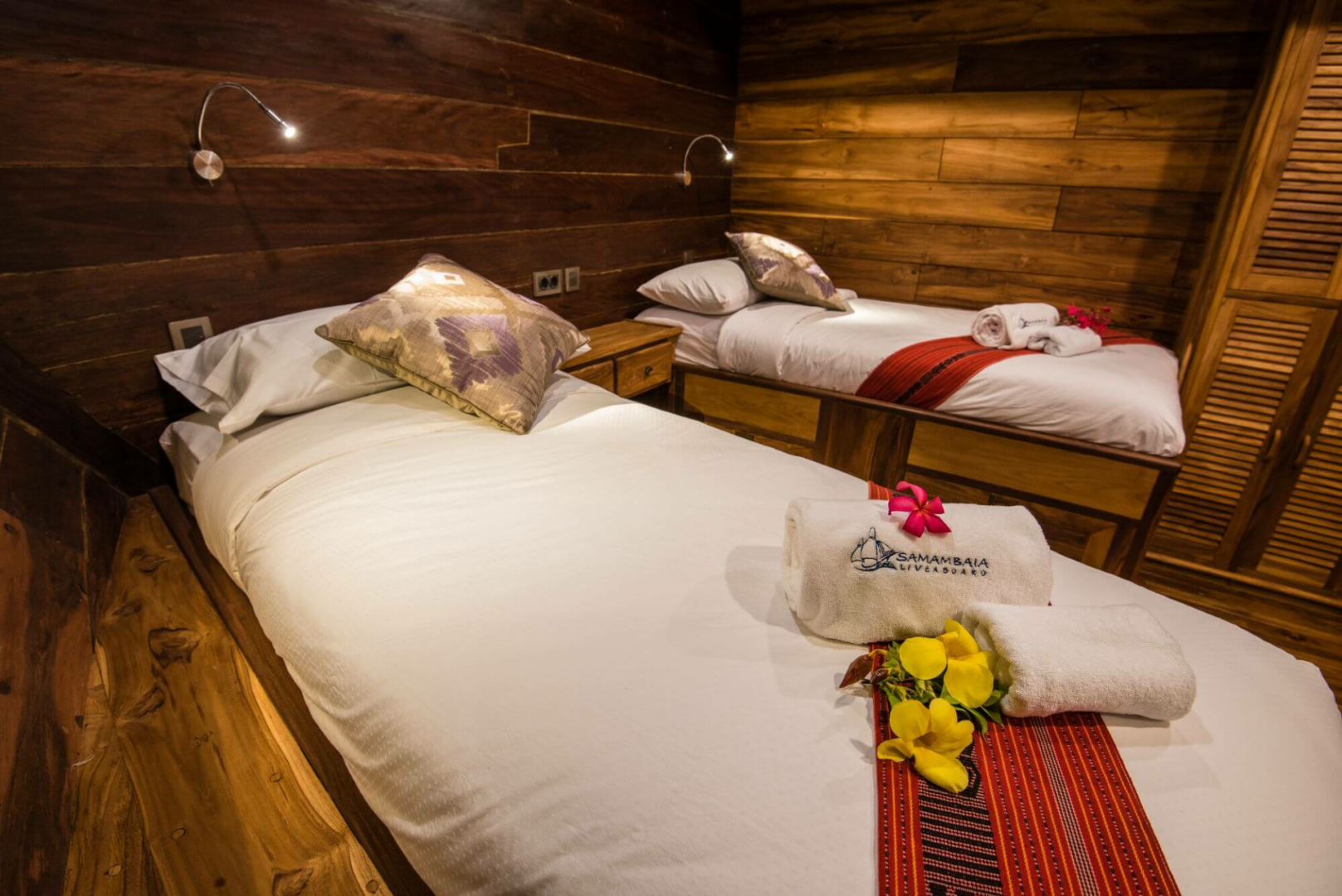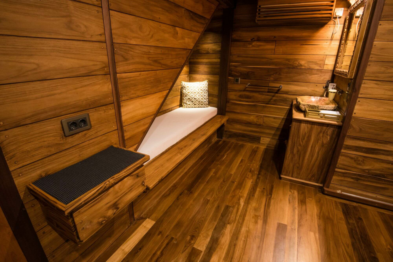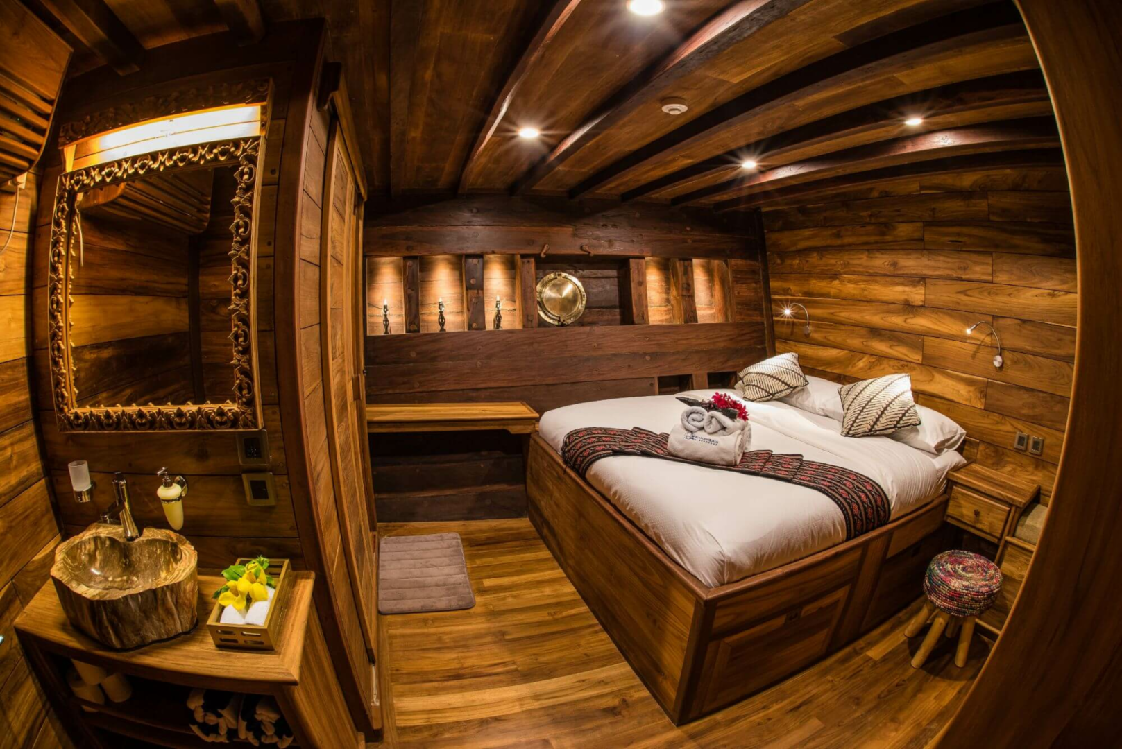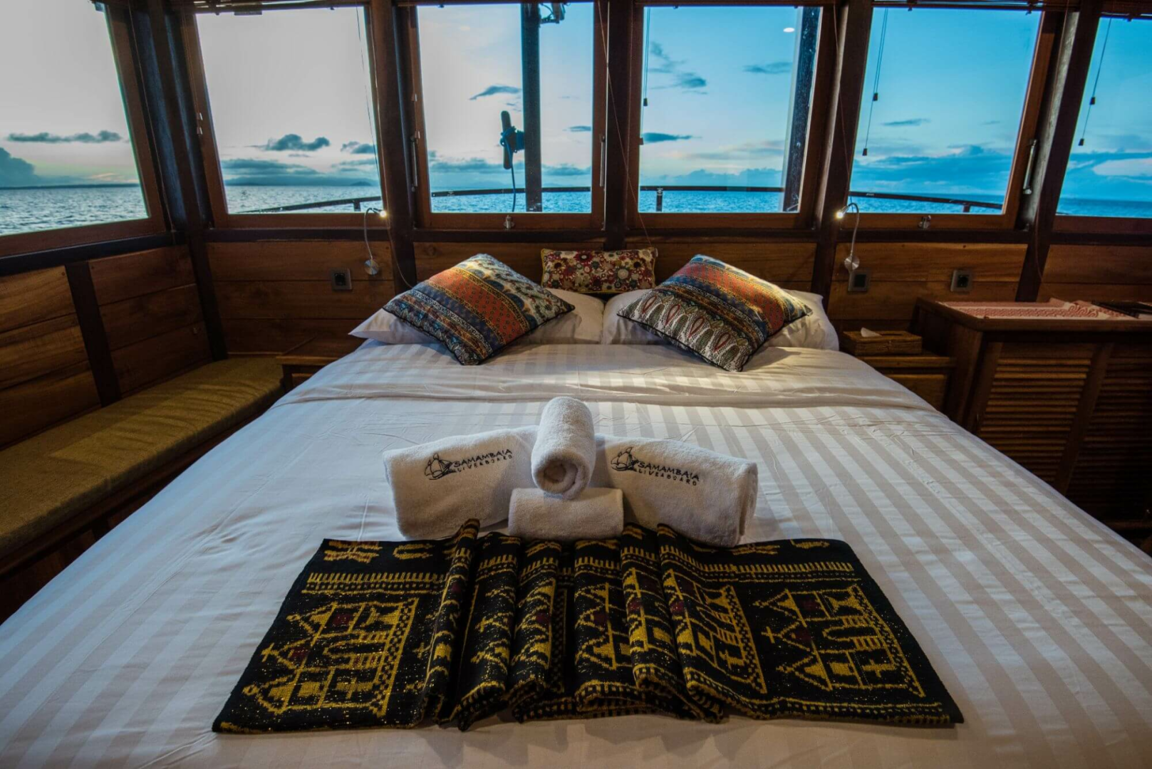Ein Gast beschrieb es einmal als 5-Sterne-schwimmende Lodge, und wir denken, dass diese Beschreibung völlig zutreffend ist. Die Unterbringung erfolgt in nur 7 Kabinen, was die gesamte Atmosphäre an Bord aufgrund der geringen Anzahl von Passagieren sehr privat und intim macht. Die klimatisierten Kabinen gehören zu den schönsten und elegantesten, die man in Raja Ampat finden wird, ohne übermäßig luxuriös zu sein, was an einem so abgelegenen Ort ohnehin fehl am Platz wäre. Alle Kabinen haben ein eigenes Bad mit Regendusche, westliche Standardtoiletten mit integriertem Bidet und Waschbecken aus fossilem Holz.