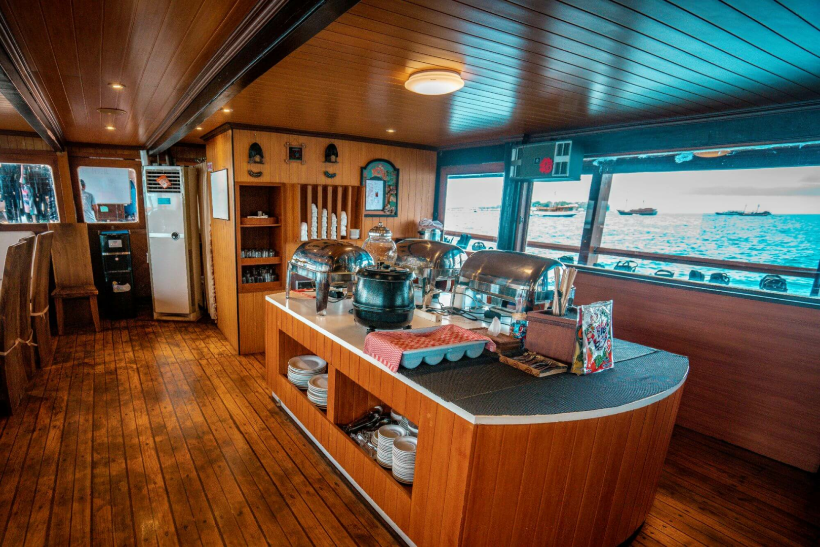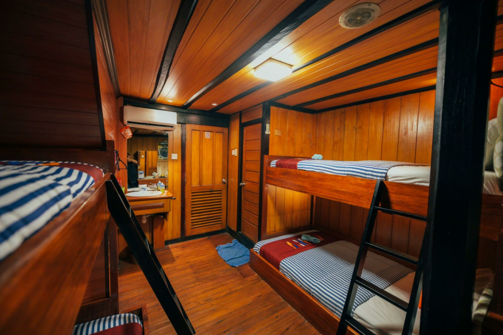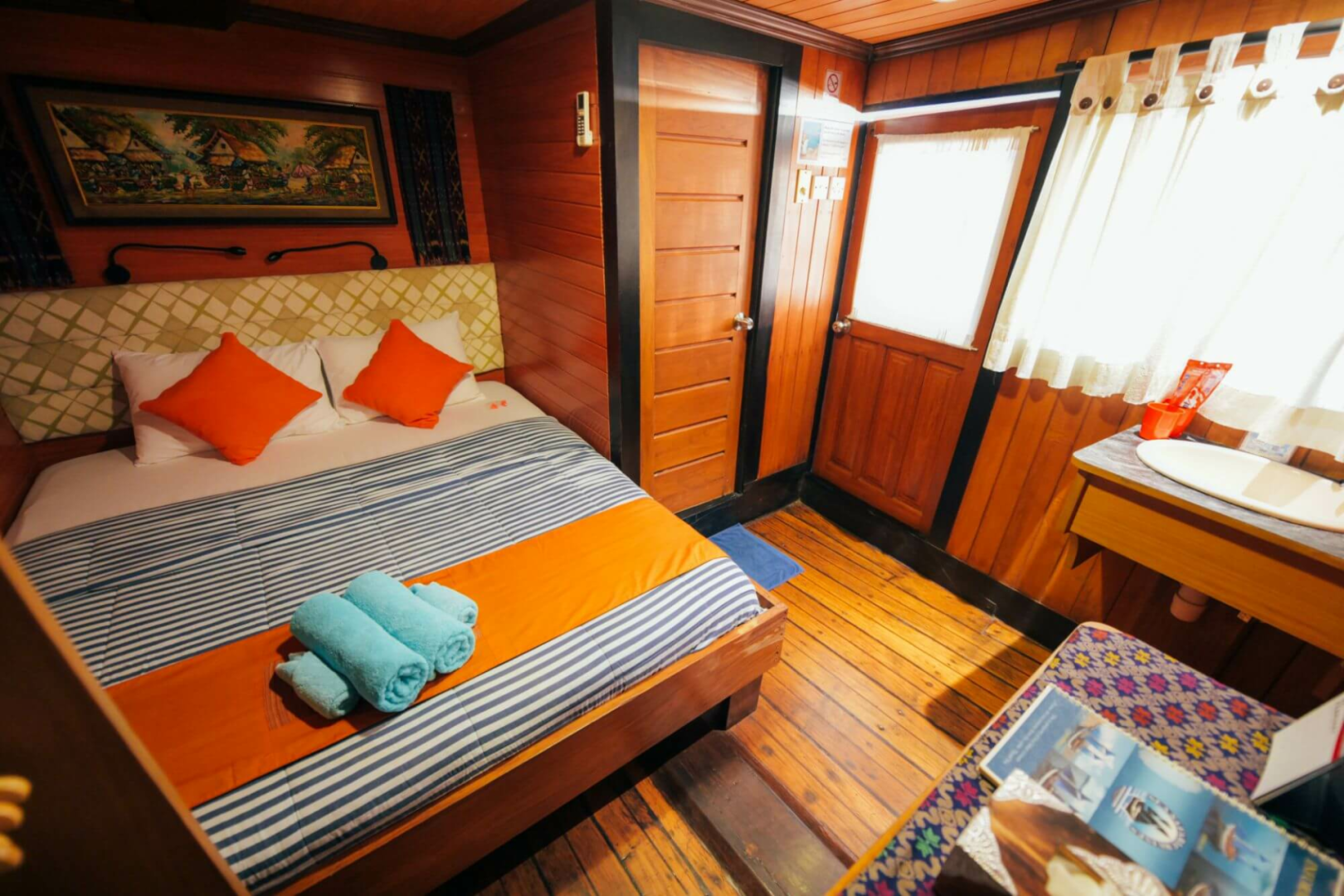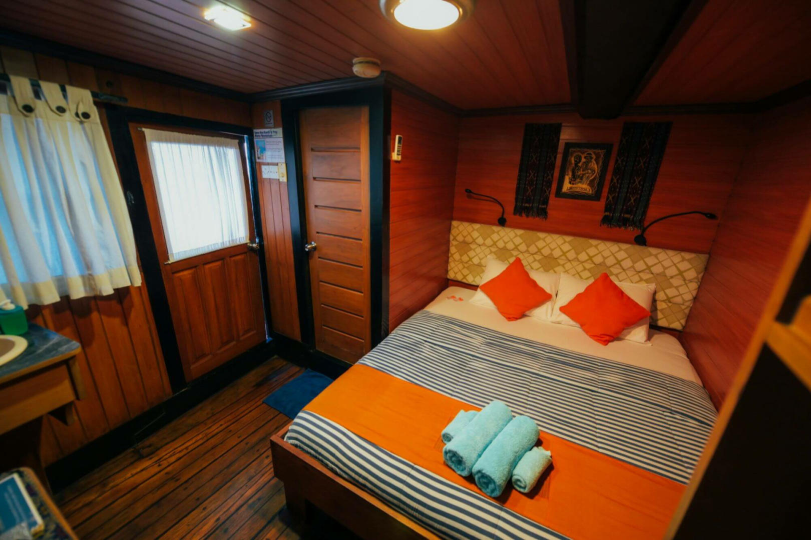 Die Taucher schlafen in zwölf blitzsauberen, etwas kleinen Kabinen mit Klimaanlage und eigenem Bad. Es gibt ein großartiges Tauchdeck, einen hervorragenden Kundenservice, großartiges Essen mit lokalem Geschmack, sehr erfahrene und unglaublich sachkundige Tauchmeister, die immer ein Lächeln auf den Lippen haben.
