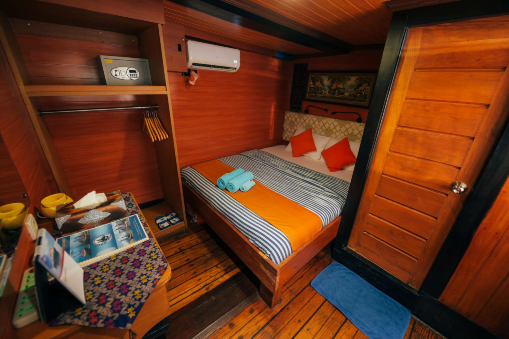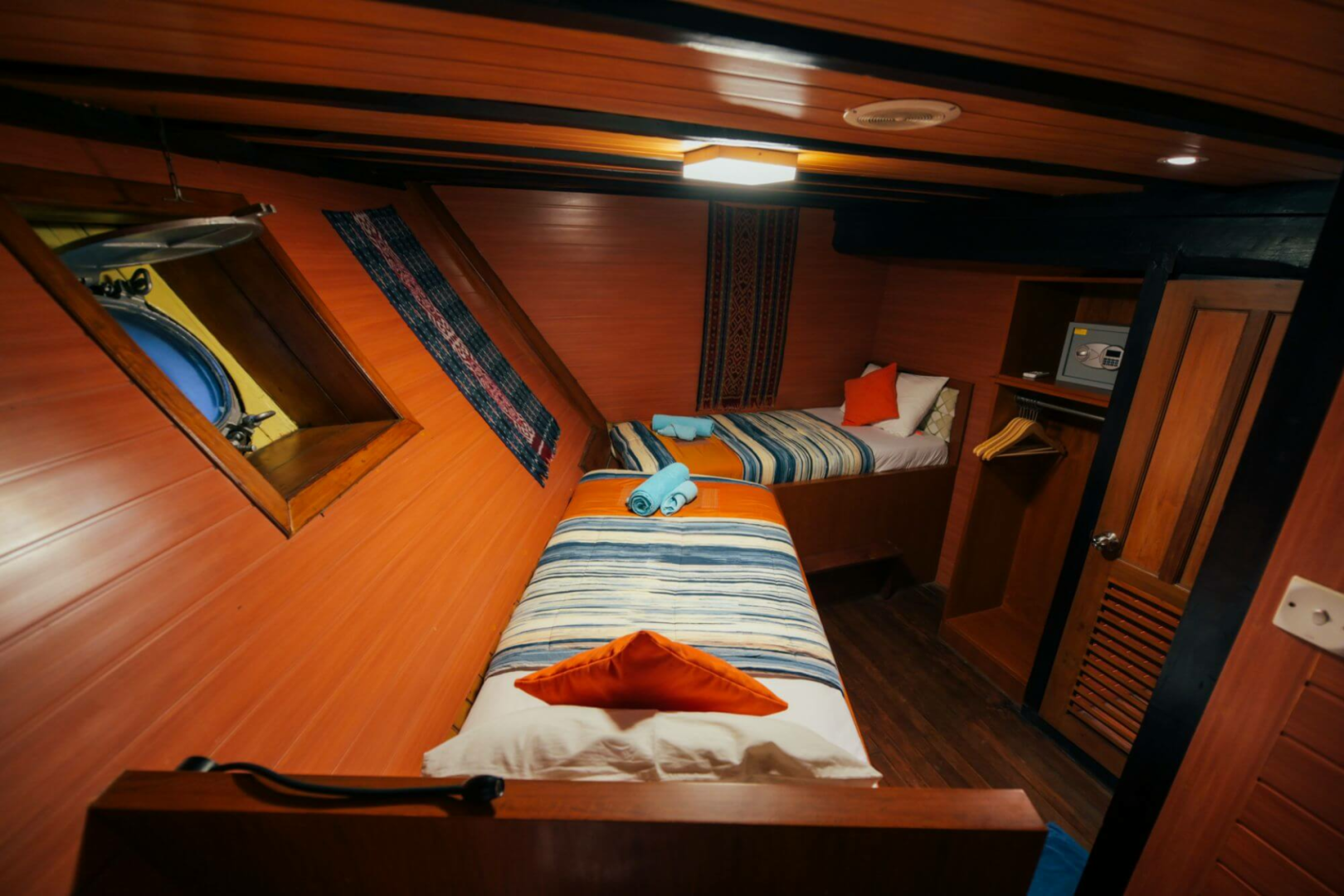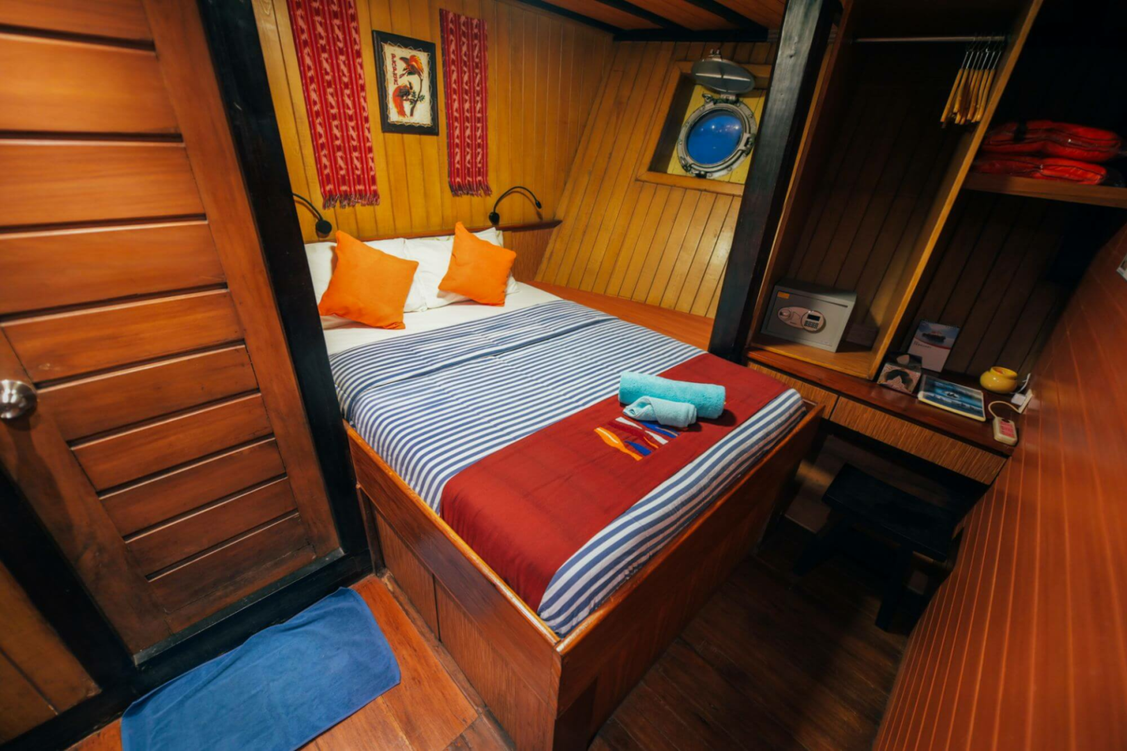 Die Taucher schlafen in zwölf blitzsauberen, etwas kleinen Kabinen mit Klimaanlage und eigenem Bad. Es gibt ein großartiges Tauchdeck, einen hervorragenden Kundenservice, großartiges Essen mit lokalem Geschmack, sehr erfahrene und unglaublich sachkundige Tauchmeister, die immer ein Lächeln auf den Lippen haben.