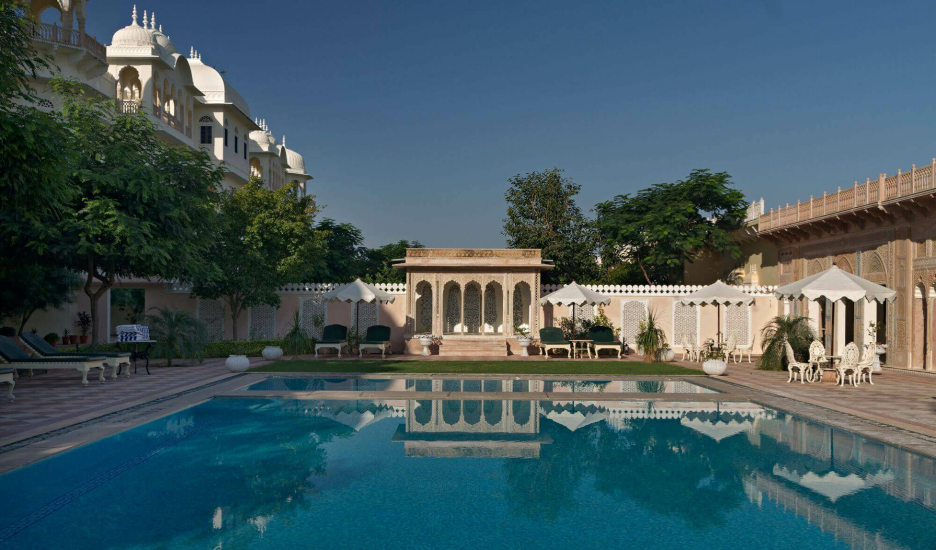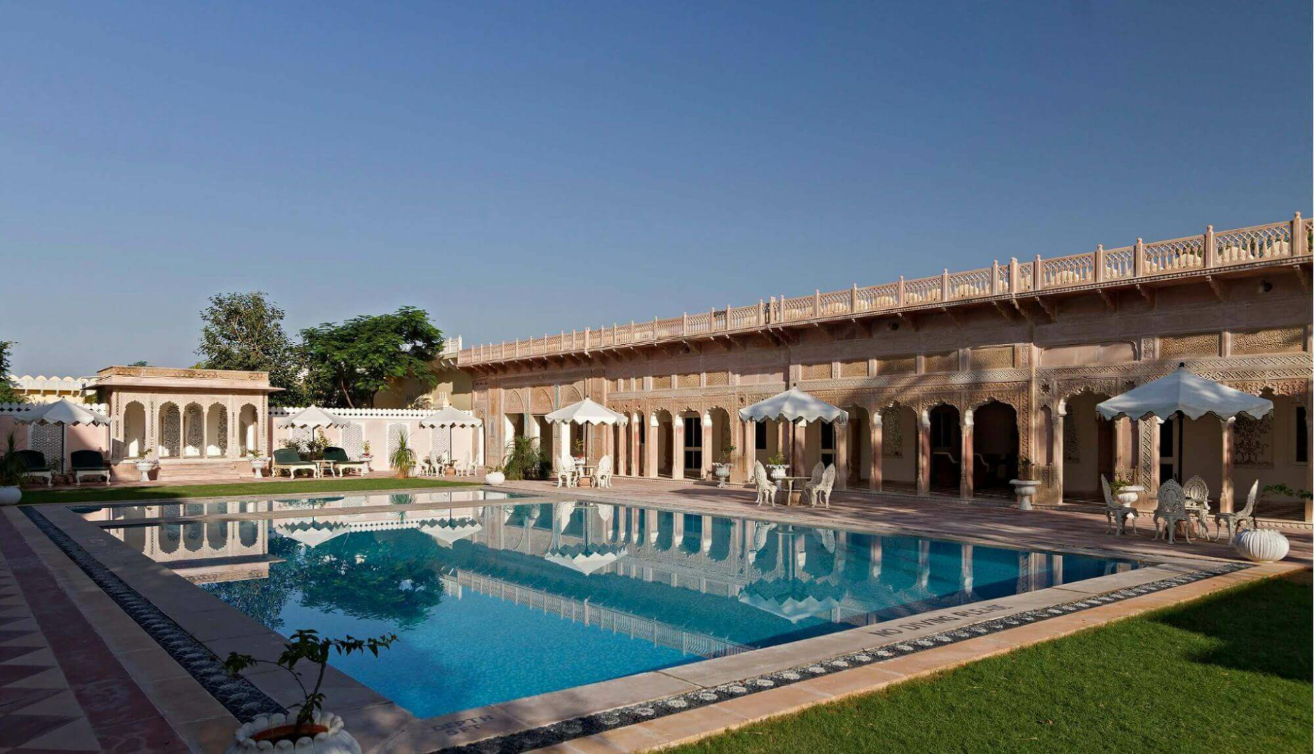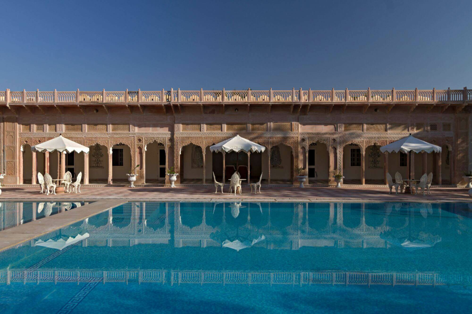 Khem Villas bei Ranthambhore ist eine wunderschön gemachte Luxus-Lodge, die konsequent ökologisch geführt wird, mit einem hervorragenden optischen Eindruck.