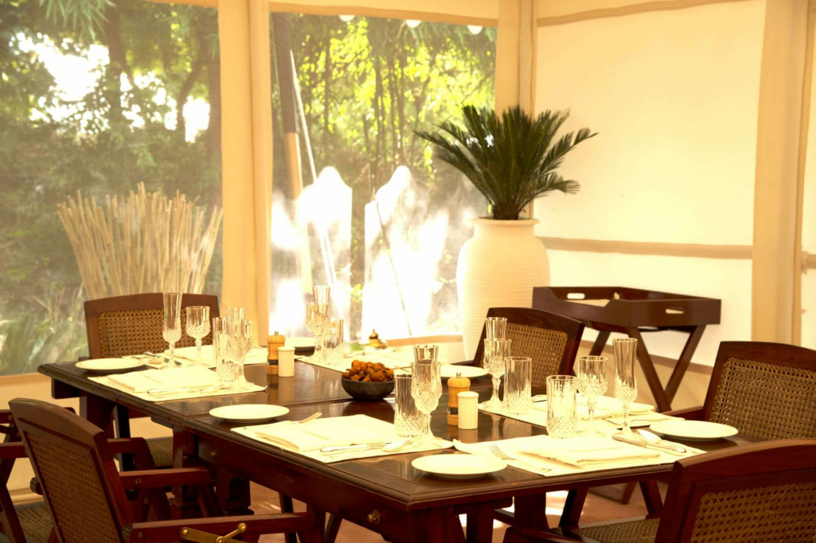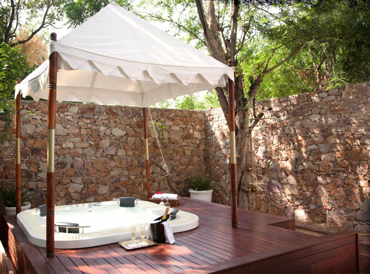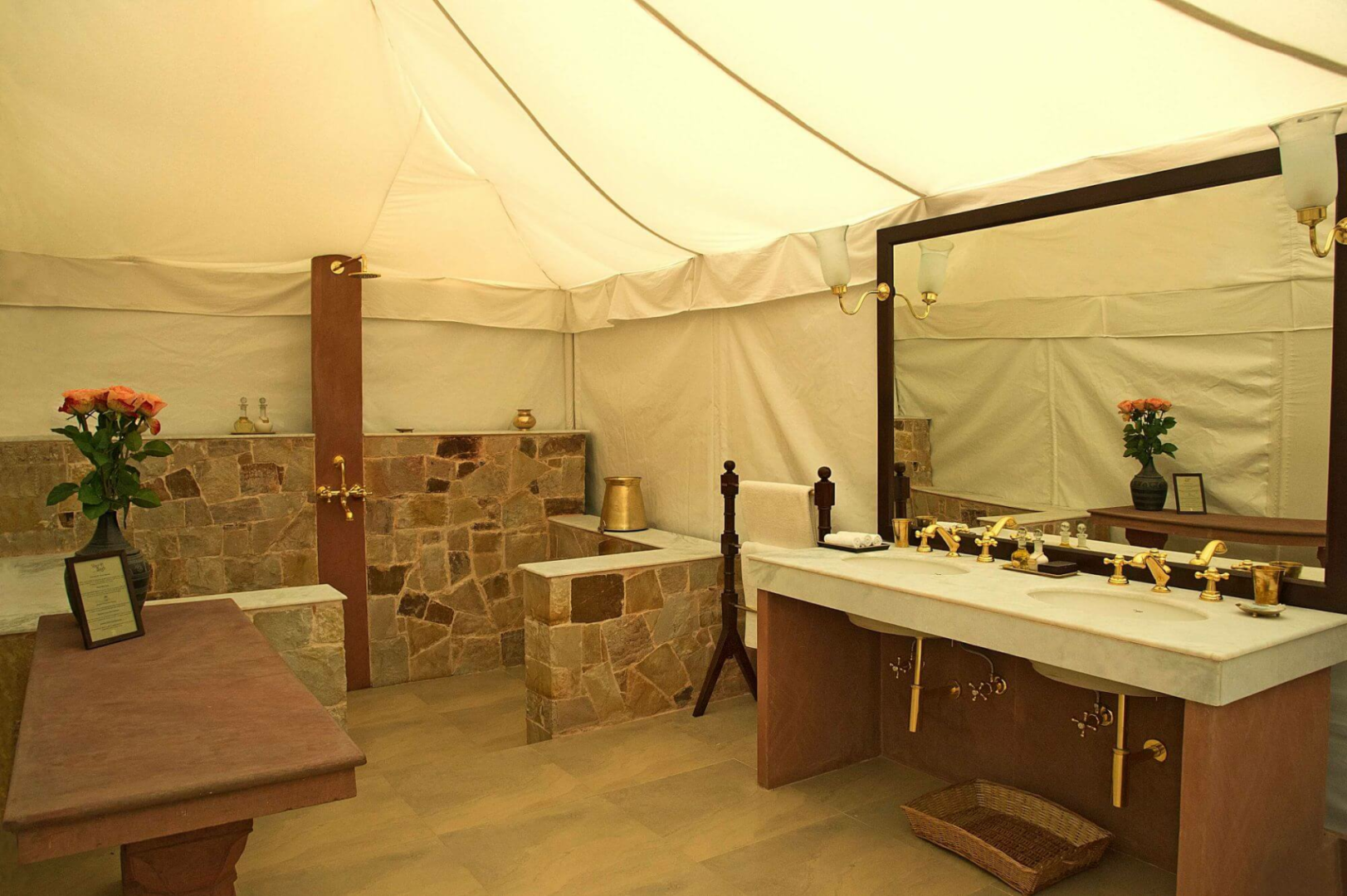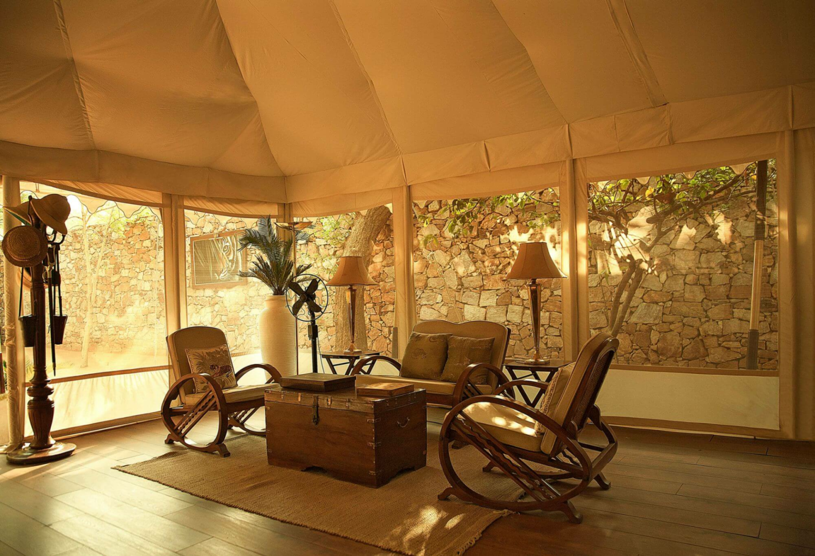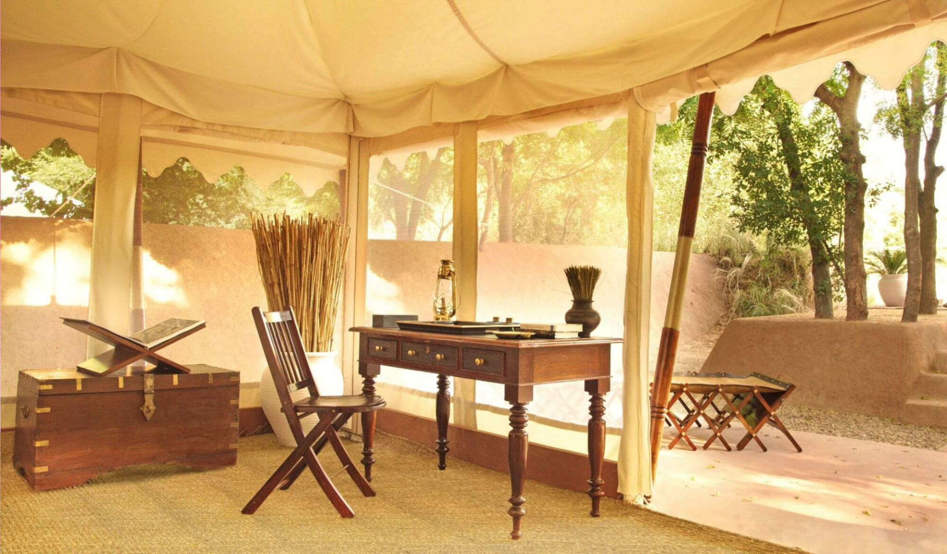 Oberoi Vanya Vilas ist eine schöne Luxus-Lodge mit 25, sehr ansprechend gestalteten Zelten, die an Komfort nicht zu schlagen sind: Möblierte Terrasse, Garten, Ankleidezimmer und freistehende Badewanne.