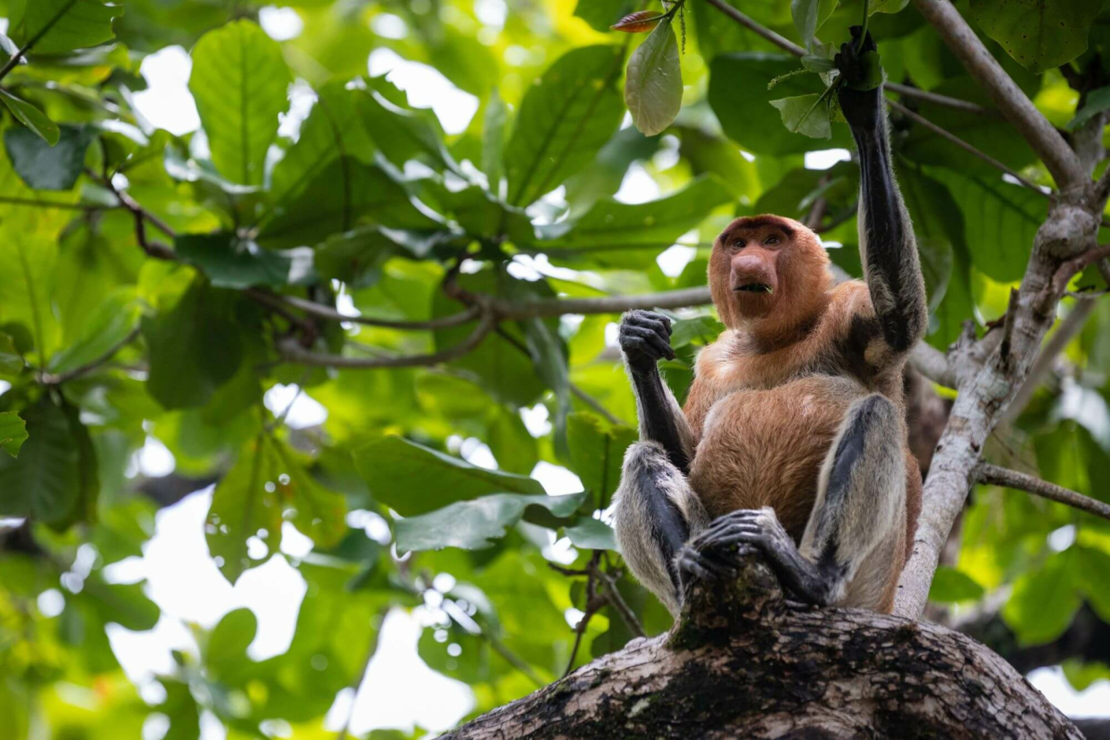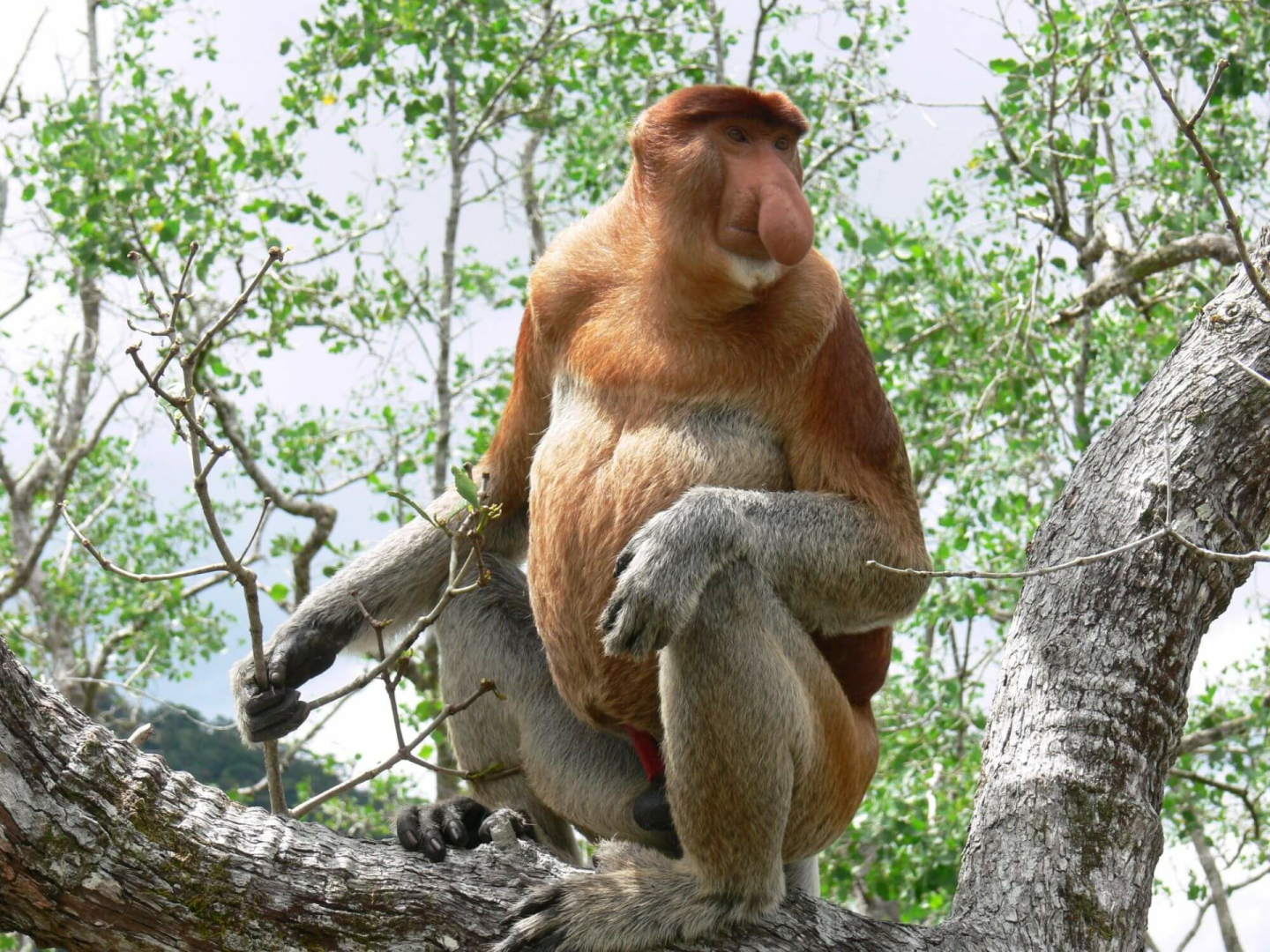 Die Begegnung mit dem sogenannten „Waldmenschen“ ist eine der bewegendsten Erfahrungen jeder Reise nach Borneo. Die rot-braun gefärbten Orang-Utans kommen nur hier in Borneo und in Sumatra vor. Sie durchwandern in kleinen Familien die Urwälder, bauen sich Schlafnester und ernähren sich von Früchten und Blättern. Mit ihrem ausgeprägten Kehlsack, hängenden Backentaschen und langen Bärten sind insbesondere die männlichen Tiere imposante Gestalten, die bis zu 90 kg schwer werden und damit erheblich mehr als die Weibchen wiegen. Ihr Paarungsruf ist bis zu einer Distanz von einem Kilometer hörbar.
