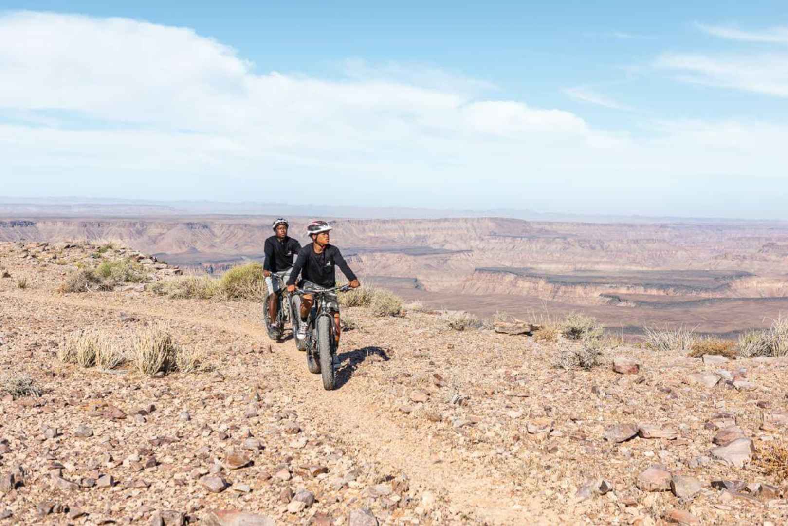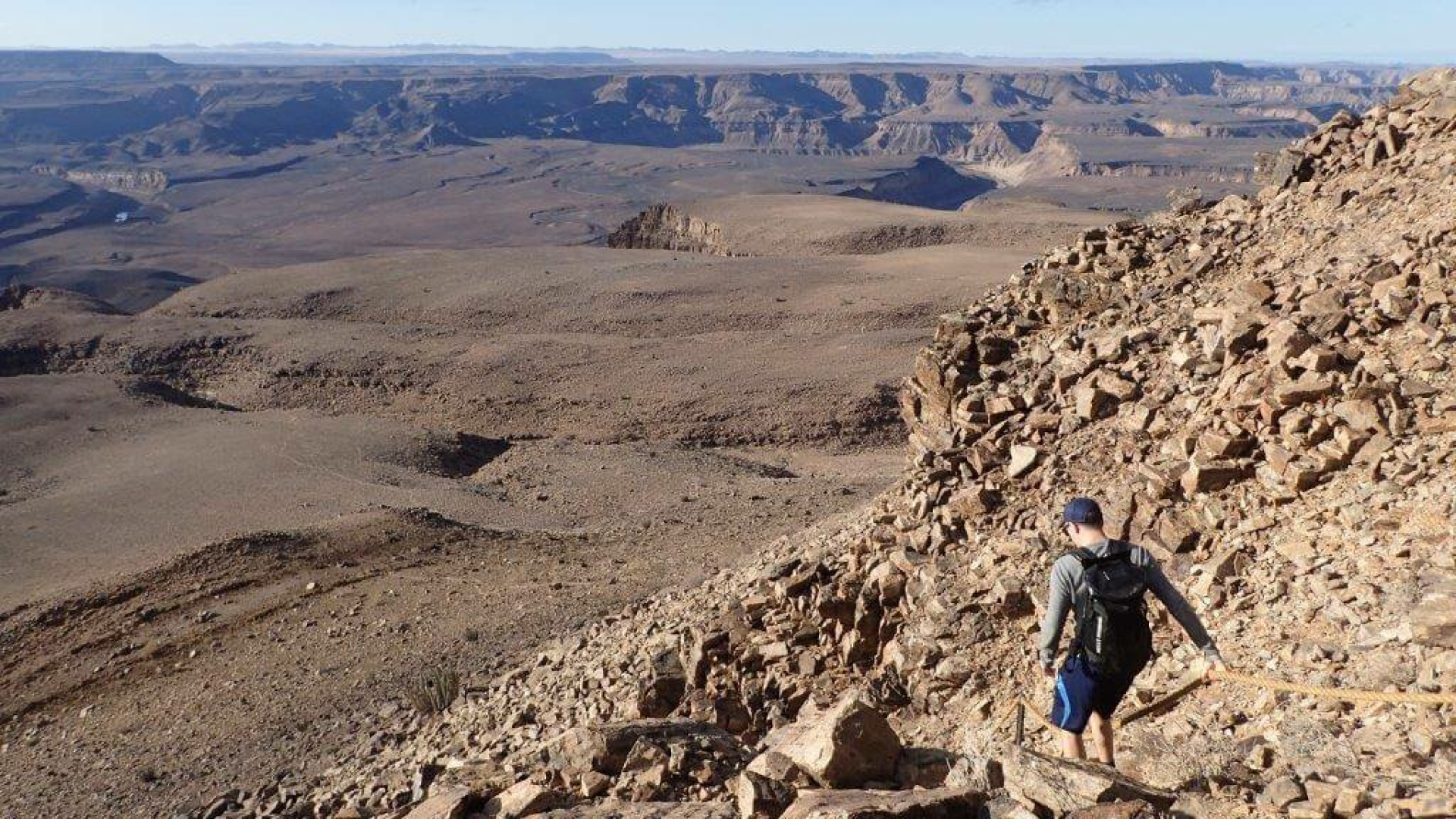 Erst wenige hundert Meter vor dem Canyonrand wird der Canyon sichtbar. Ein berauschender Anblick, nichts für Schwindelfreie. Die weitläufige Felslandschaft bricht in eine Reihe spektakulärer Klippen auf, die vom Fish River geformt werden, der sich über einen halben Kilometer unterhalb zwischen Felsblöcken hindurchschlängelt.An verschiedenen Aussichtspunkten kann man in die Schluchten und Tiefen hinab sehen, am besten tut man in verschiedenen Tageszeiten, um das dramatische Licht- und Farbenspektakel zu bewundern: vom blendend hellen Tönen kurz nach Sonnenaufgang, über wechselnden Licht- und Schattenspielen im Laufe des Tages bis hin zum hellroten Tönen in Richtung Sonnenuntergang.