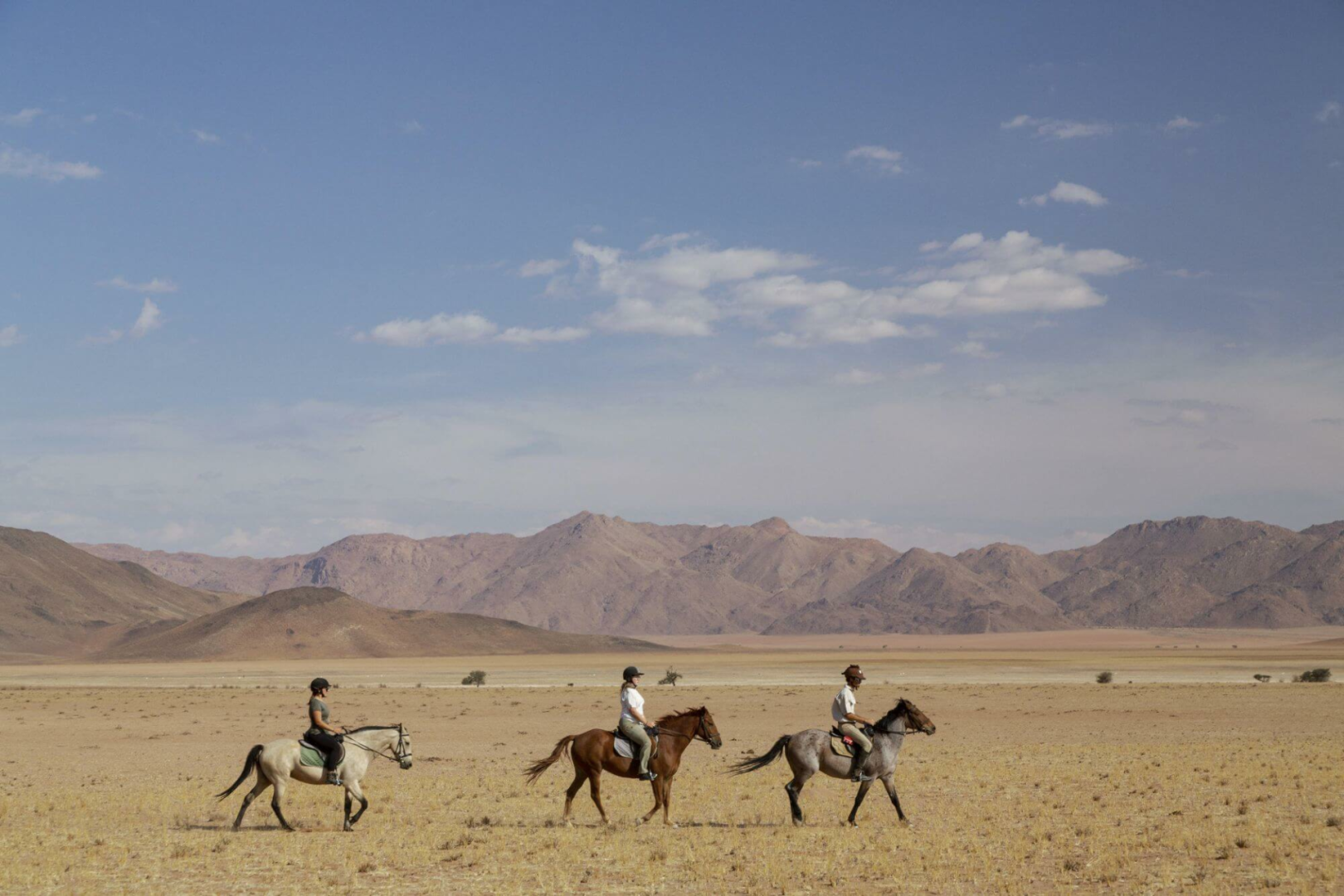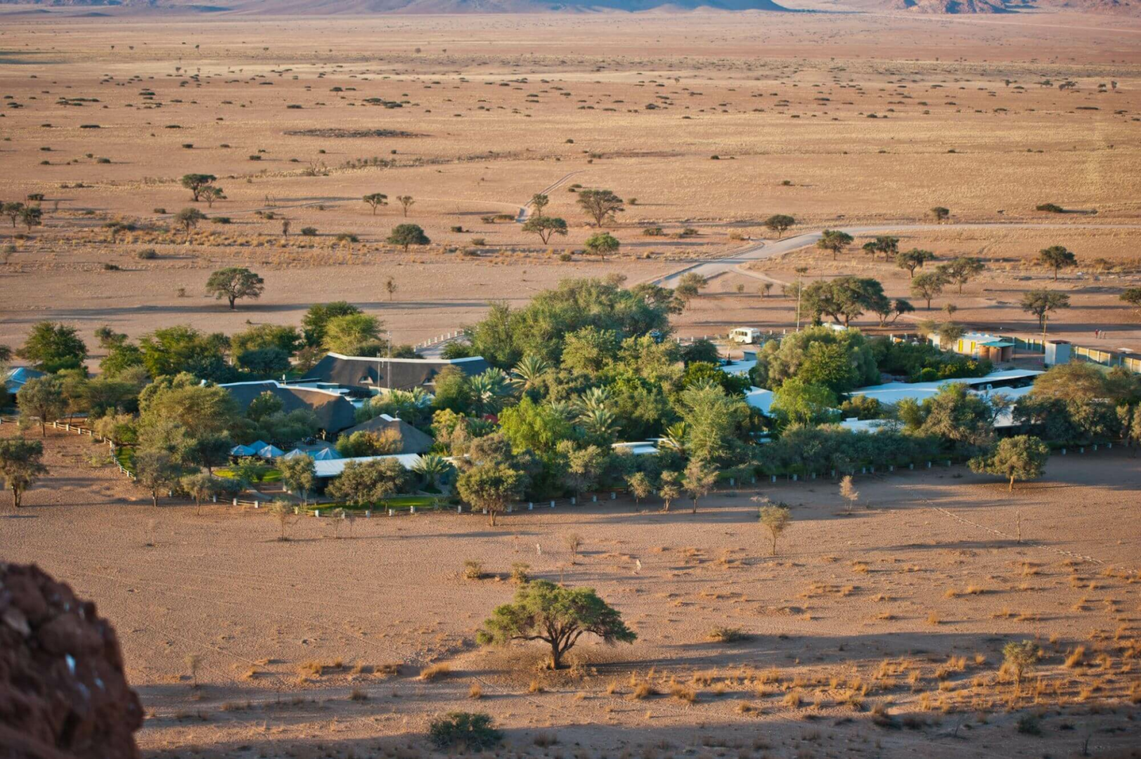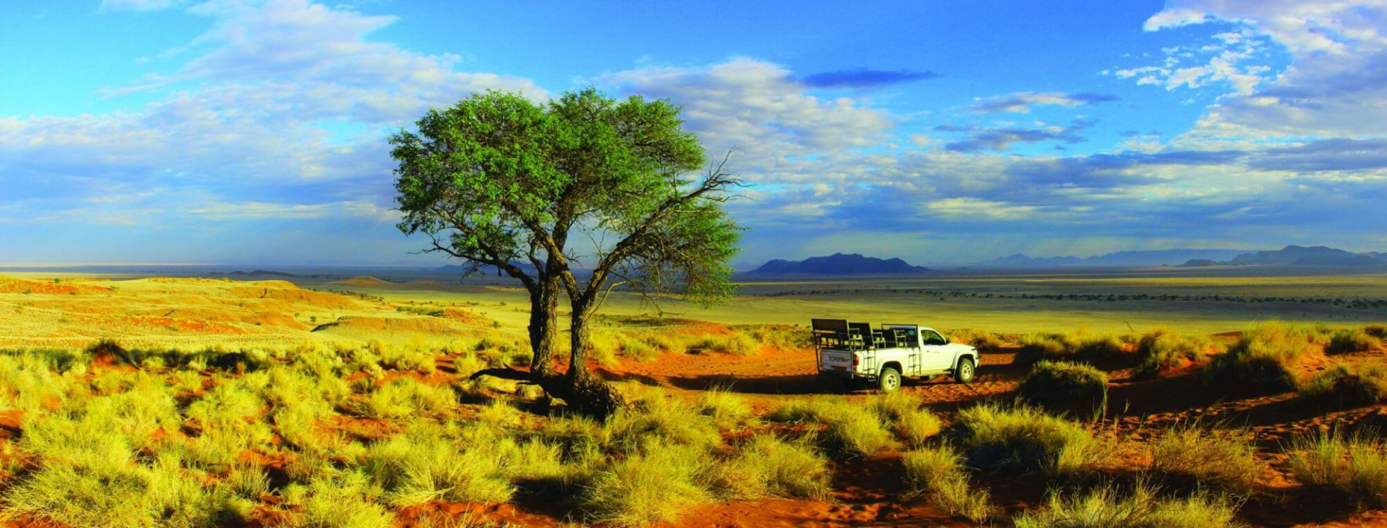 Die Kalahari, Afrikas erster multinationaler Park an den Grenzen zwischen Namibia, Botswana und Südafrika, erstreckt sich über große Teile Süd- und Zentral-Namibias. Sie ist eine zeitlose Landschaft aus roten Dünen, die mit einem Teppich aus Bäumen, Büschen, Gräsern bedeckt sind und dient oft als Raststation, um die lange Fahrt zwischen dem Fisch River Canyon und Windhoek zu unterbrechen. Die sanft geschwungene Hügellandschaft hier ist meist mit niedrig wachsenden Büschen und verkümmerten Bäumen bewachsen. Die Flussläufe sind in der Regel dicht bewachsen und weisen oft dichte, höhere Bestände von Kameldornbäumen auf.