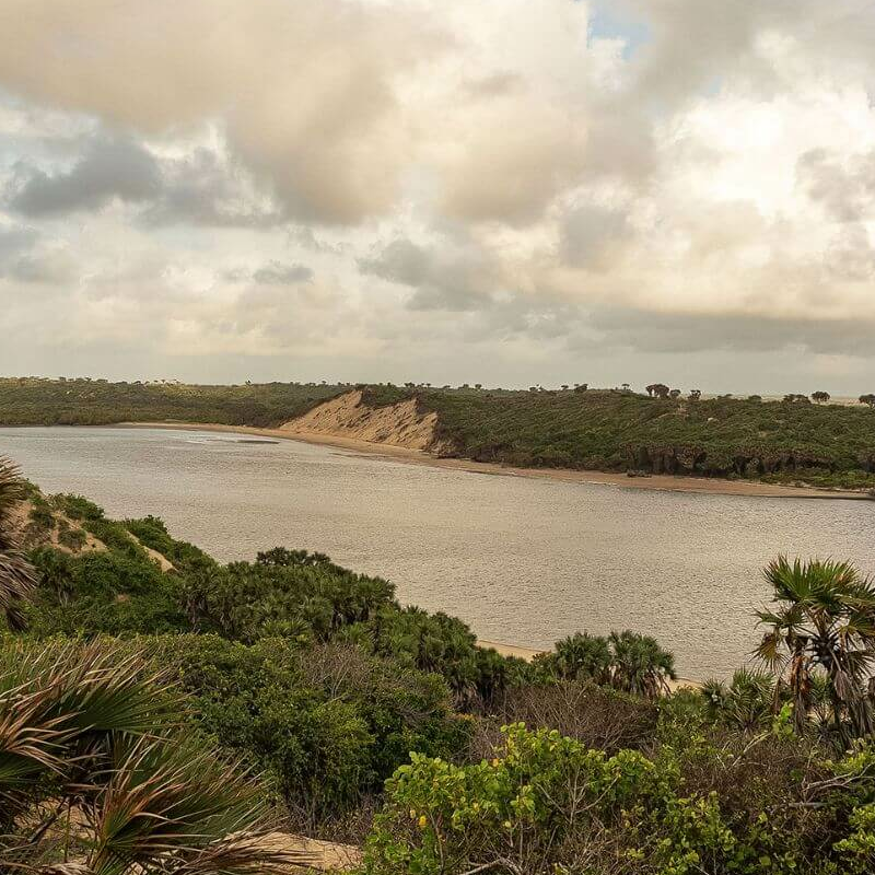 Das Dela Dunes liegt hoch über dem einzigartigen Ökosystem des Tana-Flussdeltas nördlich von Malindi, reich an Vögeln, Krokodilen und Flusspferden, inmitten riesiger Sand...