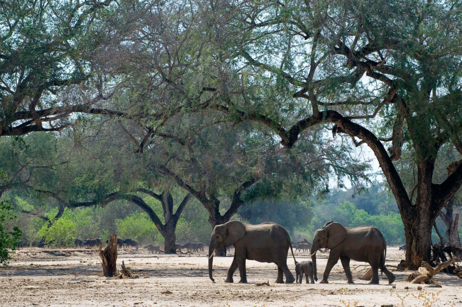 Während der Regenzeit zieht sich ein Großteil der Wildtiere an die Berge zurück. Doch sobald die Trockenzeit Einzug hält und die Tümpel im Busch austrocknen, kehren die Tiere an die permanenten Wasserquellen zurück. Je weiter die Trockenzeit voranschreitet, desto größer werden die Herden. Büffel, Zebras, Kudus, Elenantilopen und Impalas konzentrieren sich in großen Zahlen. Am Fluss tummeln sich die Nilpferde und riesige Krokodile sonnen sich auf dem Ufer. Besonders berühmt ist Mana wegen seiner überdurchschnittlich großen Elefantenbullen mit imposanten Zähnen.