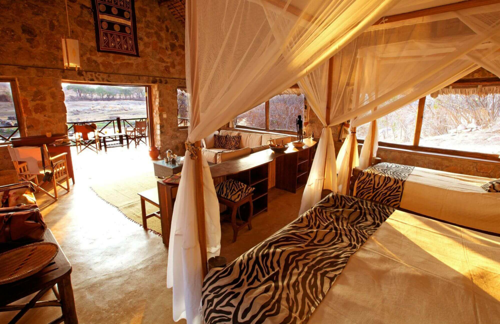 Mit ca. zwanzig Chalets ist die Ruaha River Lodge die größte und auch die älteste aller Lodges im Ruaha-Nationalpark. Die Chalets wurden inzwischen renoviert, sind sehr großzügig geschnitten und blicken alle auf den Ruaha-Fluss, wo man das gelegentliche Kommen und Gehen der Tiere von der eigenen Terrasse beobachten kann. Das Essen in Buffet-Form wird entweder direkt am Flussufer serviert oder in einem auf einer Anhöhe gelegenen Restaurant.