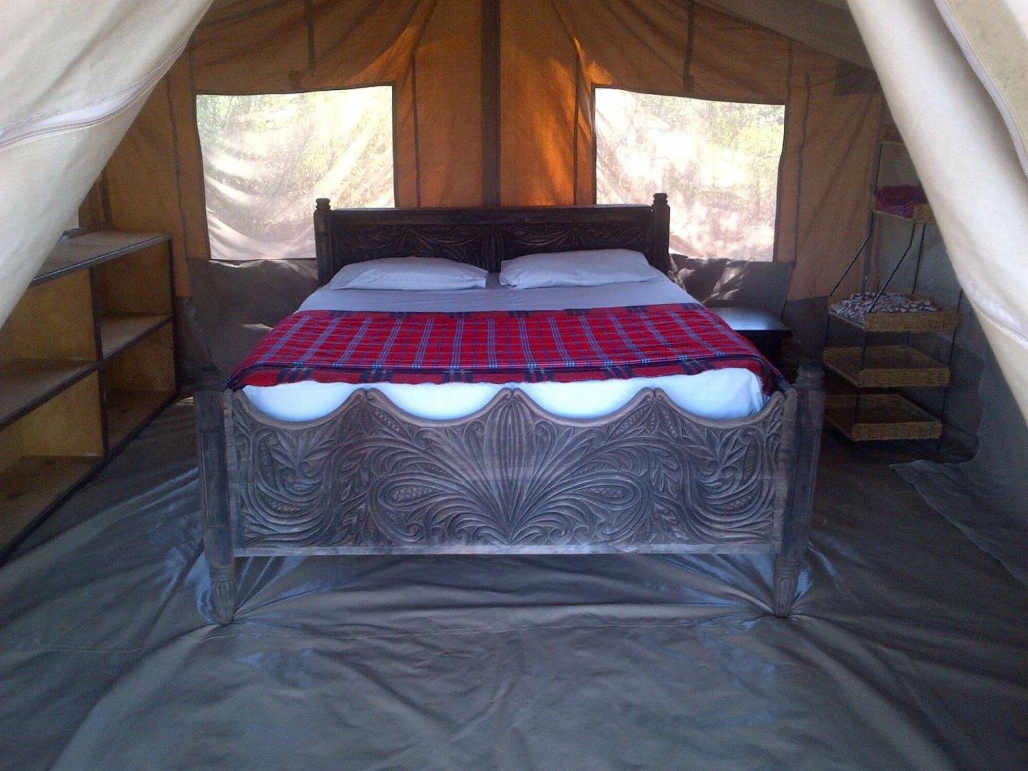 Die Gäste werden in sechs sehr einfachen Zelten ohne Schickschnack untergebracht. Die Zelte wurden direkt auf dem Boden errichtet und haben eine kleine Veranda mit Bänken und Tisch. Im Inneren sind die Zelte mit nur einem oder zwei Betten äußerst simpel eingerichtet. Ein privates Bad mit Buschdusche und Toilette gibt es im jeden Zelt.