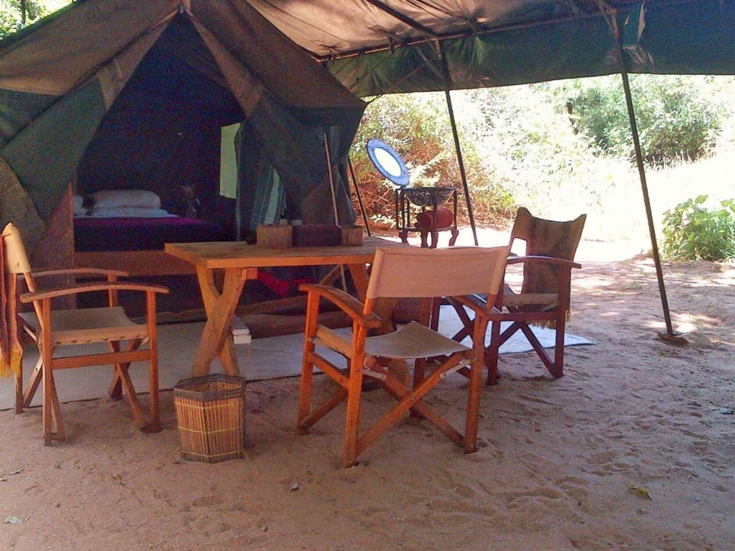 Herzstück des Camps ist die zentral liegende offene Boma unter Reetdach mit einem großen Tisch aus Massivholz und handgefertigten sehr originellen Stühlen für die abendlichen Mahlzeiten. Das Camp ist sehr rustikal, alles direkt auf dem nackten sandigen Boden und strahlt einen sehr ungezwungenen Charakter aus. Gäste werden von den wiederholten Besuchern der Tierwelt direkt im Camp regelrecht begeistert sein. Eine Feuerstelle mit Blick auf den Fluss gibt es natürlich auch.