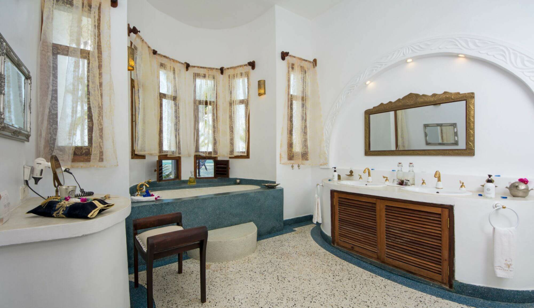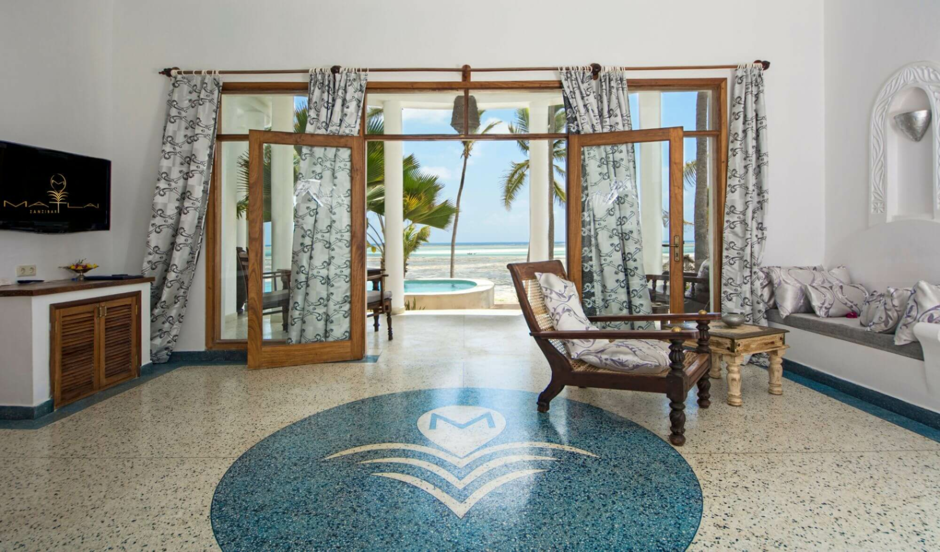 Matlai wurde im Stil einer Villenanlage konzipiert mit zwei großen Villen mit jeweils vier und zwei großen Zimmern von 50-bis 70 qm, die einzeln gebucht werden können. Von jedem Zimmer hat man einen fantastischen Meerblick. Alle Zimmer haben große Balkone, sehr aufwendig gestaltete Bäder, Ankleidebereiche, Schreibtische, Schminktische, Klimaanlage, Ventilator, Moskitonetz und Safes. Viele kleinen liebevollen Details, handgefertigte Möbel, die aufwendig aufgearbeiteten Holzfenster im sansibari Stil, die frei stehenden Waschbecken aus Stein, verleihen die Räumlichkeiten viel Originalität.