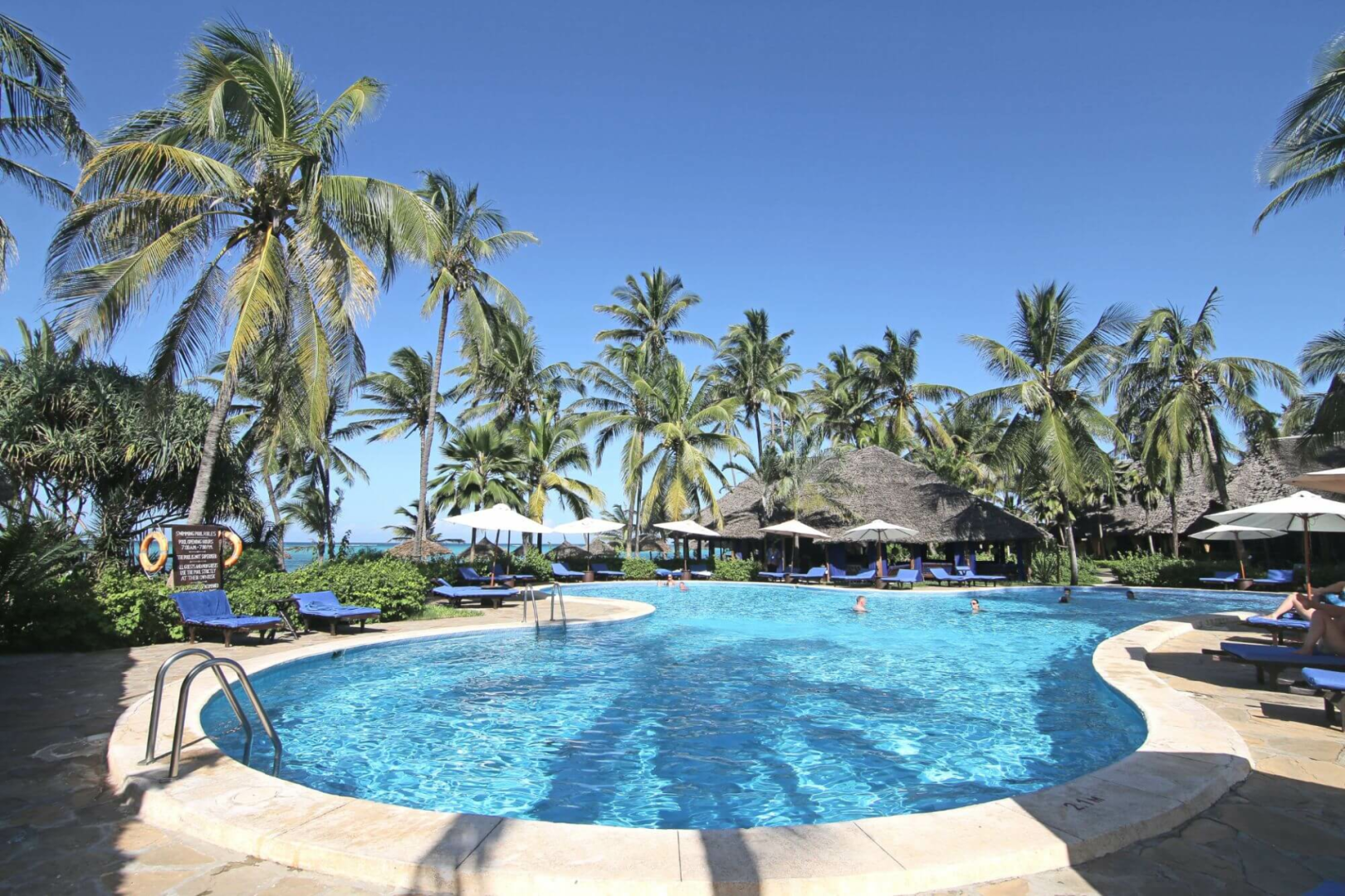 Unsere Empfehlung für Freunde von größeren Resorts ist das Breezes Beach Club in der mittleren Ostküste Sansibars beim Ort Bwejuu. Hier findet man einen herrlichen weißen von Palmen eingerahmten Sandstrand, der kontinuierlich sich für 20 km erstreckt. Die Lagune ist wunderbar türkis und hat einen Riff 1 km vor der Küste.