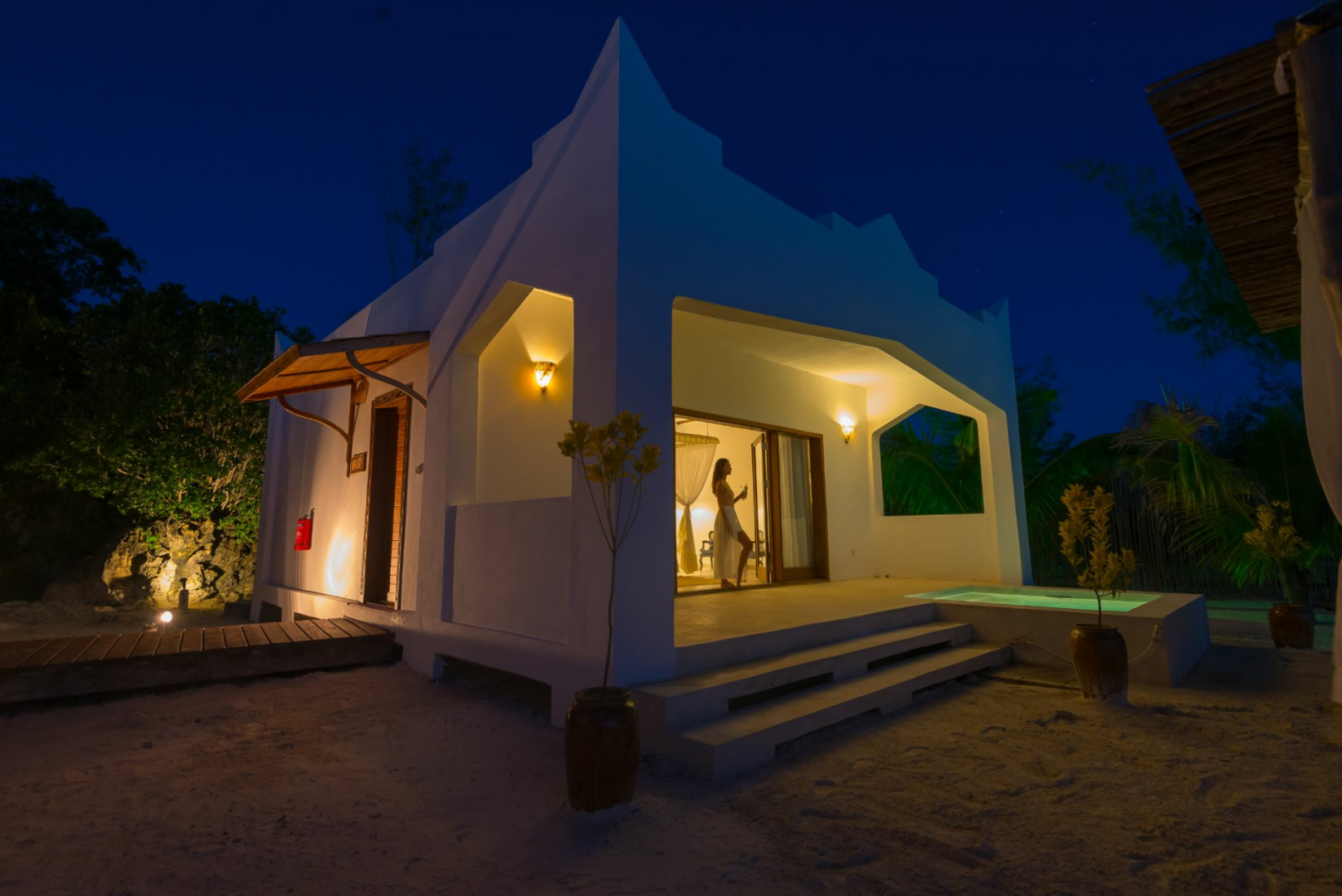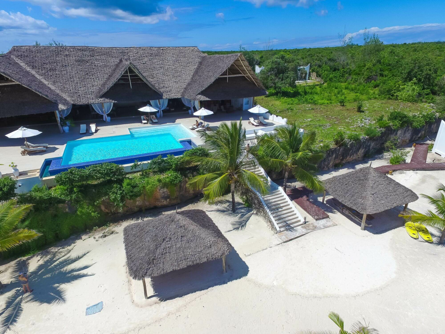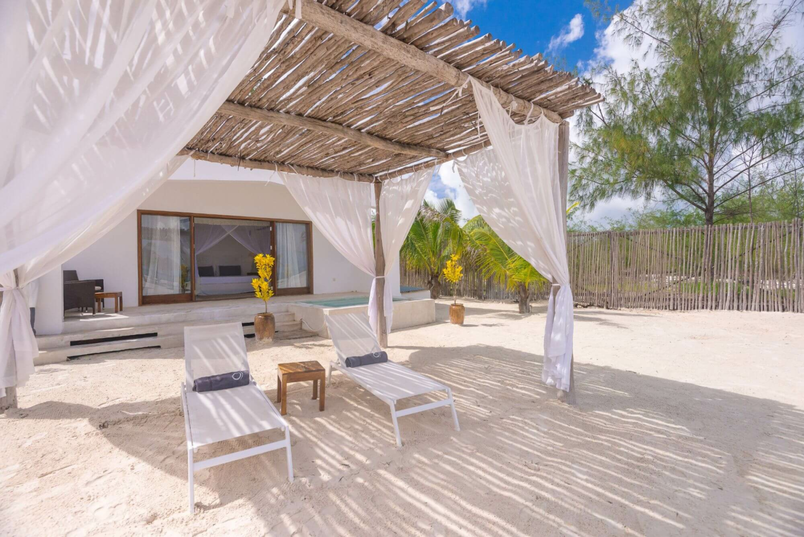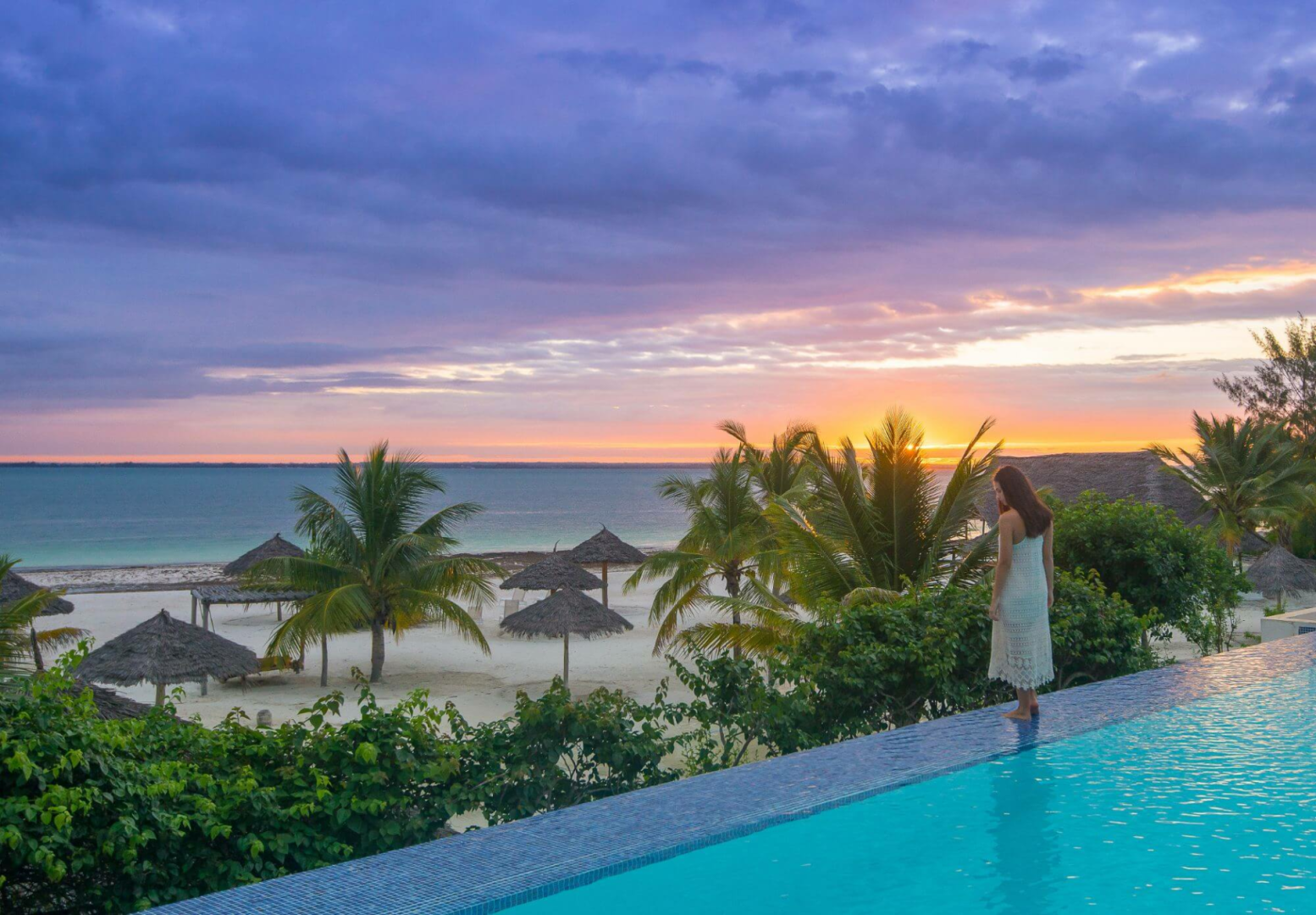 Vielleicht das, was uns vom Kono Kono am meisten gefällt, ist seine recht abgeschiedene Lage inmitten eines Tropenwalds mit Blick auf die Chwaka-Bucht. Tatsächlich ist das Kono Kono eine der wenigen Lodges an Sansibars Ostküste, wovon Gäste auf die untergehende Sonne blicken können. Gleich hinter den Sonnenschirmen und Liegen am puderzuckerweißen Strand liegt die Hauptlodge mit der wunderschöne Infinity-Pool. Die Hauptlodge, im wundervollen, stilvollen minimalistischen, modernen Stil unter Reetdach gehalten ist, äußerst angenehm gestaltet und lädt zum Verweilen ein.