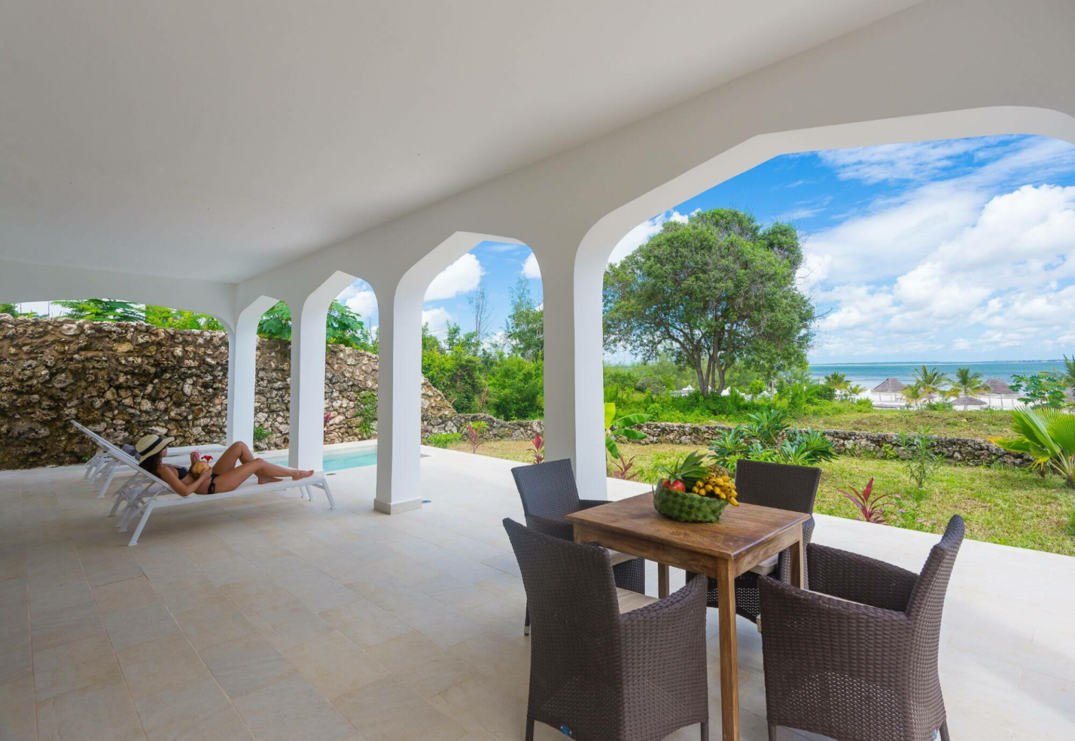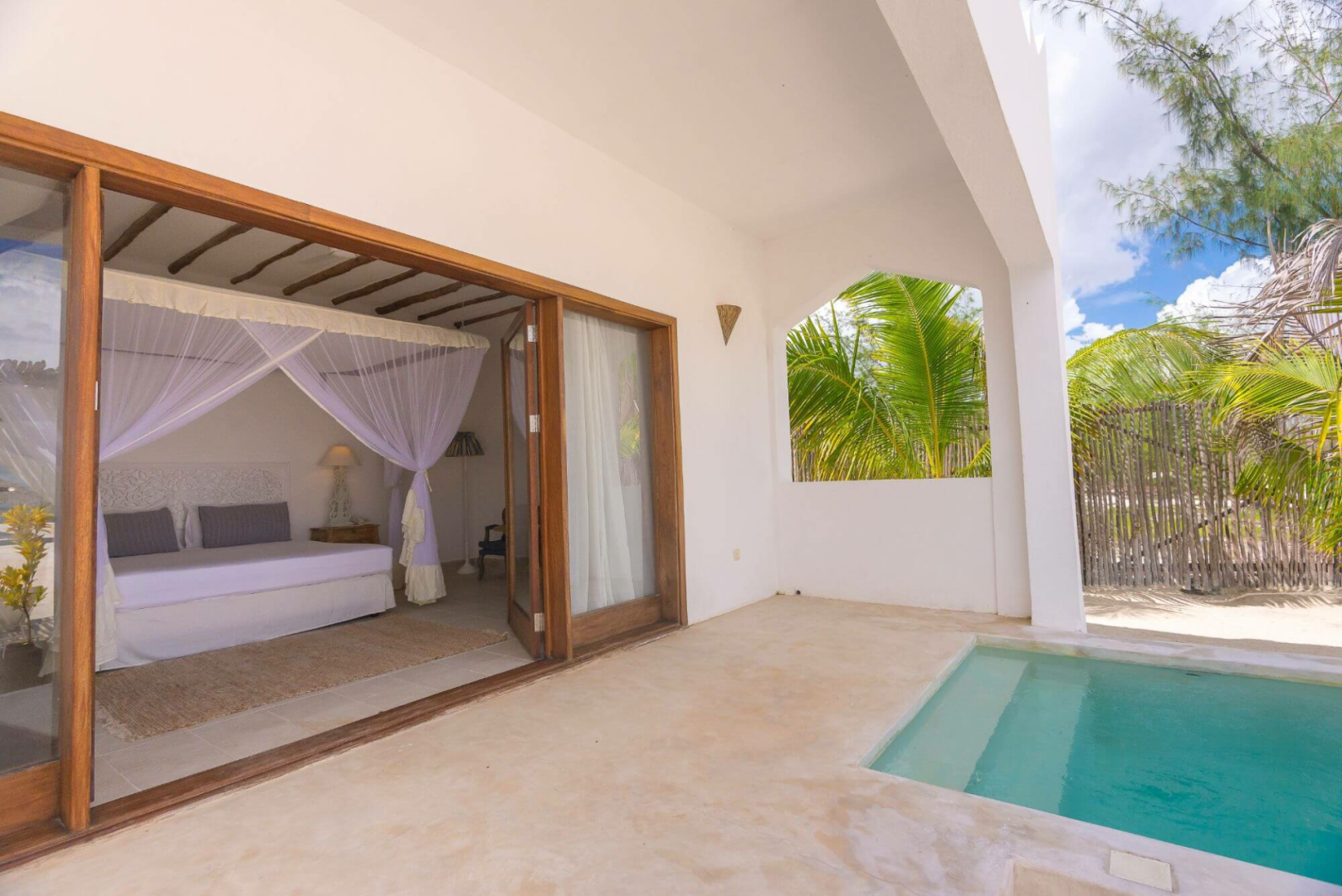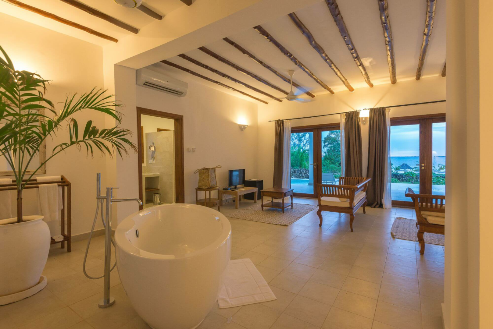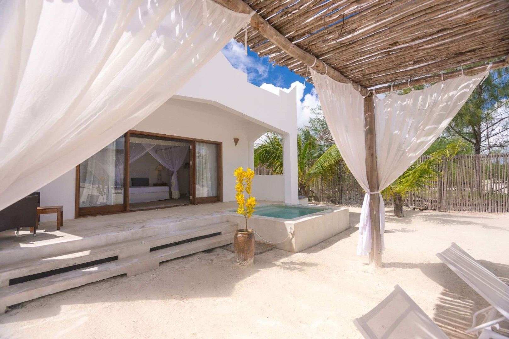 Vielleicht das, was uns vom Kono Kono am meisten gefällt, ist seine recht abgeschiedene Lage inmitten eines Tropenwalds mit Blick auf die Chwaka-Bucht. Tatsächlich ist das Kono Kono eine der wenigen Lodges an Sansibars Ostküste, wovon Gäste auf die untergehende Sonne blicken können. Gleich hinter den Sonnenschirmen und Liegen am puderzuckerweißen Strand liegt die Hauptlodge mit der wunderschöne Infinity-Pool. Die Hauptlodge, im wundervollen, stilvollen minimalistischen, modernen Stil unter Reetdach gehalten ist, äußerst angenehm gestaltet und lädt zum Verweilen ein.