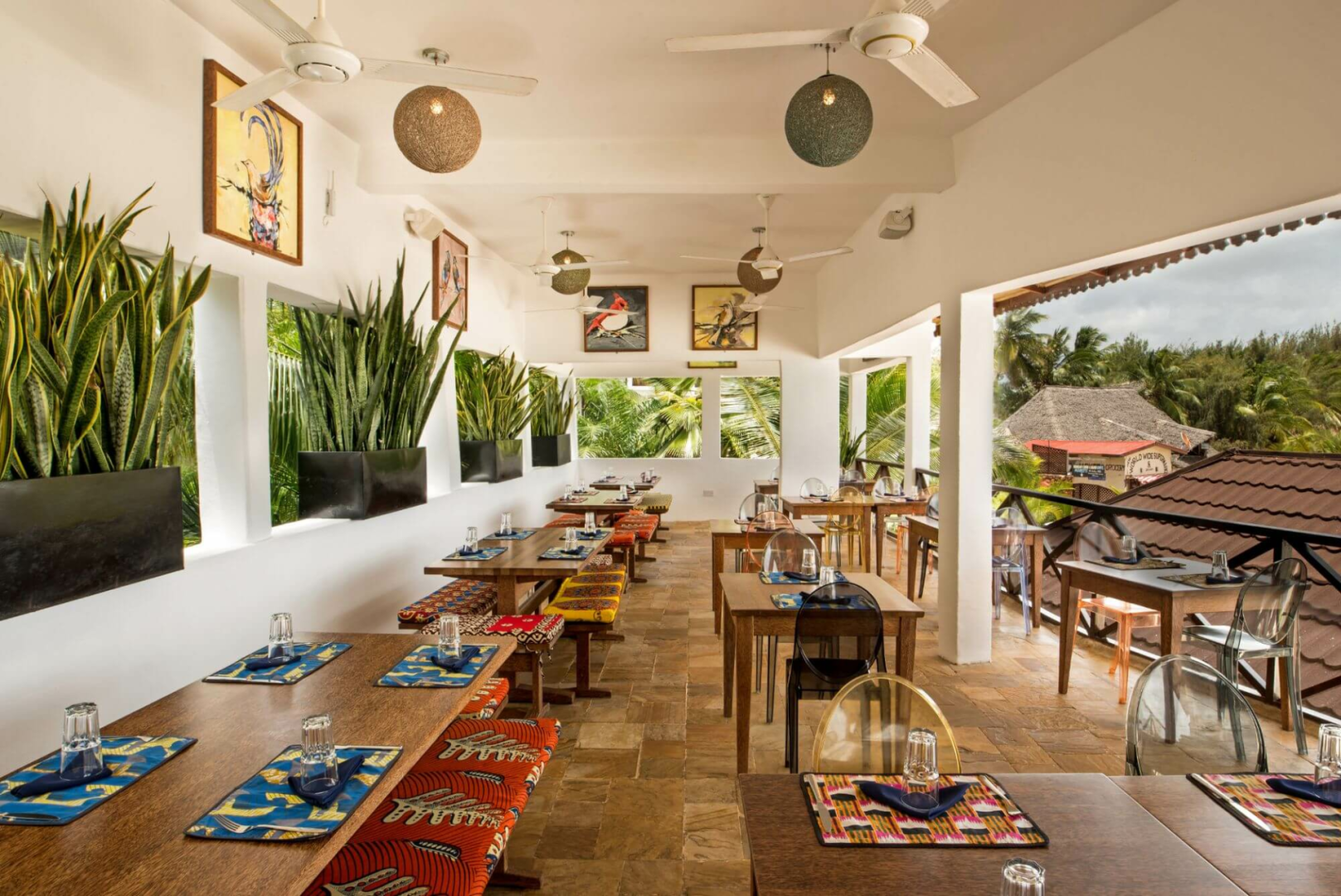 Rechts vom Rezeptionbereich führt eine kleine Treppe in das unauffällige unter Reetdach stehende Freiluft-Restaurant mit starkem meditärrenen Charakter, direkt über dem Meer und mit einem außergewöhnlichen Blick entlang der palmengesäumten Lagune in südlicher Richtung. Zur Lodge gehören zwei an zwe Stufen angeordneten Pools, ein davon ein wundervoller Infinity-Pool, der sich in den unterstehenden Poolbecken übergießt. Nah dem zweiten Pool findet man eine originell aus einem alten Dhow gebaute Bar, die mit dem riesigen Schädel eines jungen Pottwals dekoriert ist. Oberhalb davon ist der Spabereich.