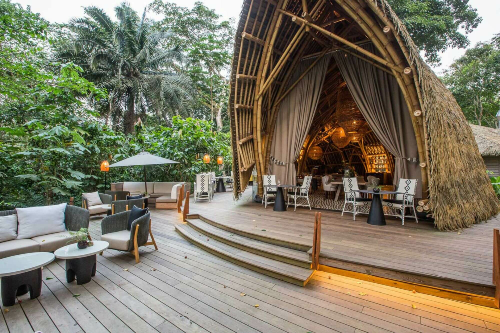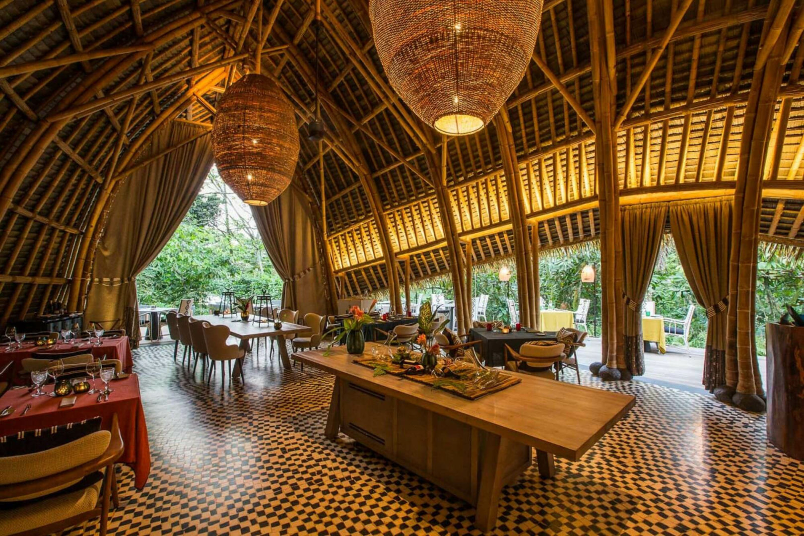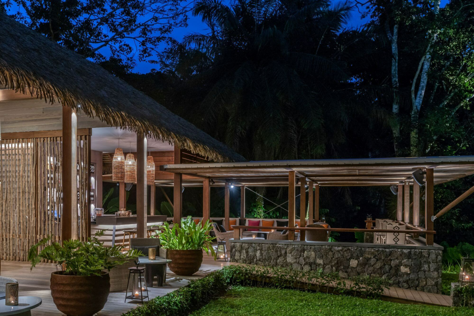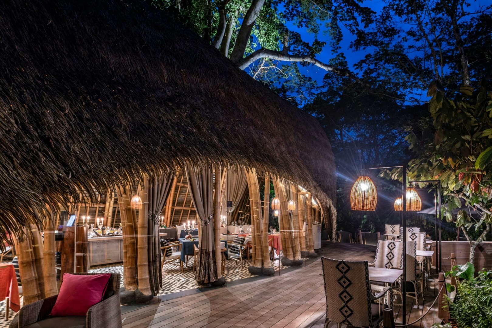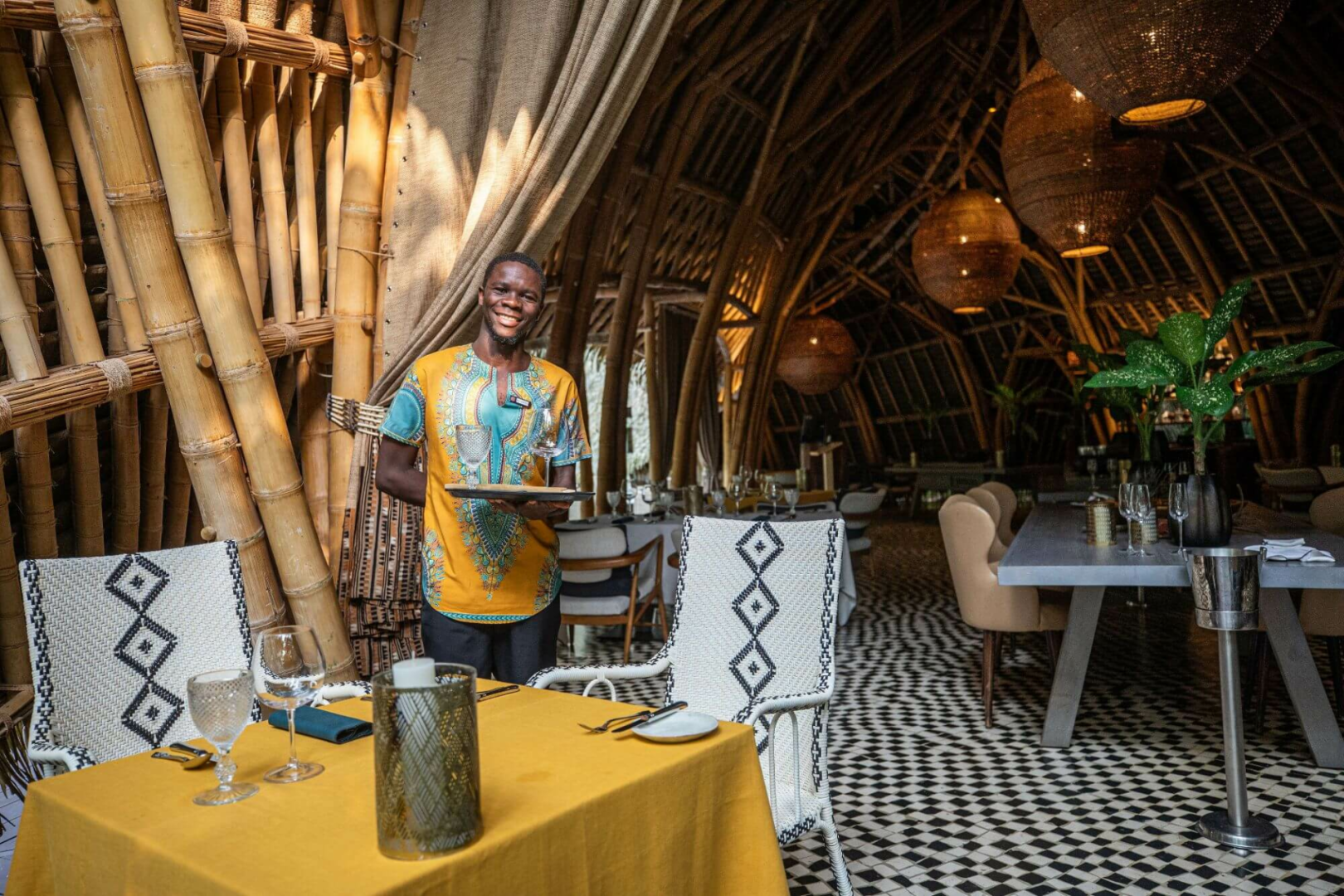Die Essbereiche sind ein wahr gewordener Traum, große Holzterrassen mit Rattanmöbeln und Sesseln, ein wunderschöner Infinity-Pool mit Blick auf den Strand, umgeben von bequemen Tagesbetten und ein sehr origineller Restaurantbereich, der mit einem beeindruckenden Strohdach überdacht ist (im Inneren kann man die köstlichsten Abendessen bei perfekter Beleuchtung durch kunstvolle Deckenlampen und ein sehr schönes Bambusgitter genießen).