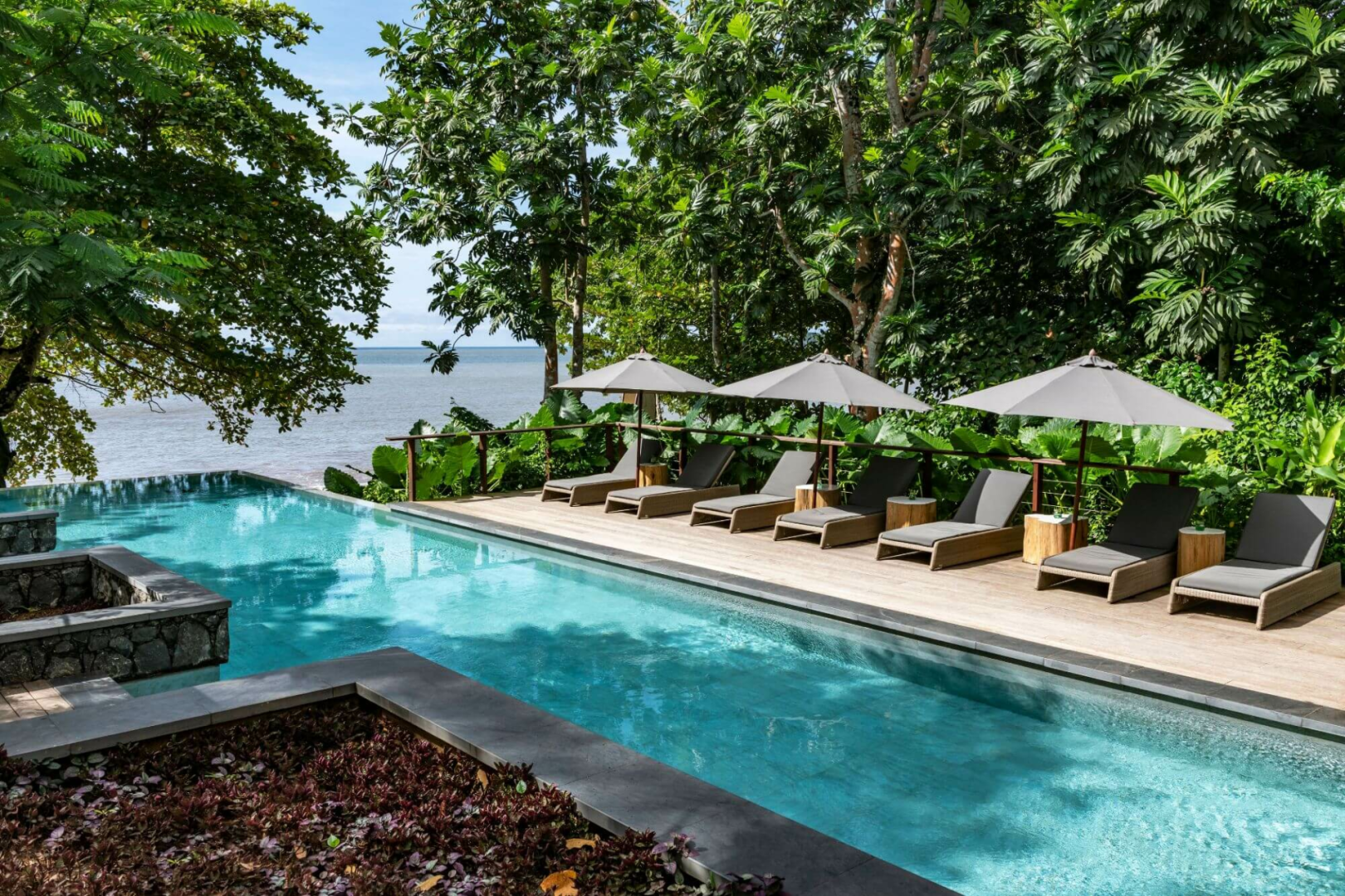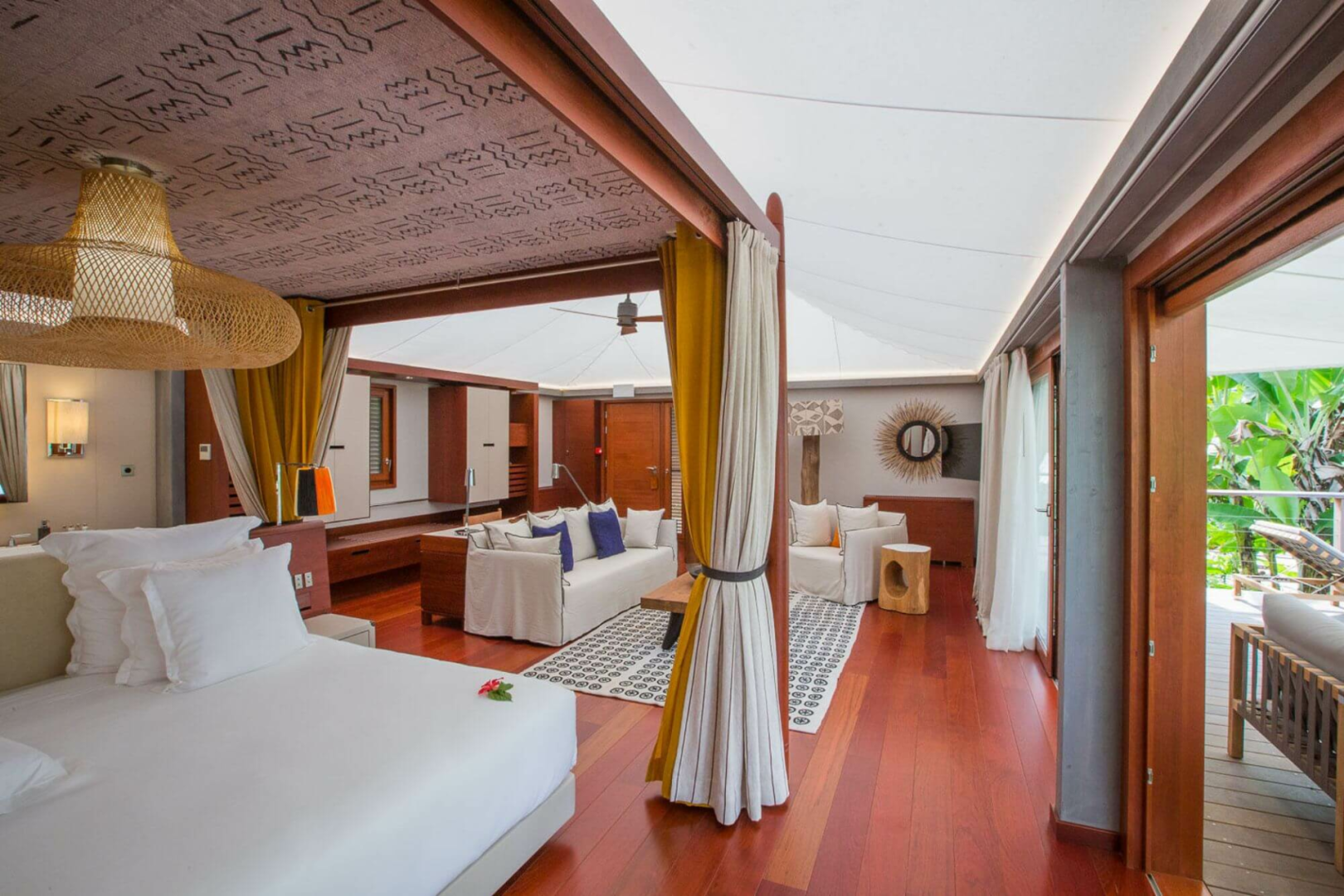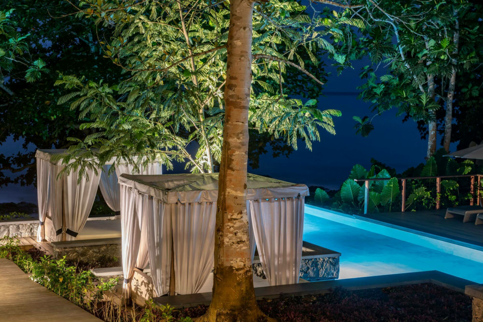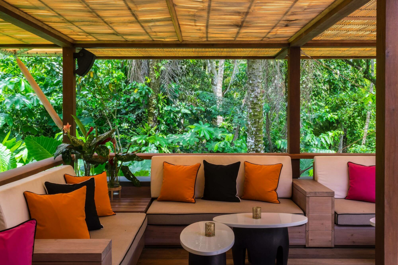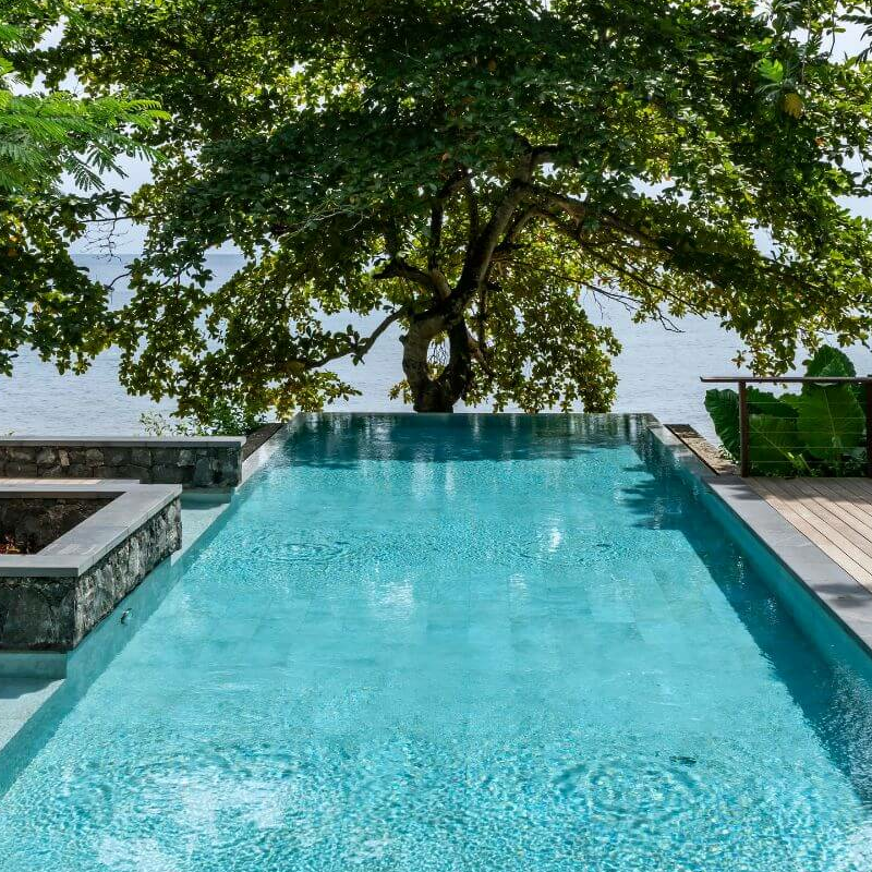 Die Essbereiche sind ein wahr gewordener Traum, große Holzterrassen mit Rattanmöbeln und Sesseln, ein wunderschöner Infinity-Pool mit Blick auf den Strand, umgeben von bequemen Tagesbetten und ein sehr origineller Restaurantbereich, der mit einem beeindruckenden Strohdach überdacht ist (im Inneren kann man die köstlichsten Abendessen bei perfekter Beleuchtung durch kunstvolle Deckenlampen und ein sehr schönes Bambusgitter genießen).