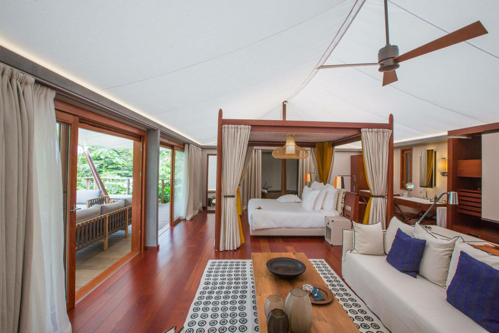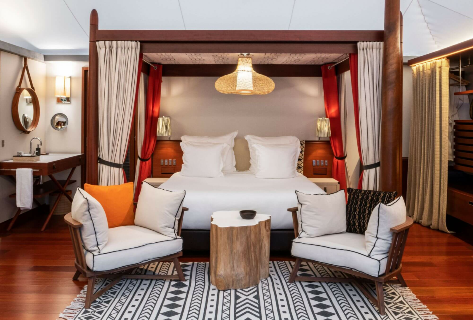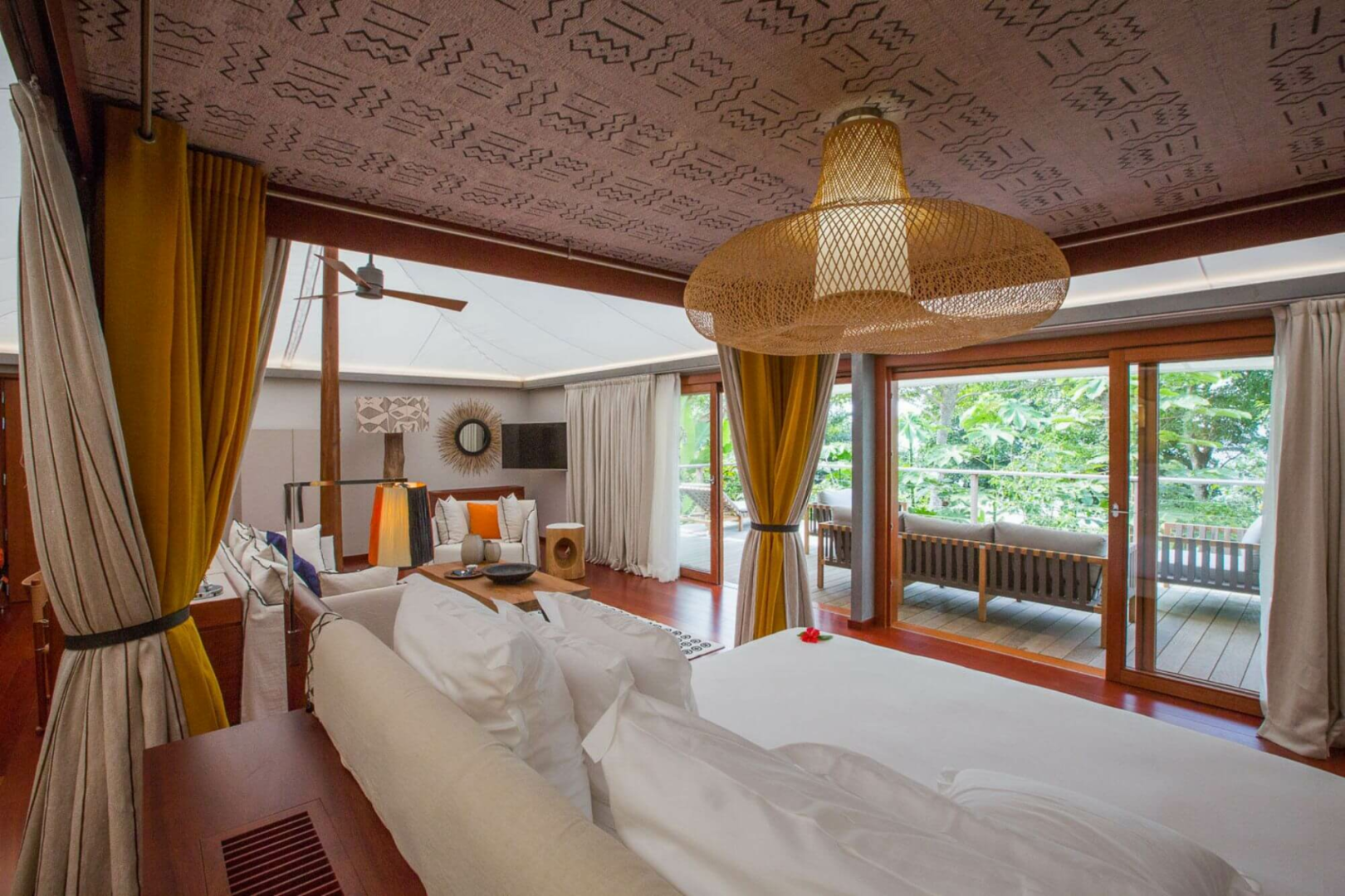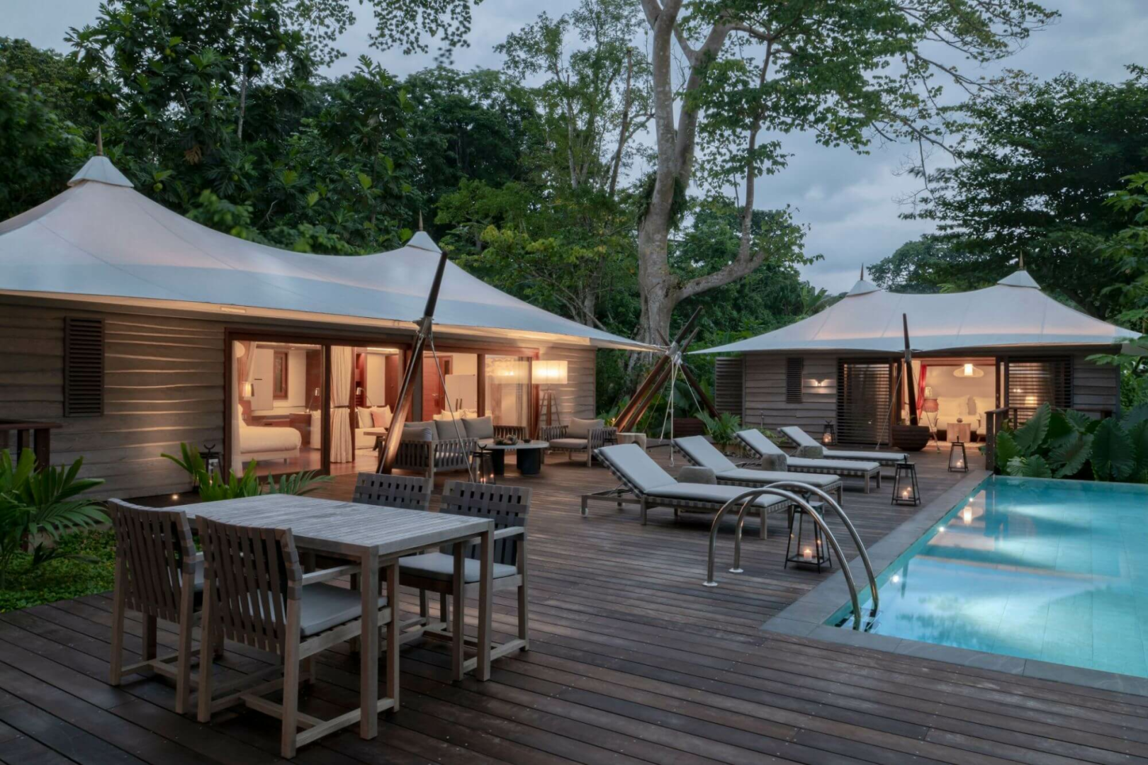 Die 14 Zeltvillen, die über das 180 Hektar große Gelände verstreut sind, sind einfach herrlich und mit jedem Detail ausgestattet: von der Klimaanlage, die in diesen Breitengraden sehr notwendig ist, bis zu den eleganten Parkettböden, den riesigen Betten unter Moskitonetzen, den geräumigen Badezimmern mit Badewanne und Dusche.