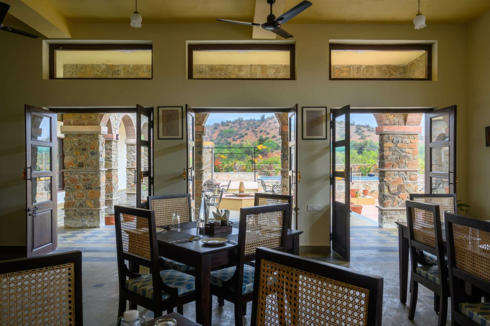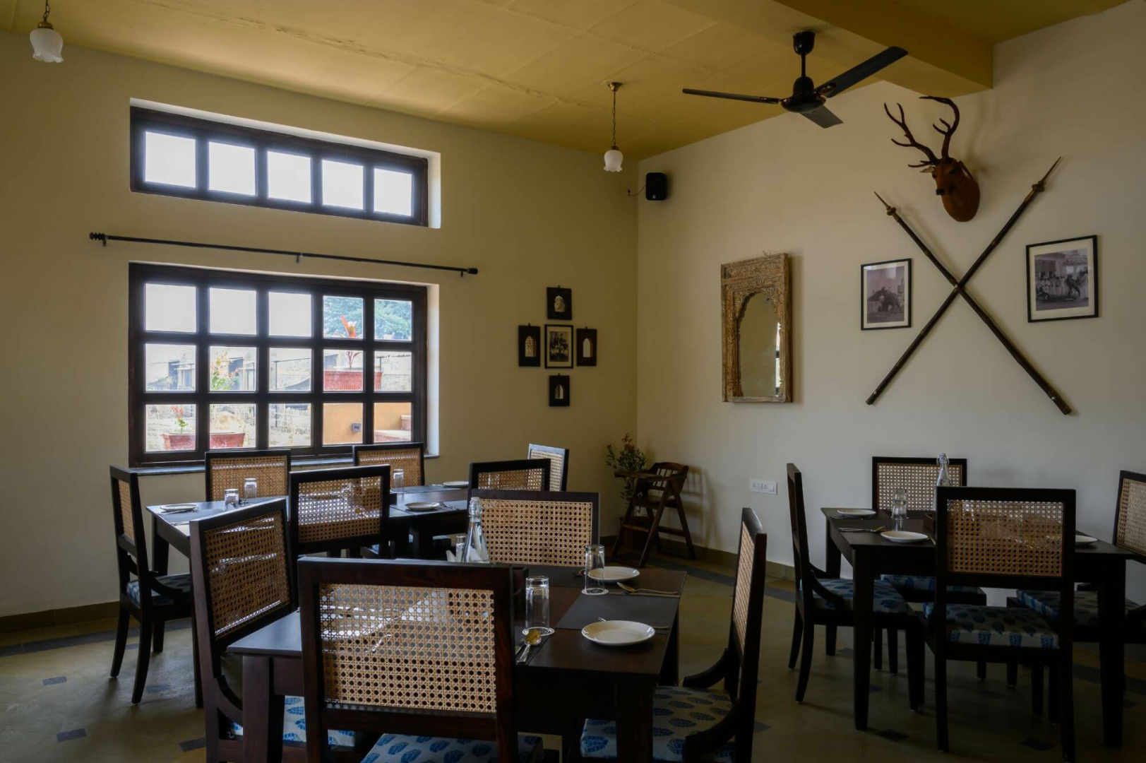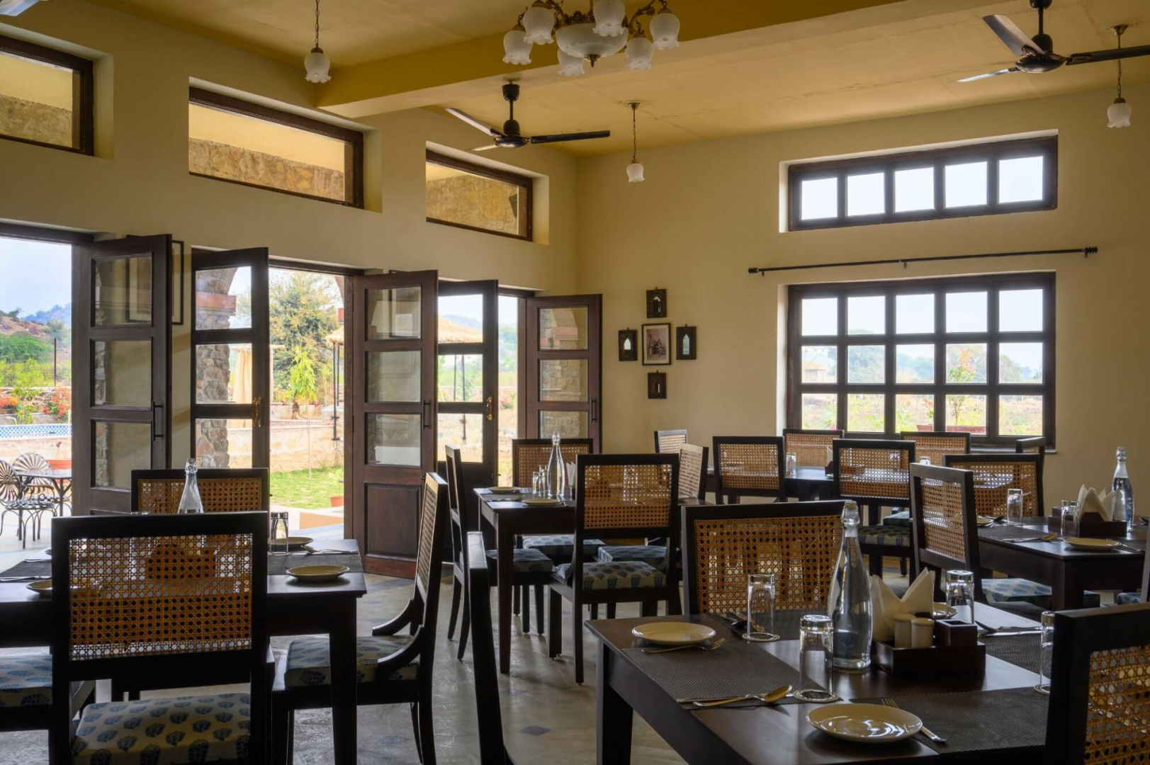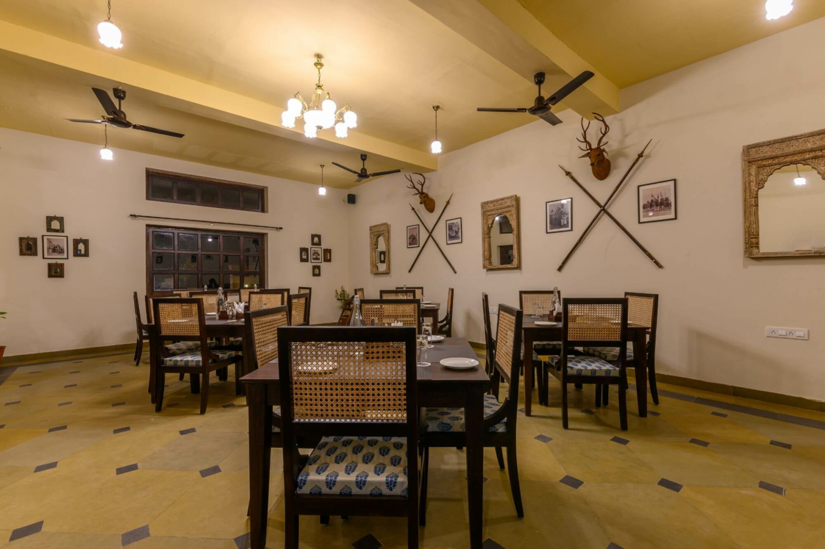 Die Gemeinschaftsräume sind auf ein Innenrestaurant und eine Terrasse verteilt, auf der auch die Mahlzeiten serviert werden. Der Schwerpunkt liegt auf authentischen Rajasthani-Gerichten.