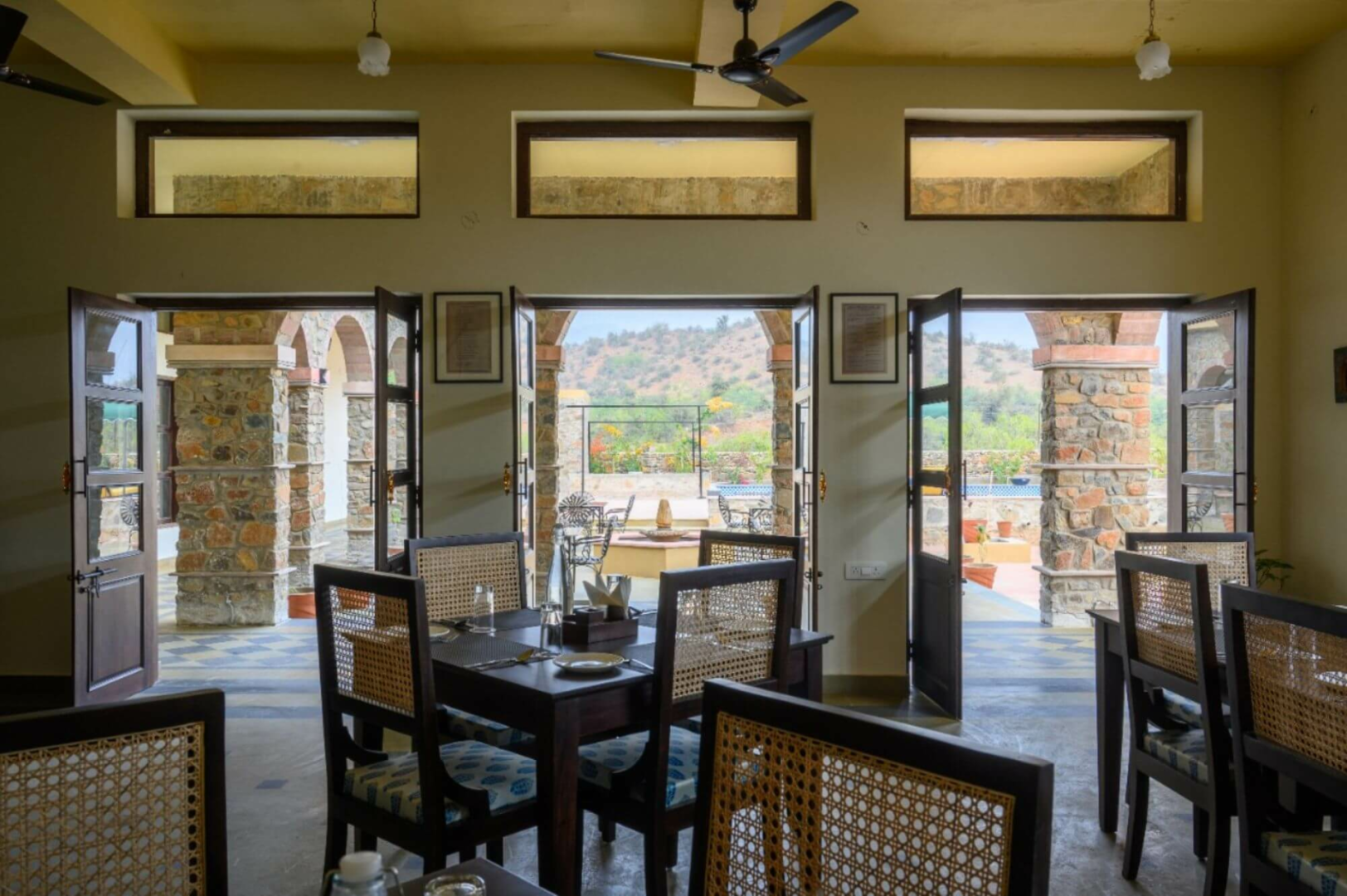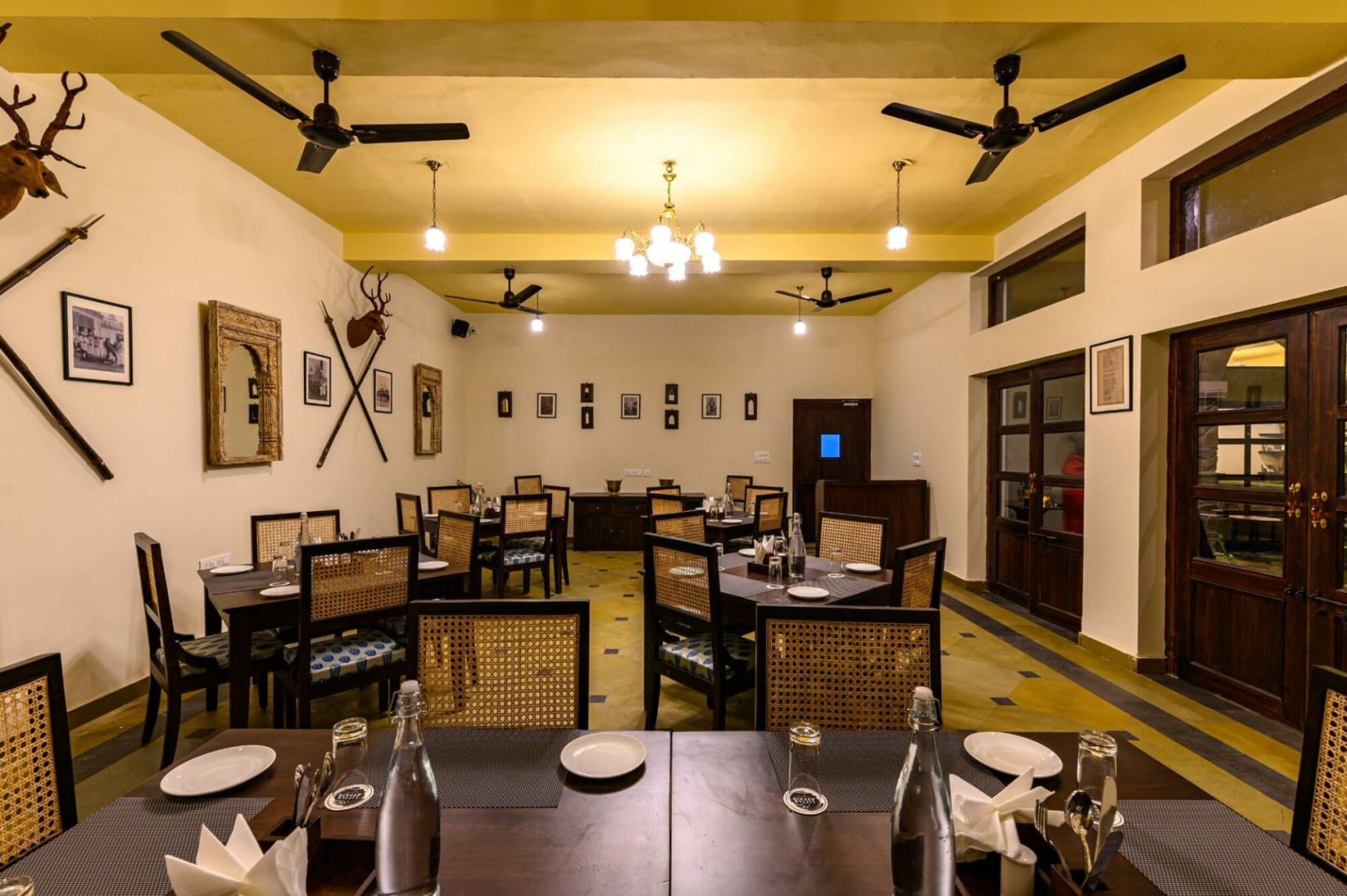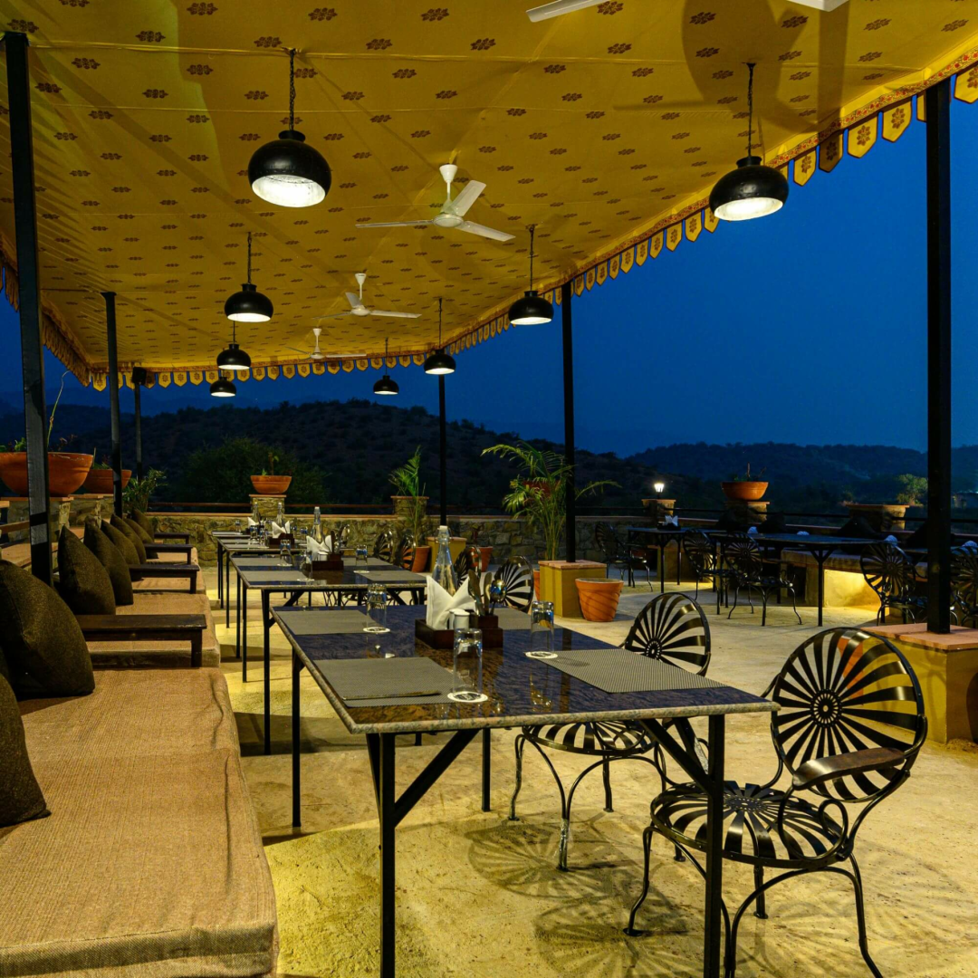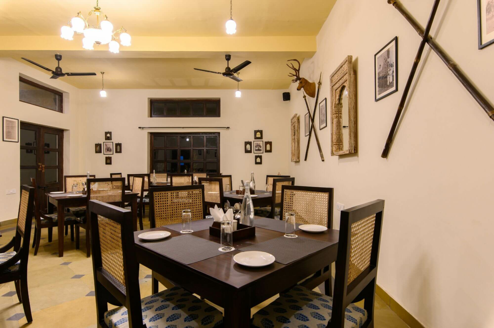 Die Gemeinschaftsräume sind auf ein Innenrestaurant und eine Terrasse verteilt, auf der auch die Mahlzeiten serviert werden. Der Schwerpunkt liegt auf authentischen Rajasthani-Gerichten.