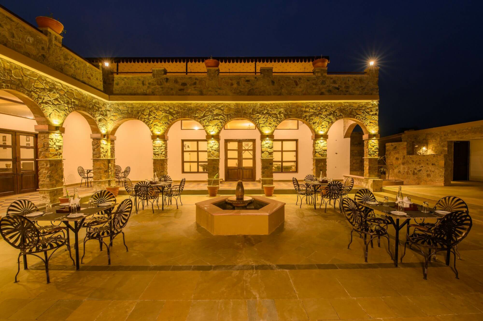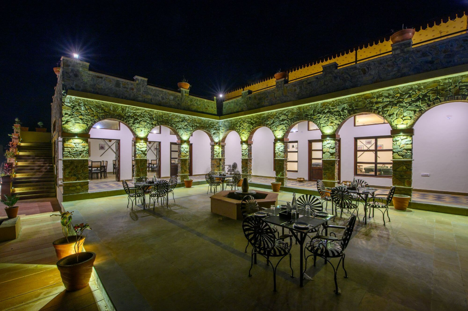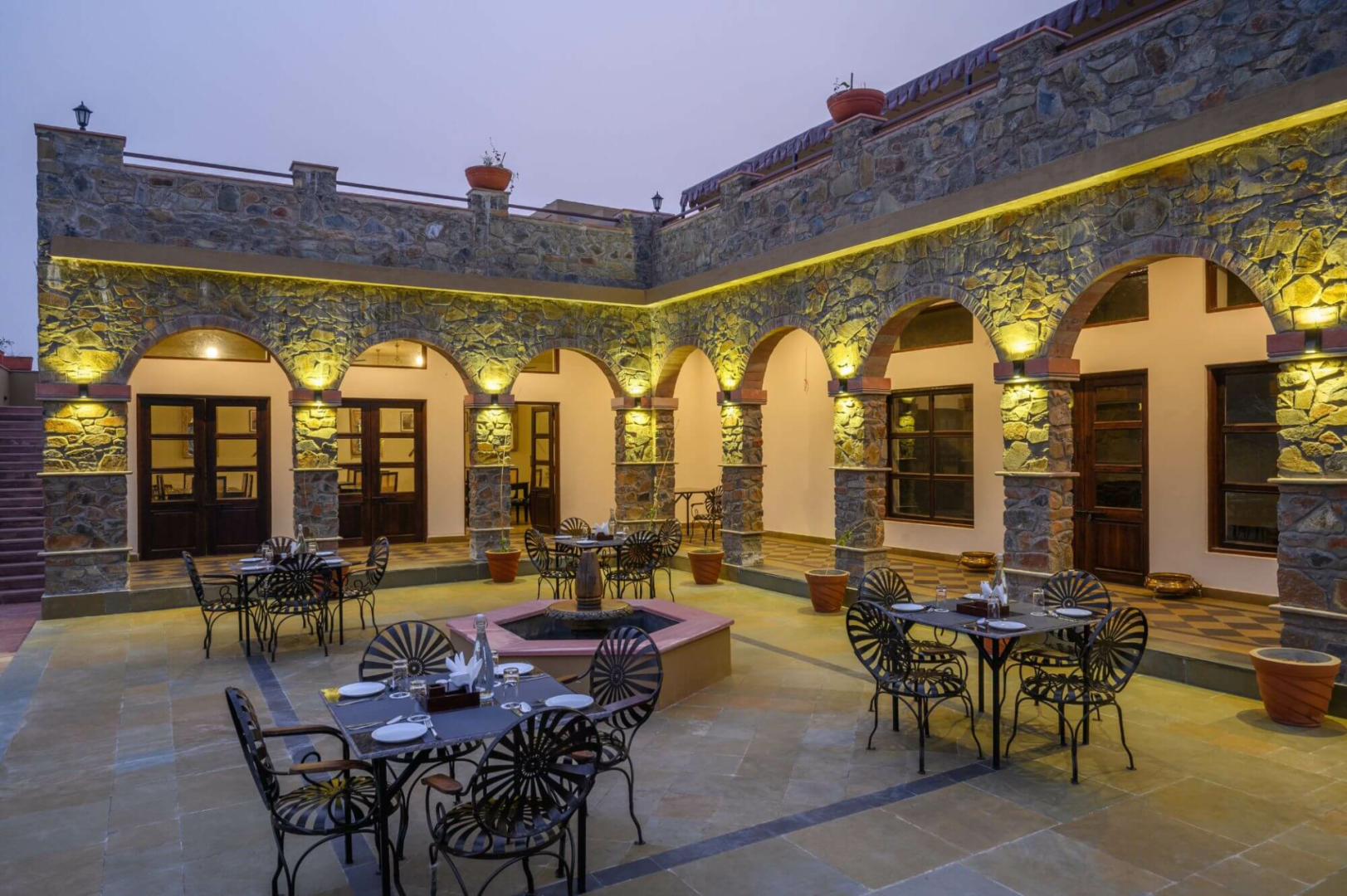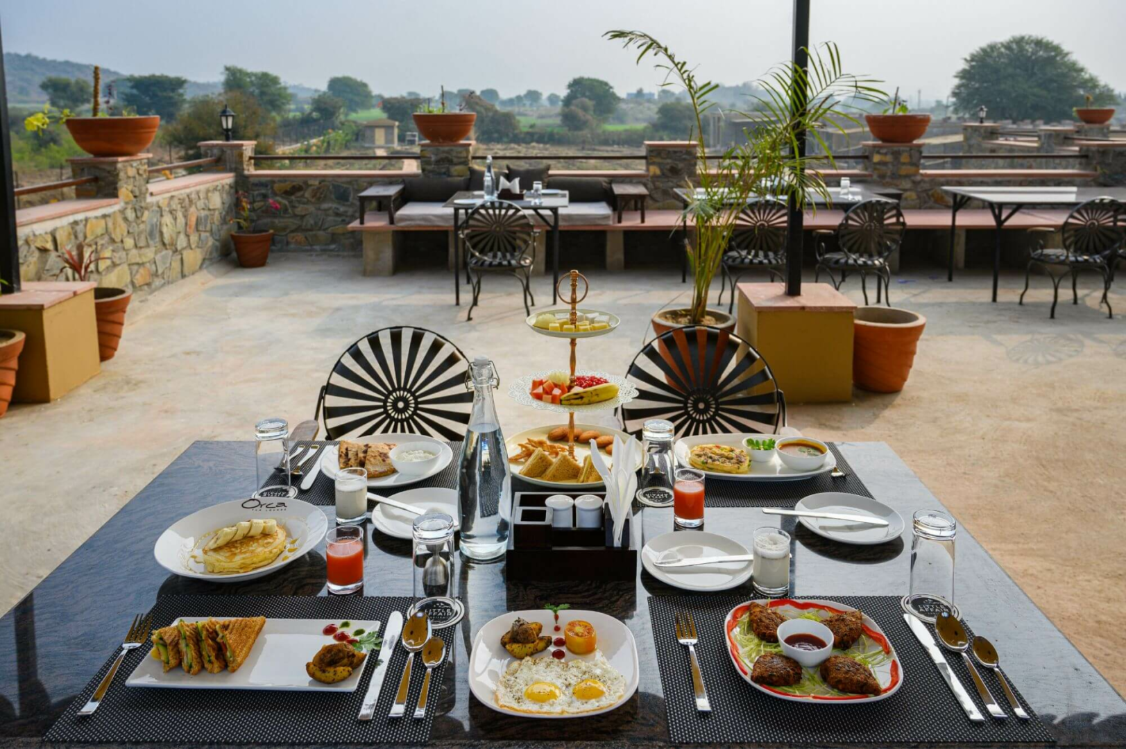 Die Gemeinschaftsräume sind auf ein Innenrestaurant und eine Terrasse verteilt, auf der auch die Mahlzeiten serviert werden. Der Schwerpunkt liegt auf authentischen Rajasthani-Gerichten.