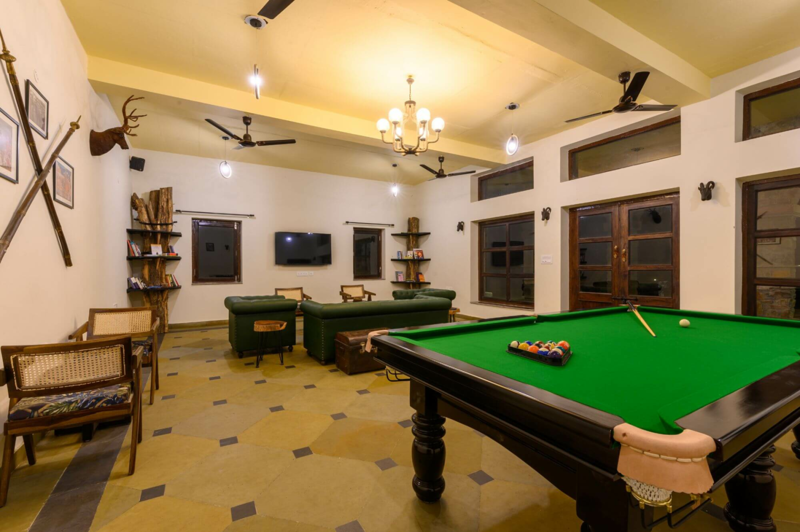 Es gibt auch einen Pool mit einer angrenzenden Bibliothek, die einen großartigen Ort zum Entspannen nach einer Safari bietet. Es gibt auch einen gemeinsamen Wohnbereich, in dem man sich mit anderen Gästen treffen oder fernsehen, OTT streamen, Snooker oder Brettspiele spielen oder einfach nur lesen und dösen kann.