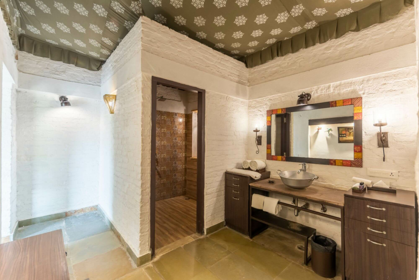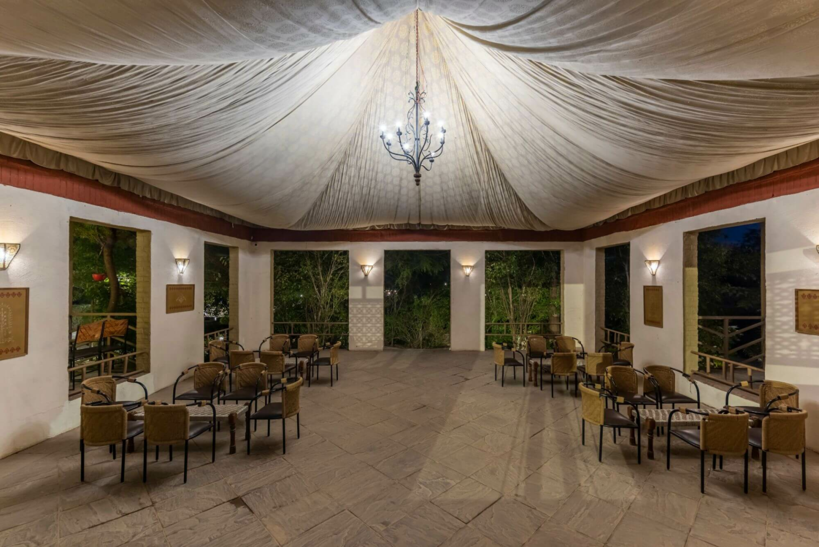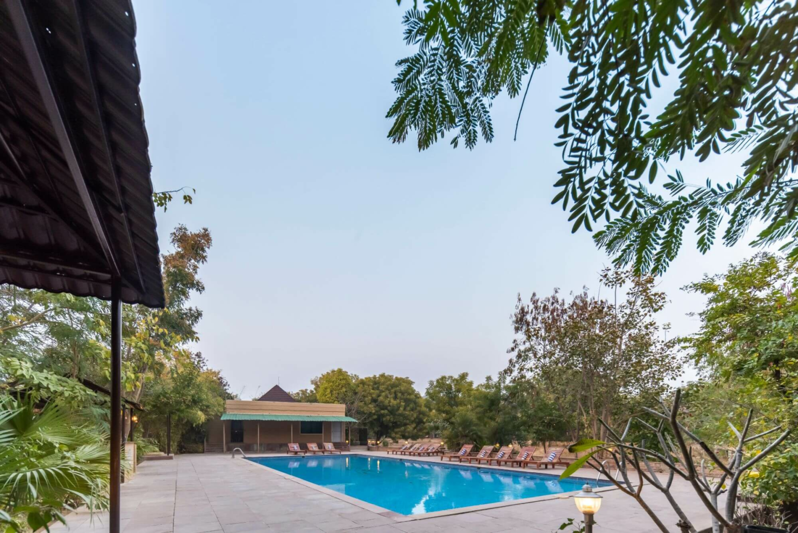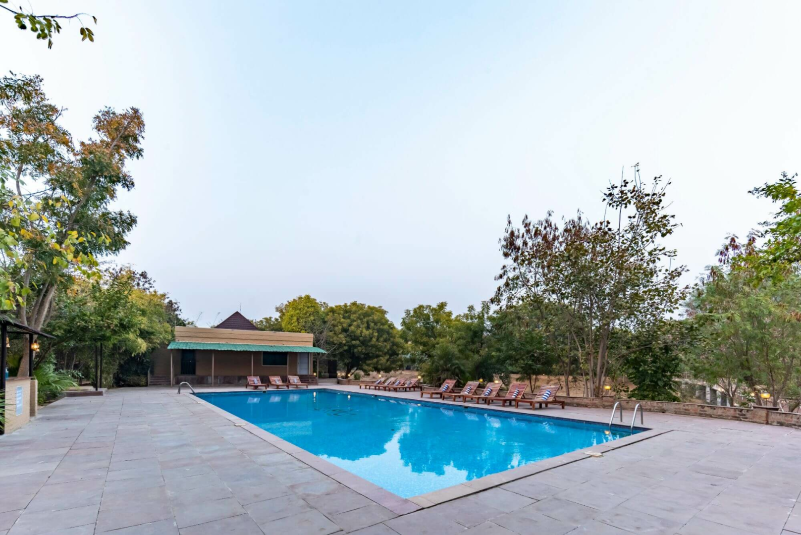 Zum Entspannen zwischen den Safaris bietet sich ein Swimmingpool mit Pavillons und einer Poolbar. Täglich wird hier Yoga angeboten. Es gibt auch eine kuriose Bar im Retrostil, die sich zu einer Außenterrasse hin öffnet, auf der man bei Rajasthani-Musik Drinks genießen kann.