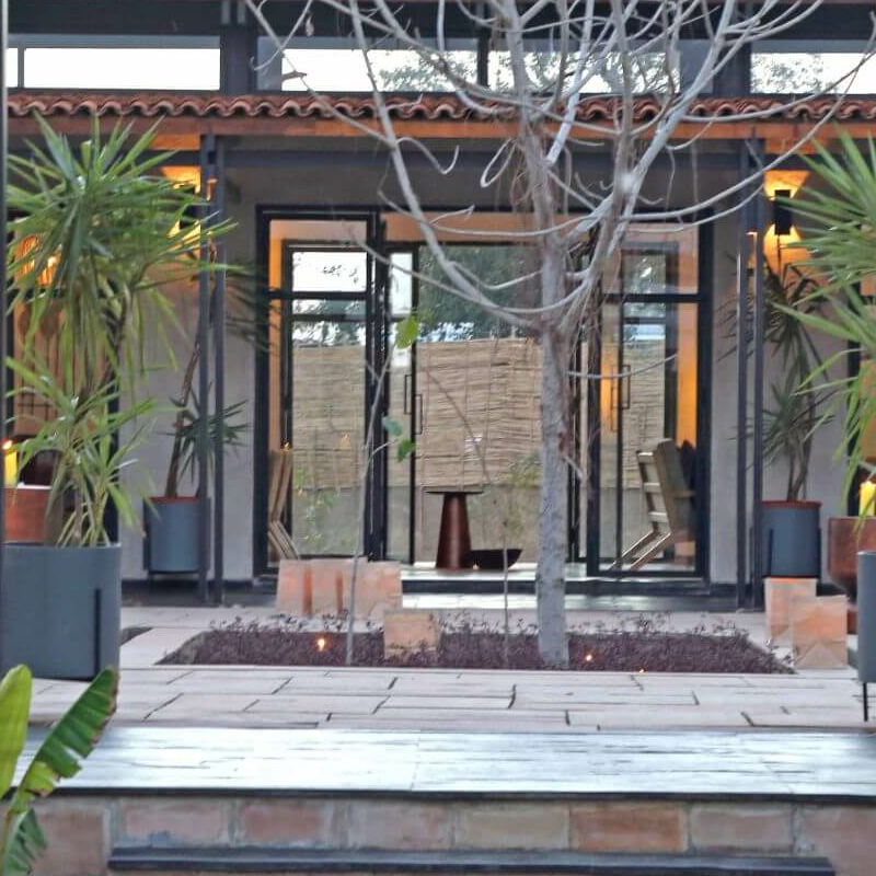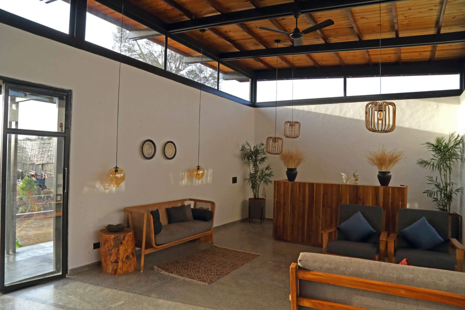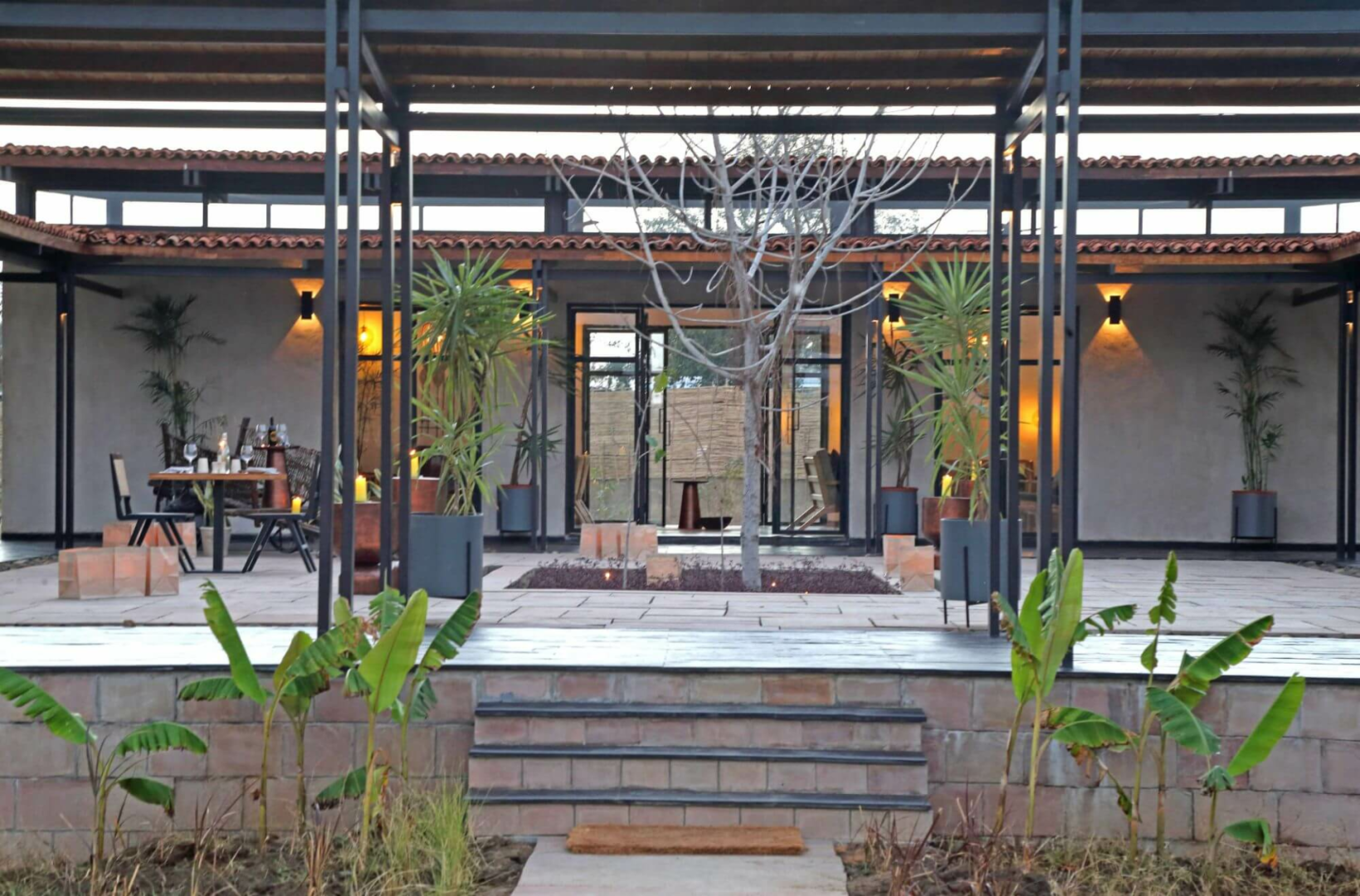 Direkt vor dem Parkplatz befindet sich die Empfangshalle mit gemeinsamen Toiletten und einer kleinen Sitzecke, in der vor den morgendlichen Safaris Tee und Kaffee serviert werden. Dieses kleine Gebäude öffnet sich zu einem großen Innenhof, links davon befindet sich der geschlossene Restaurantbereich mit Terrasse, wo normalerweise das Mittagessen stattfindet. Auf der rechten Seite befindet sich die Bibliothek mit bequemen Sofas und Büchern, der einzige Ort in der ganzen Lodge mit Internetzugang. Gleich daneben befindet sich das erhöhte Schwimmbecken mit Pool-Bar und schönem Restaurant neben dem Infinity-Pool. Der Pool blickt auf ein gefülltes Wasserloch.