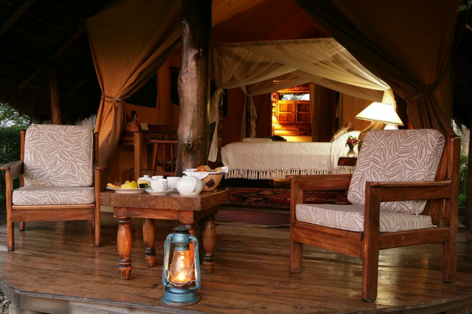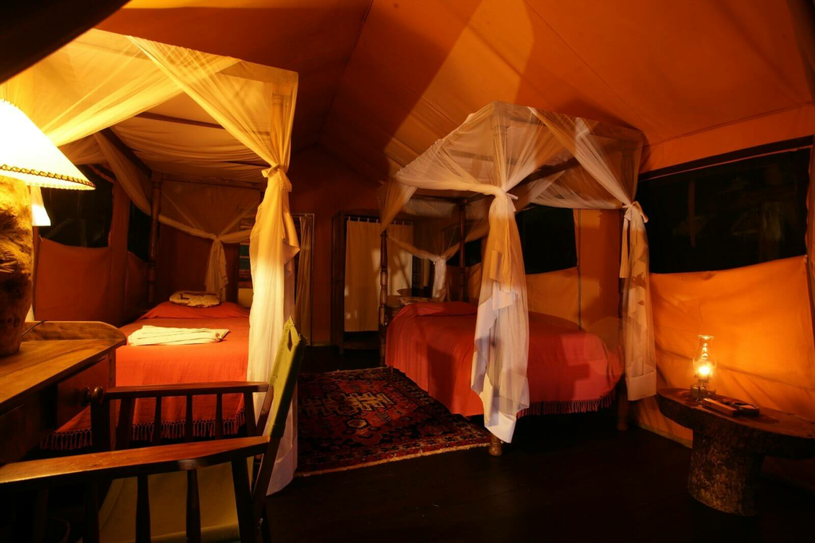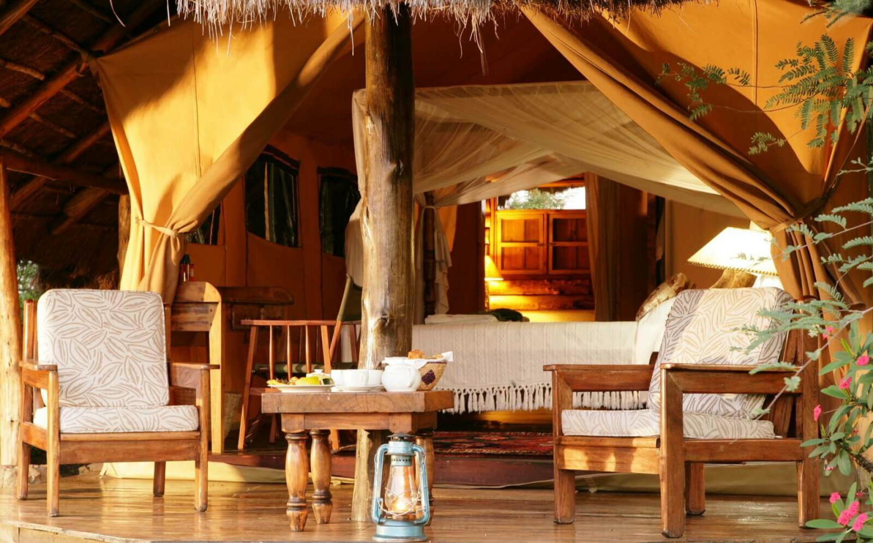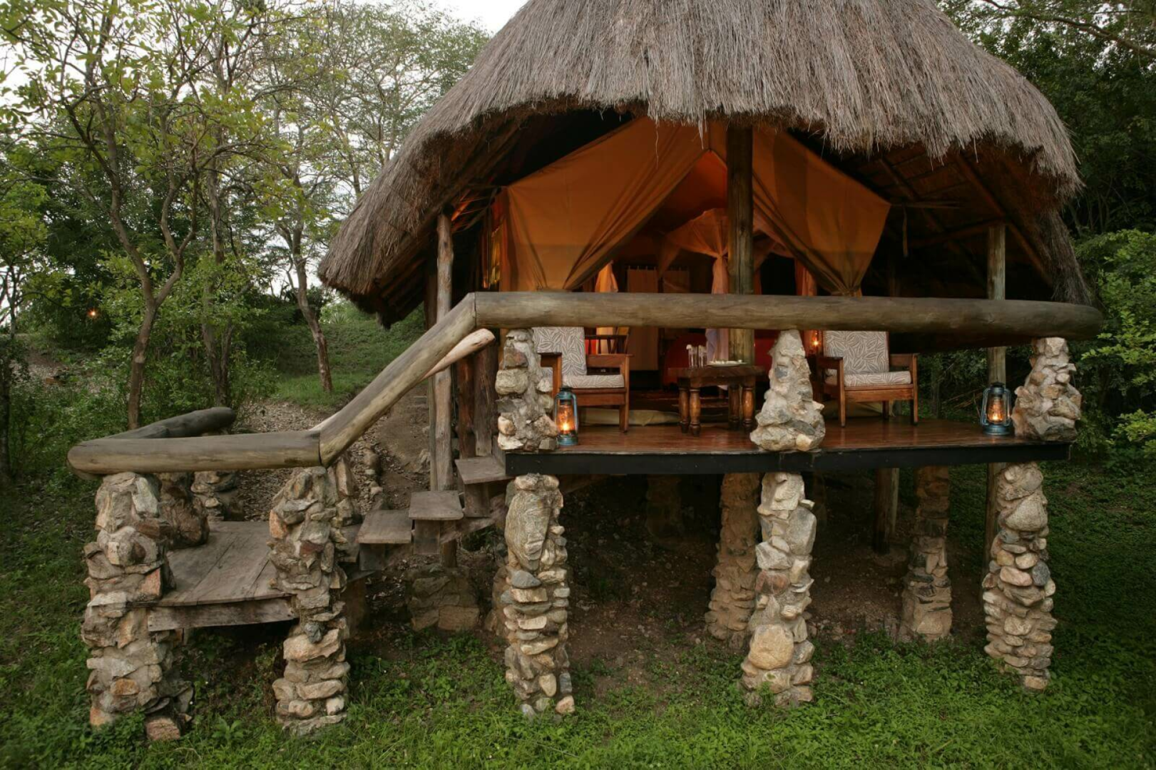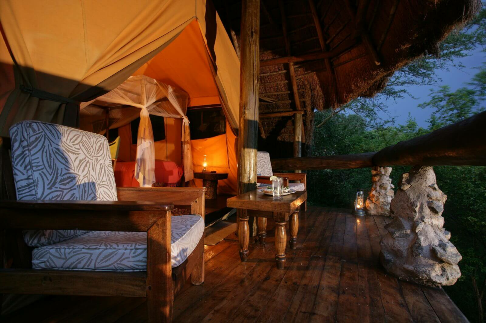 Sie bietet einige wenigen hochwertig ausgestatteten und angenehm gestalteten Luxuszelten, die auf einer Holzplattform mit Veranda stehen. Besonders schön ist auch der Zentralbereich der Lodge mit Lounge und Restaurant für die Gäste.