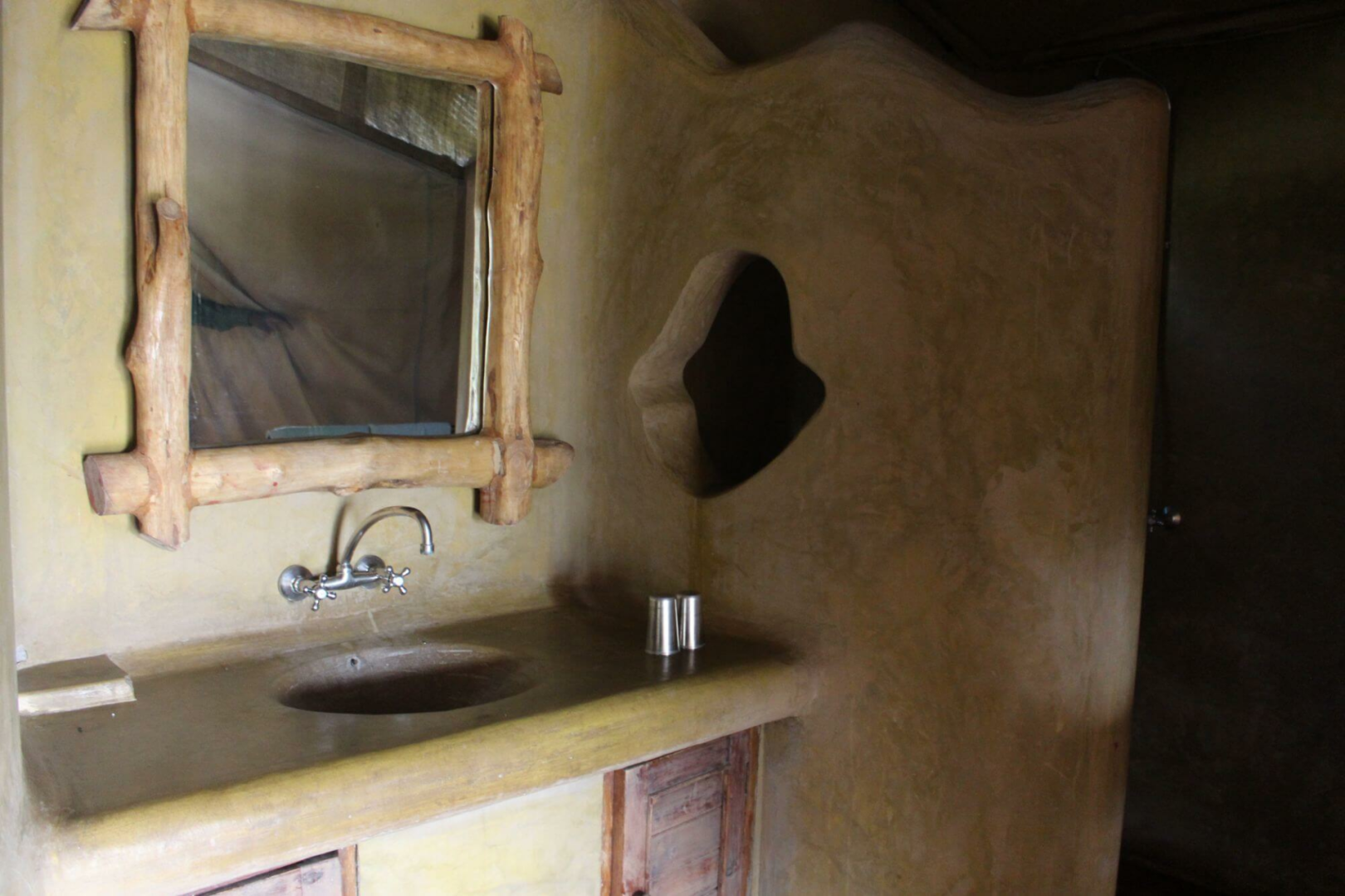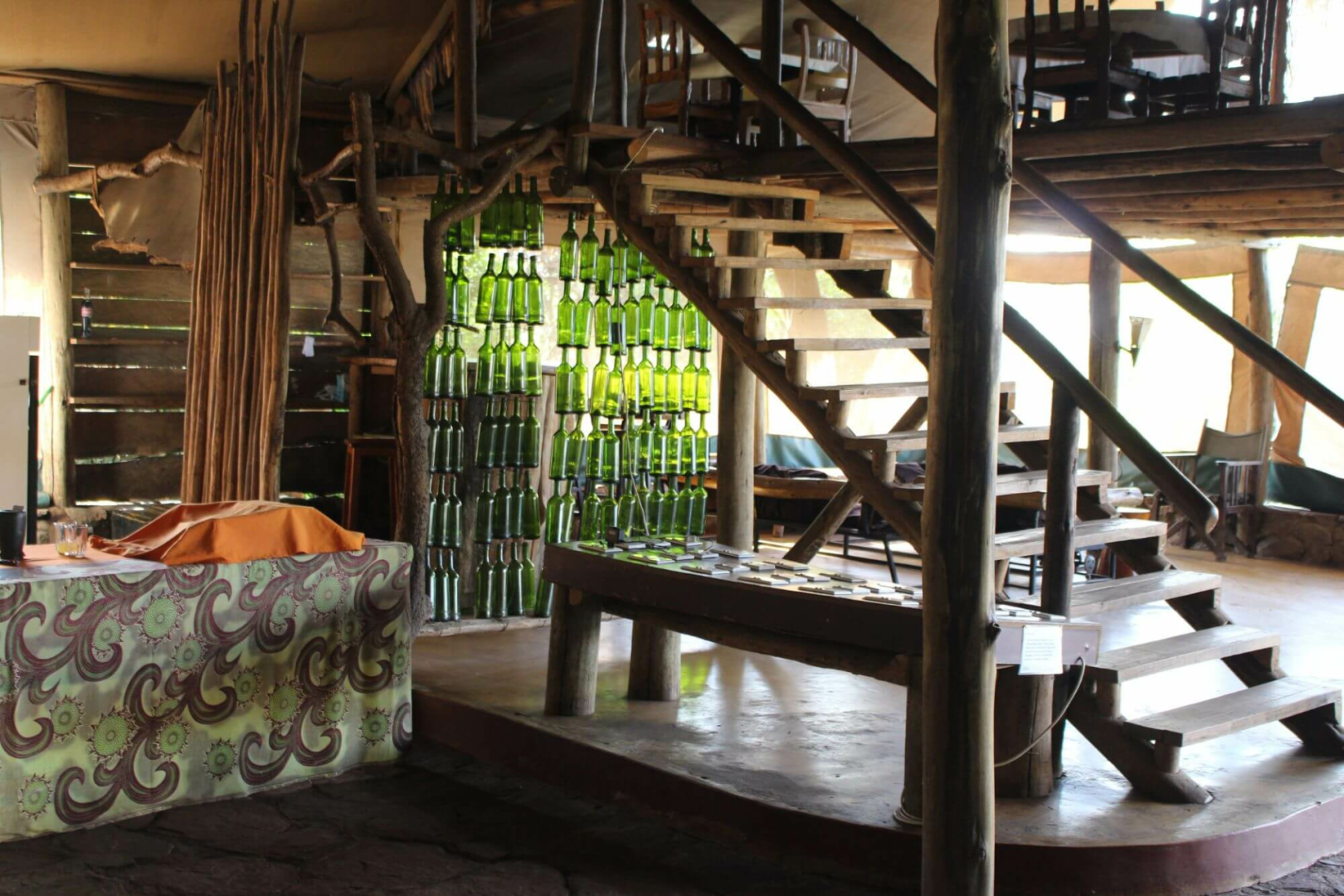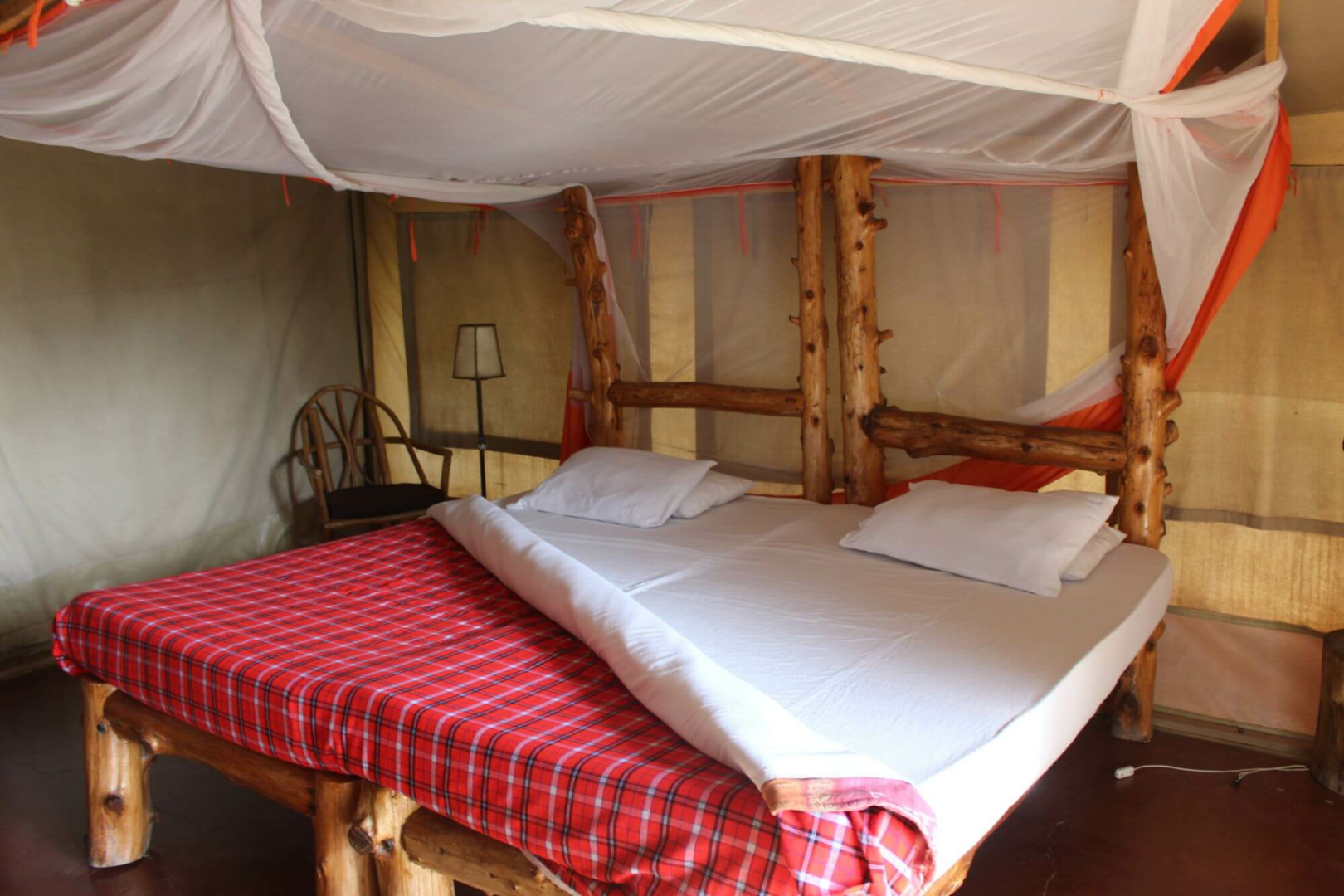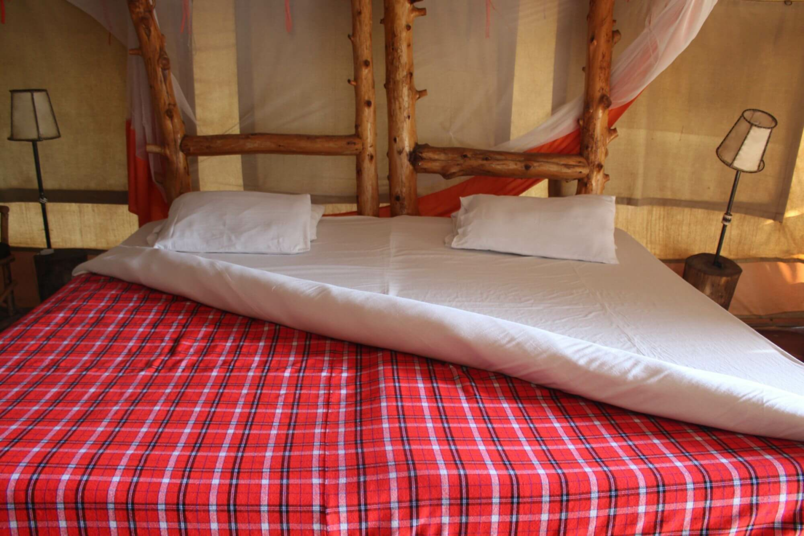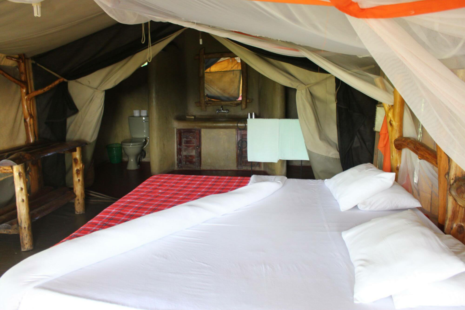 Zelte sind im typischen Stil und ausreichend komfortabel eingerichtet, im hinteren Bereich befindet sich eine geschlossene Toilette. Alle Zelte haben ein Reetdach und stehen auf einer Betonplattform.