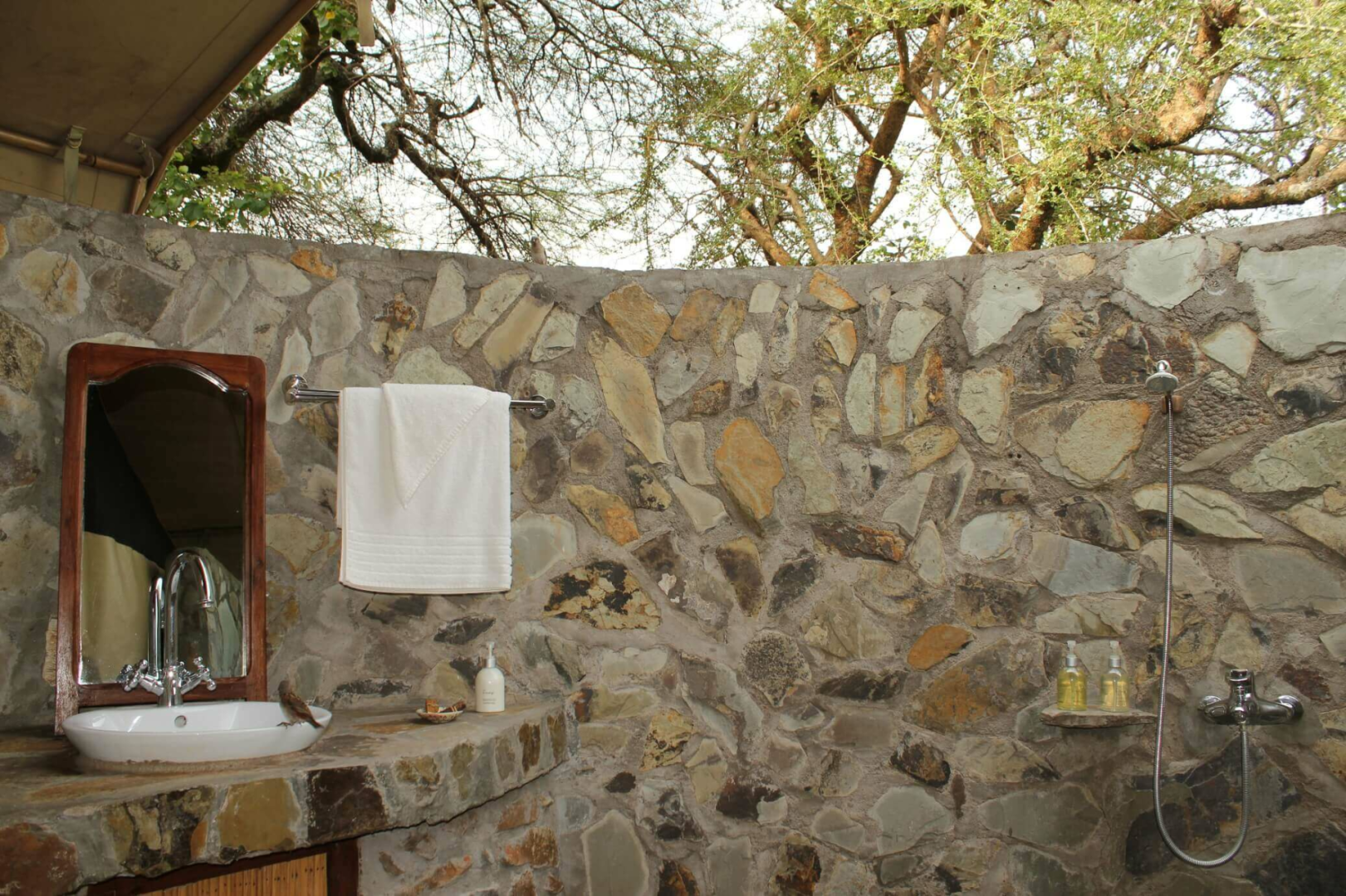 Neben dem Schlafbereich gibt es im hinteren Zelt eine Art Umkleidezone, an die sich das offene Bad anschließt. Das gesamte Bad mit Dusche und Toilette ist von einer etwa zwei Meter hohen Mauer umgeben und nach oben hin komplett offen, was etwas gewöhnungsbedürftig ist.