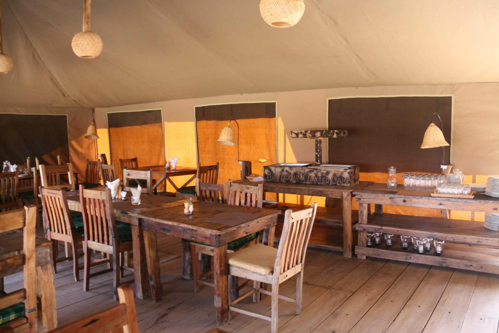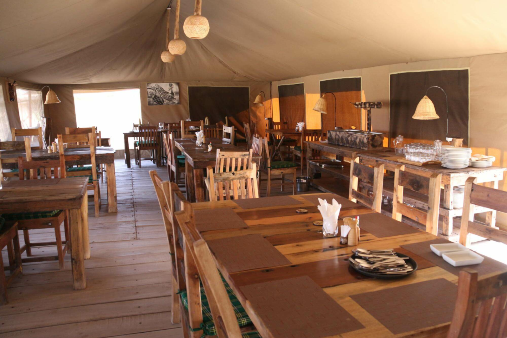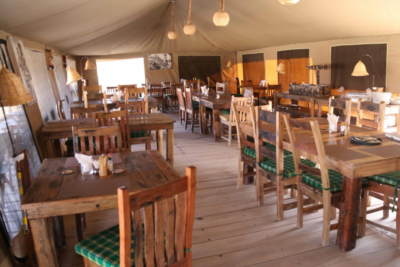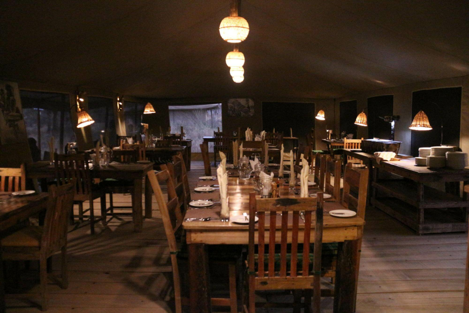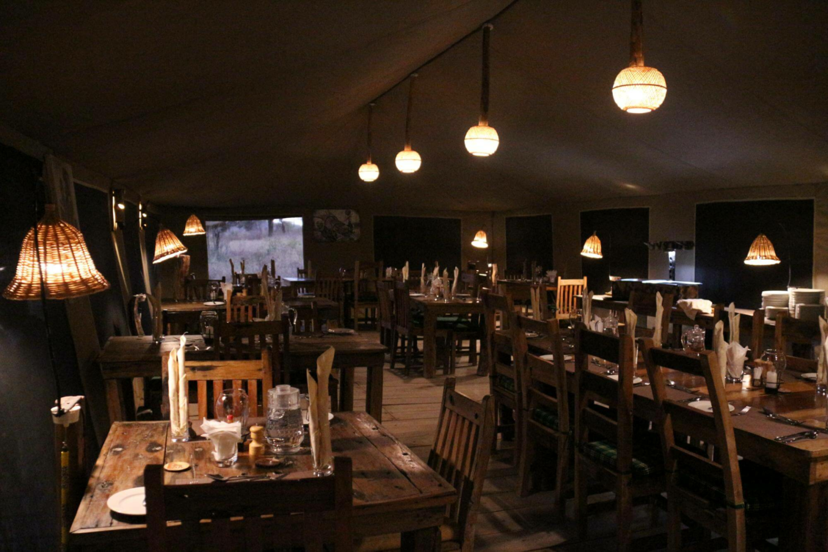 Zentrum des Camps sind die beiden Messezelte, die die Gemeinschaftsbereiche (Lounge und Restaurant) beherbergen, mit einer Feuerstelle an der Stirnseite. Vor beiden Zelten stehen einige Safaricharis und kleine Tische, von denen aus man die herrliche Aussicht genießen kann. Es ist ein schöner Ort, um einige Stunden vor dem Abendessen zu verbringen, die afrikanische Wildnis bei einem Bier zu genießen und dank des starken Wifi-Netzwerks mit der Familie zu Hause in Kontakt zu bleiben.