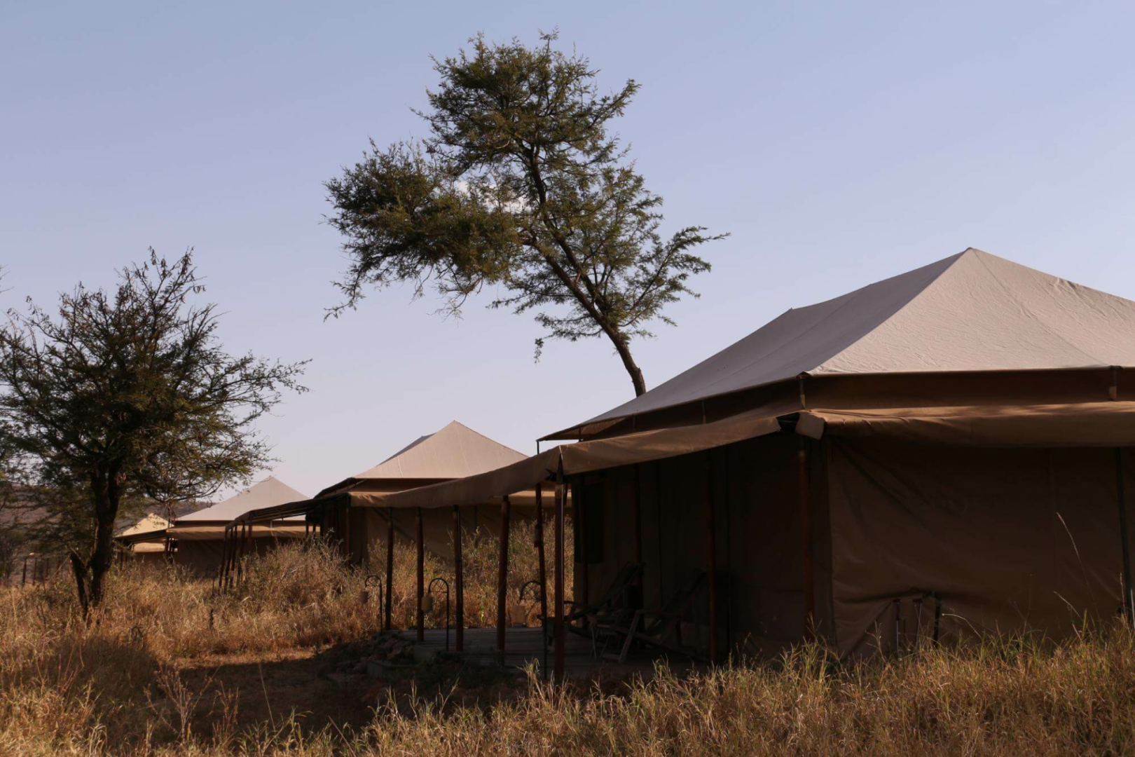 Die Gäste sind in insgesamt vierzehn Zelten untergebracht, die sich in einer Reihe von jeweils sieben Zelten rechts und links von den Essenszelten mit Blick auf die Ebenen und die Tiere in der Ferne aufreihen.