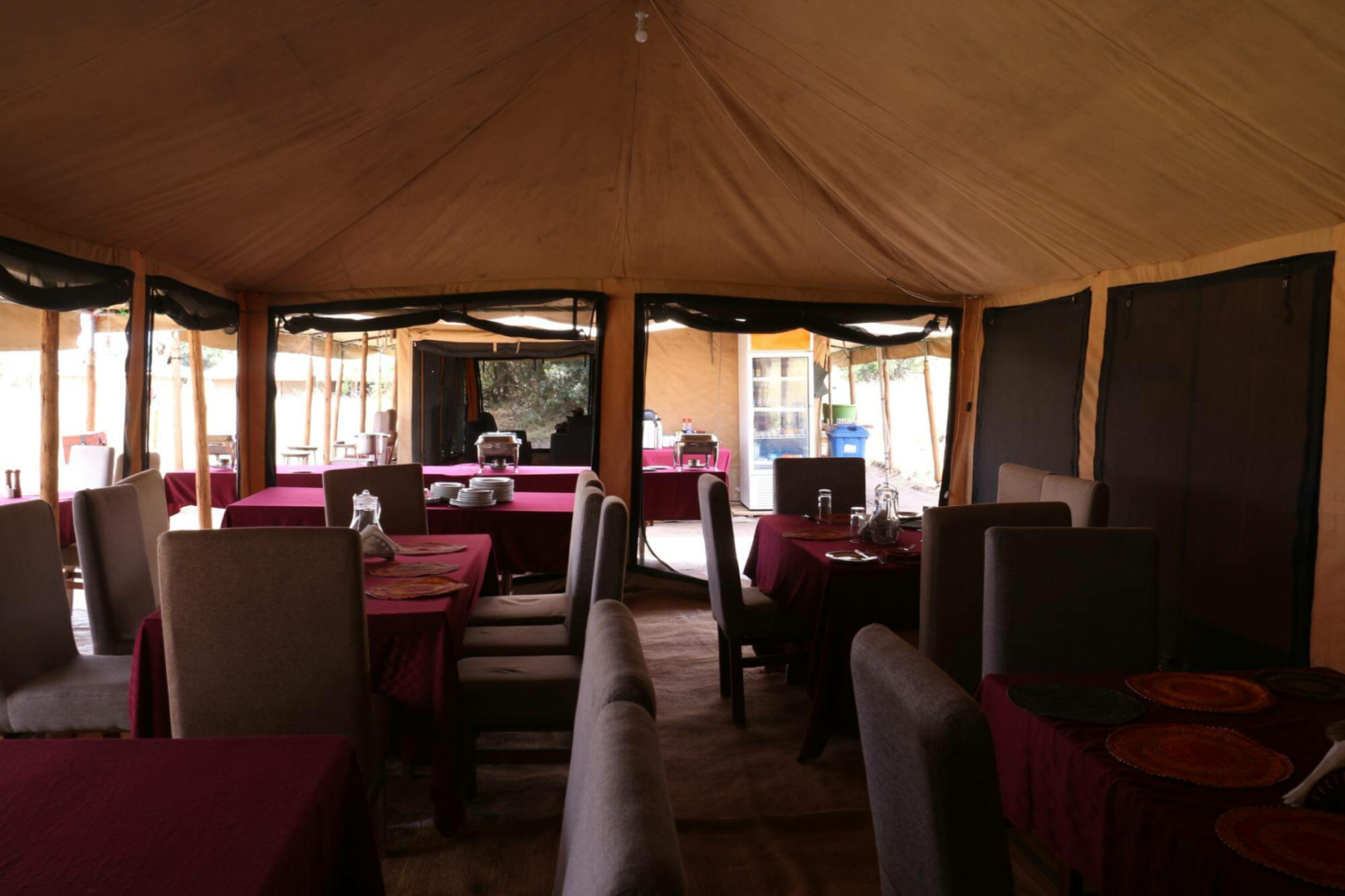 Wie in allen Safari-Camps spielt sich das Safari-Leben in den Gemeinschaftsbereichen ab. Das Lounge-Zelt ist spartanisch mit nur ein paar Sofas und Couches und einem Couchtisch. Das Esszelt nebenan ist etwas besser gestaltet, mit gut angeordneten Tischen und einem sehr guten Essen. Wifi ist hier sehr stark.