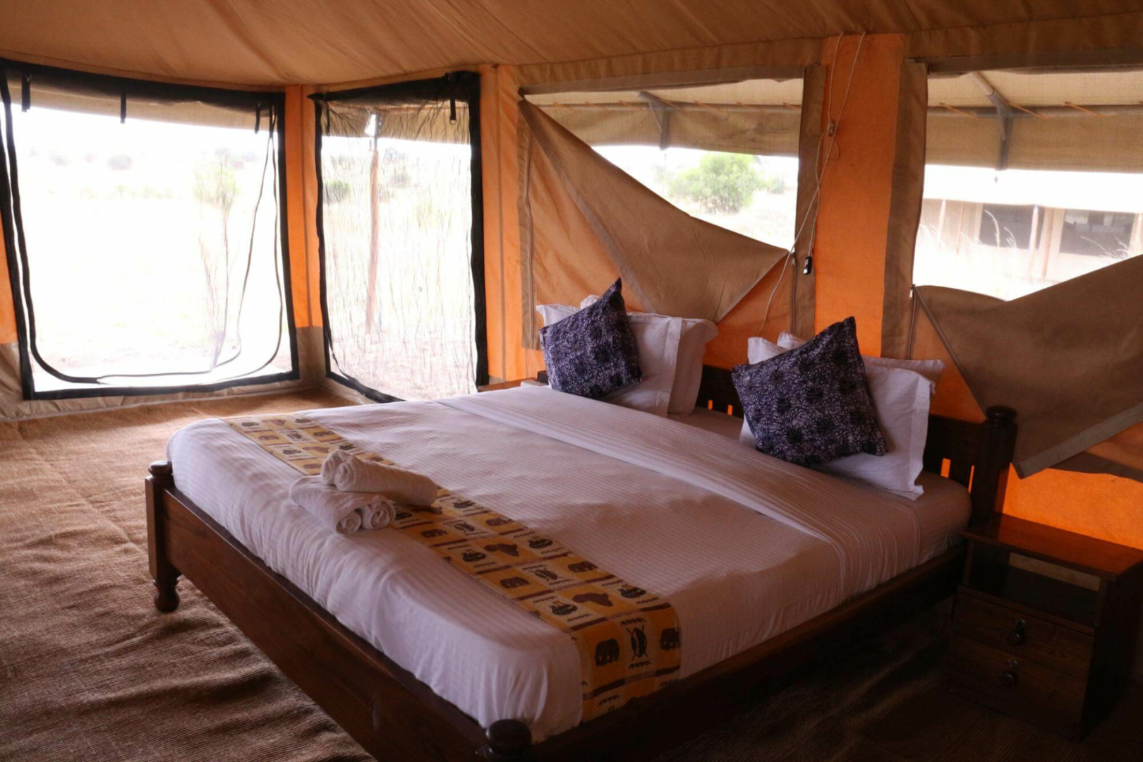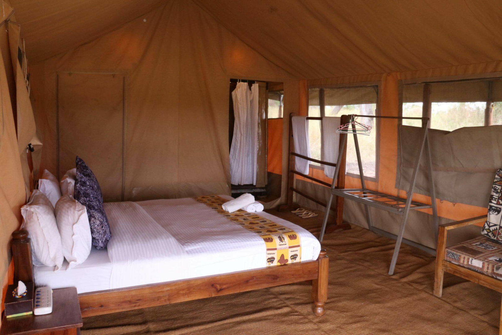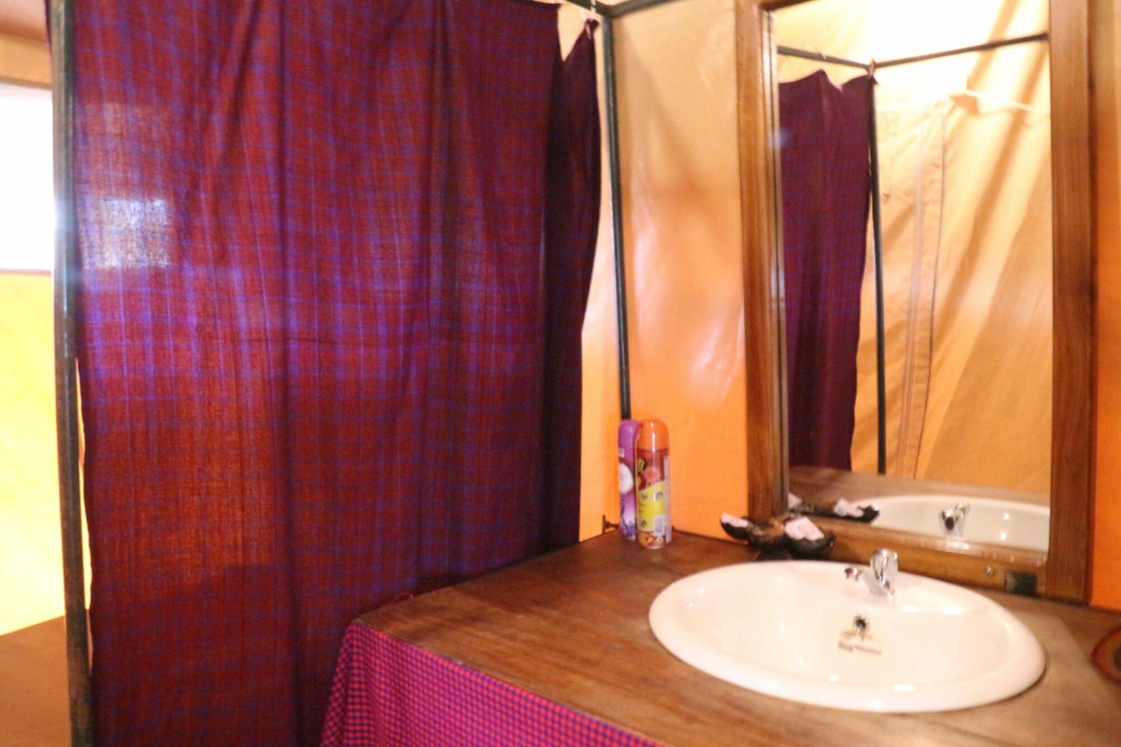 Zehn der vierzehn Gästezelte von Sense of Wilderness wurden aus den erloschenen Mbugani-Camps recycelt und bedürfen einiger Reparaturen, um Löcher in den Netzen zu flicken. Die Einrichtung ist sehr spartanisch, mit nur Glühbirnen ohne Lampenschirme an der Decke hängen. Das Badezimmer ist ebenfalls einfach, wir haben einen Vorhang vermisst, um die Toilette vom Duschbereich zu trennen.