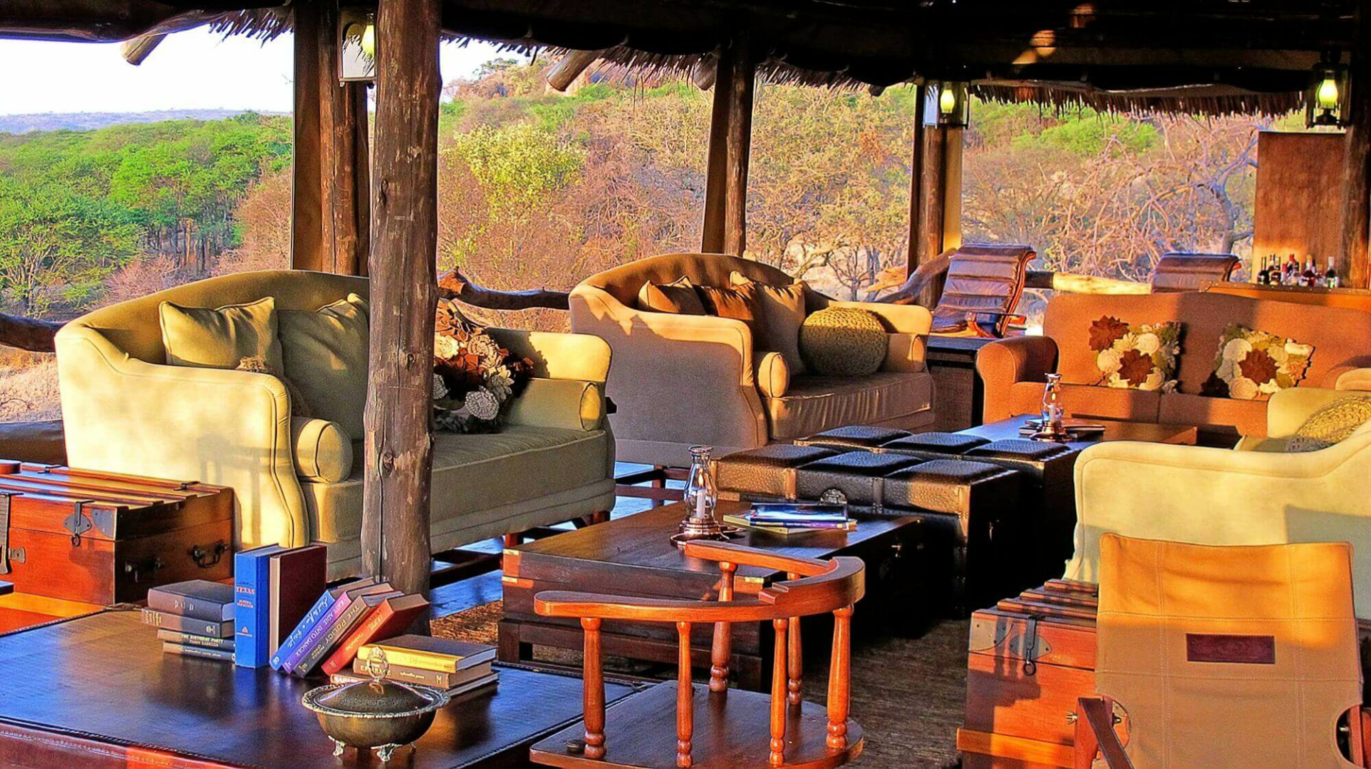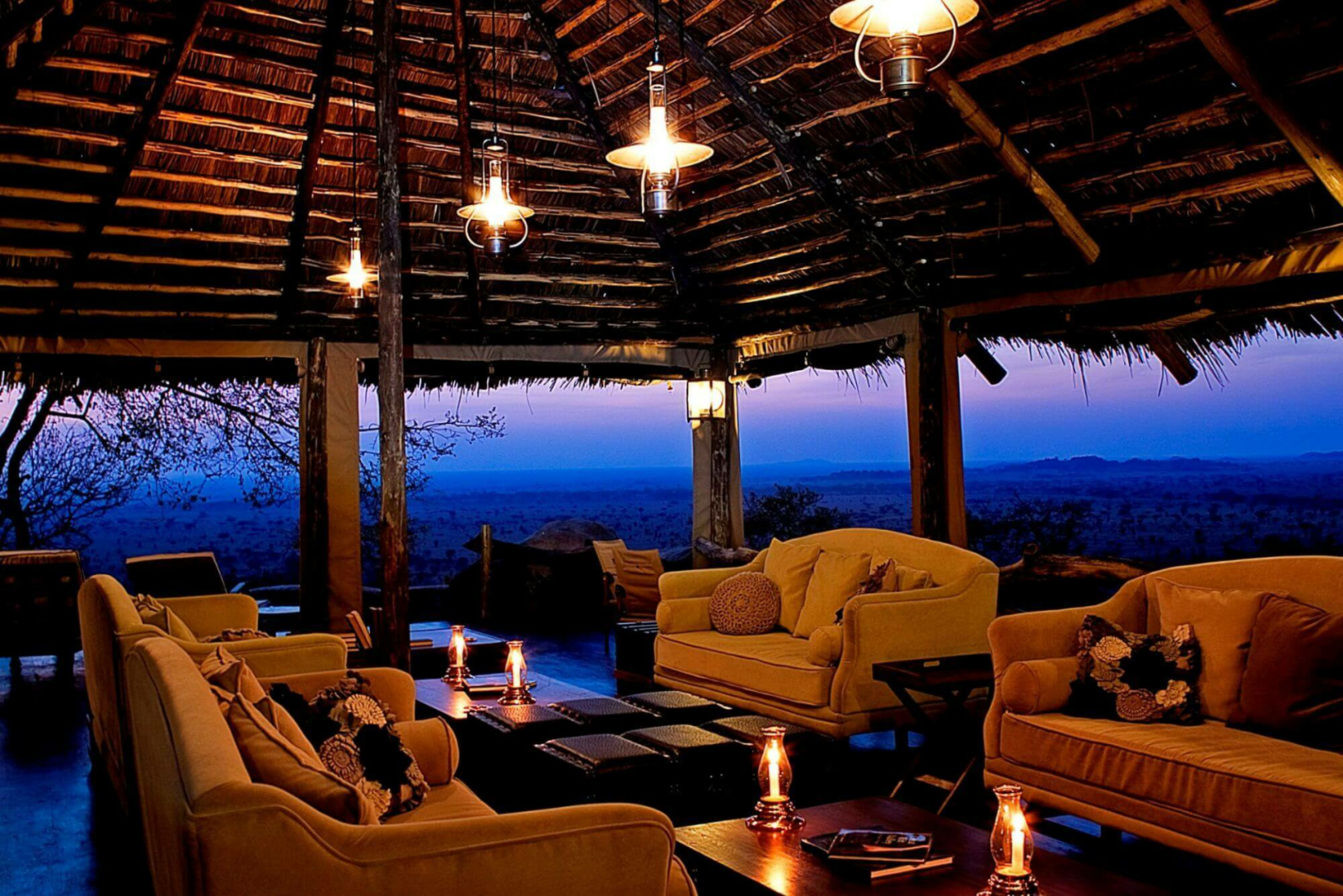 Der Loungebereich unter einem Reetdach wurde auf einer Anhöhe mit gewaltigen Ausblicken über die Savanne und ihre Tiere eingerichtet.