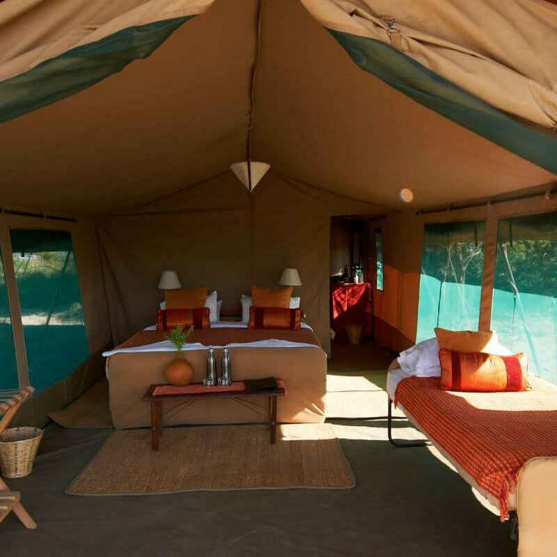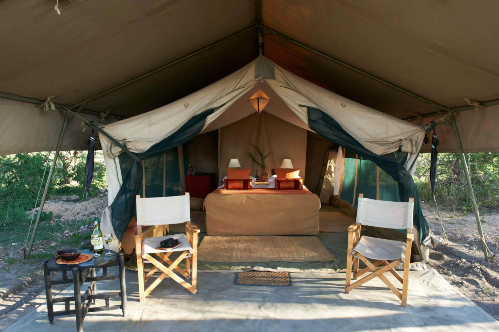 Mbugani bietet zwölf, hochwertige, sehr große Luxus-Zelte mit den klassischen Annehmlichkeiten eines typischen Safaricamps und noch ein paar zusätzlichen Extras (wie eine Sitzecke für das Frühstück.)