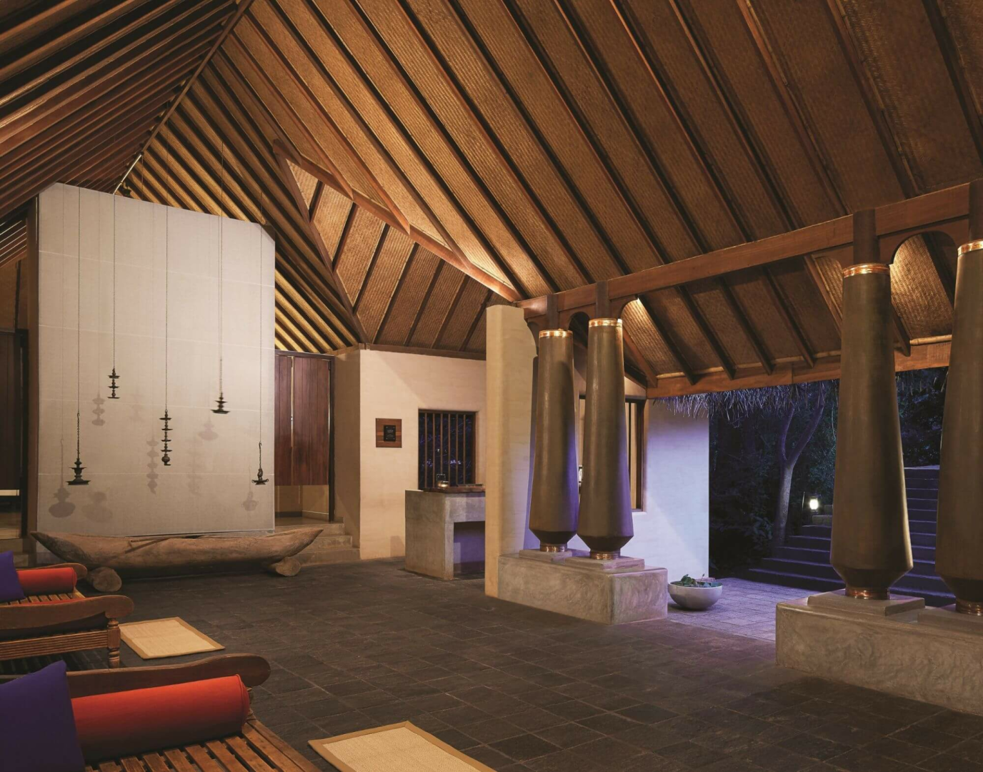 Die öffentlichen Bereiche befinden sich in einem sehr großen Gebäude unter Reet, das buchstäblich über dem See schwebt. Hier befinden sich das angenehme Lounge-Deck im Freien, der teilweise offene Essbereich und das Spa. Holz ist hier vorherrschend, aber die Inneneinrichtung ist äußerst elegant und überhaupt nicht rustikal, sie bietet einige wirklich interessante architektonische Elemente, Säulen und moderne Kunstwerke, die eine Freude für das Auge sind. Pavillons, die durch Wege über das Wasser miteinander verbunden sind, und ein Pool runden das Bild ab.