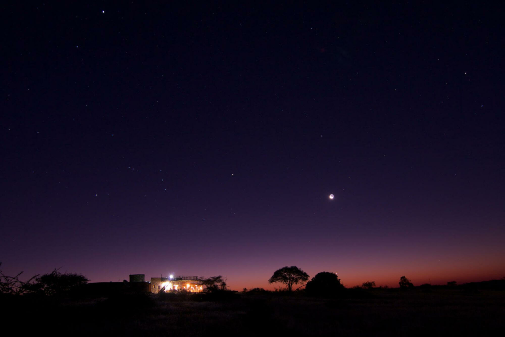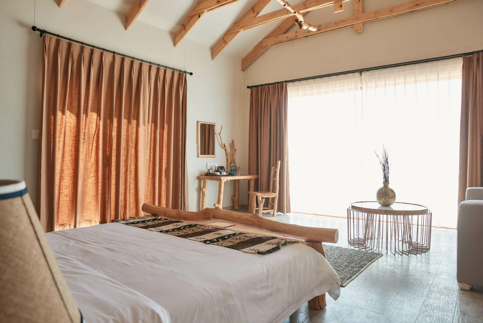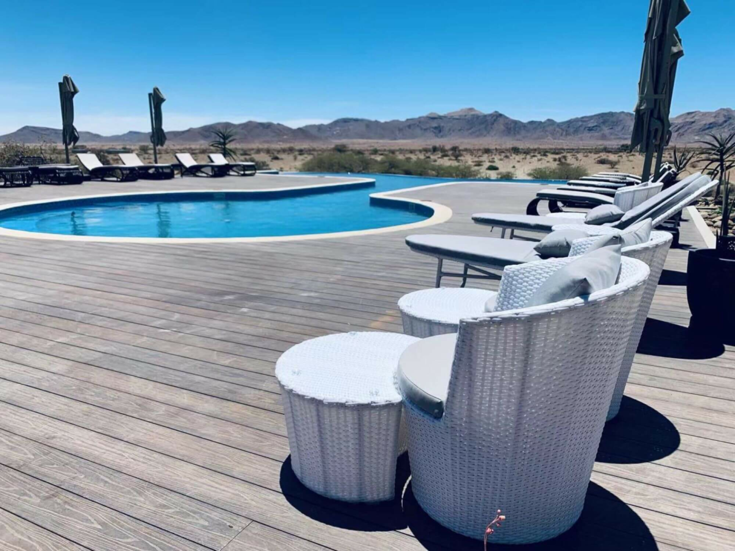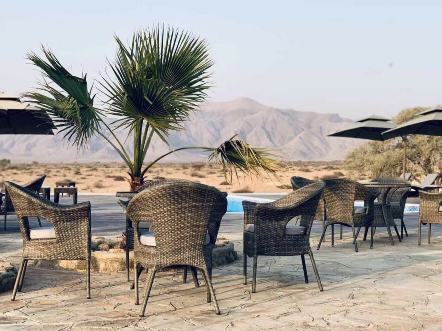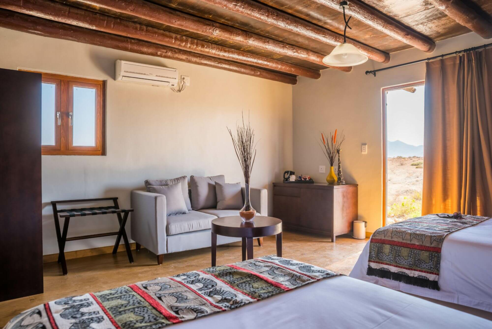 Gäste werden in acht kleinen aber sehr komfortablen klimatisierten Bungalows untergebracht, die im afrikanisch modernen Stil gehalten sind mit weißen und hellen braun Tönen. Jeder Bungalow hat ausreichende Ablagemöglichkeiten und ist mit einer kleinen Wohnecke inklusiv Sessel und Tisch ausgestattet. Außerdem kann man sein Bett auf der Dachterrasse für ein Schlafen unter dem Sternenhimmel zurechtmachen lassen, eine Chance, die man in Namibia sich nie entgehen lassen sollte.