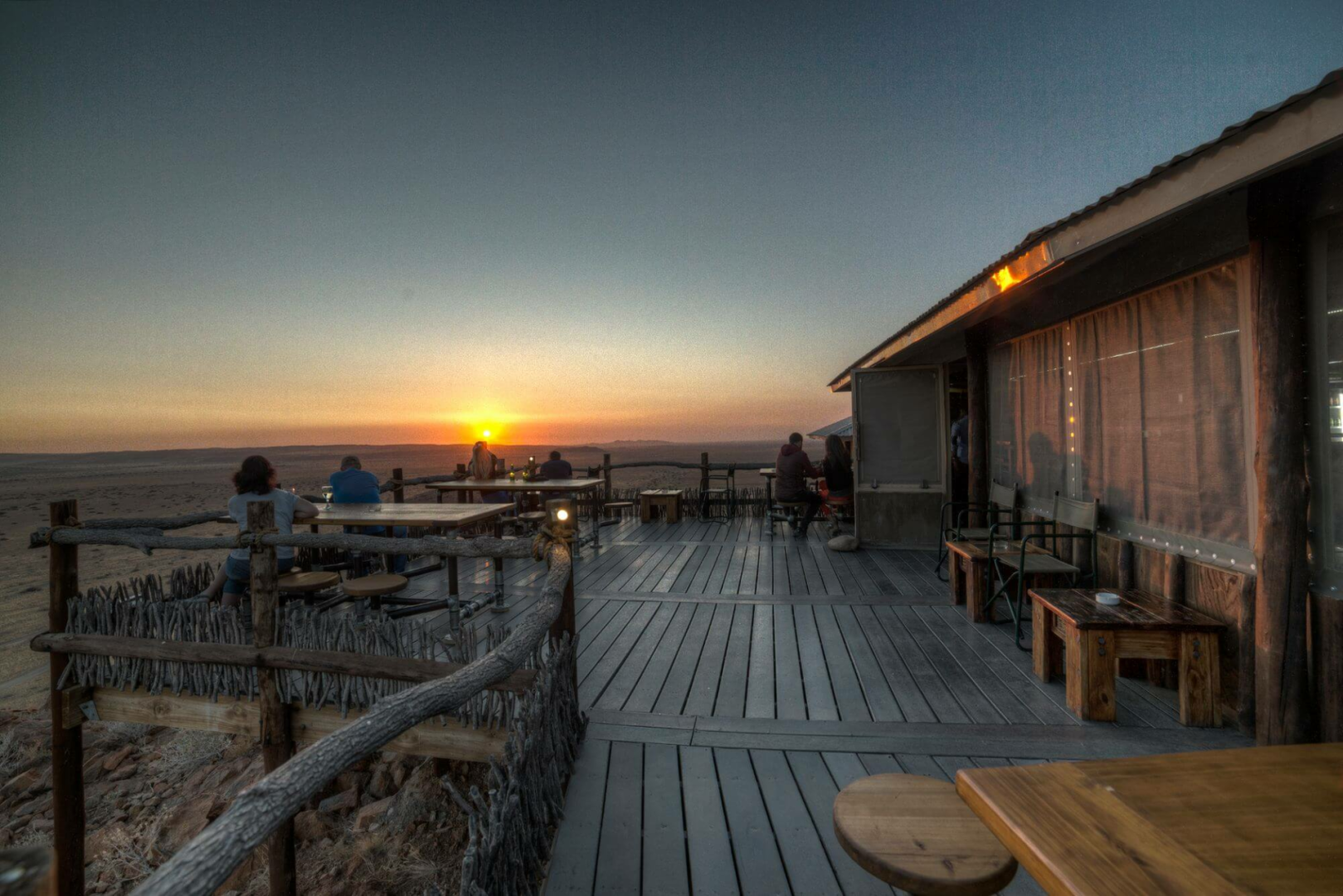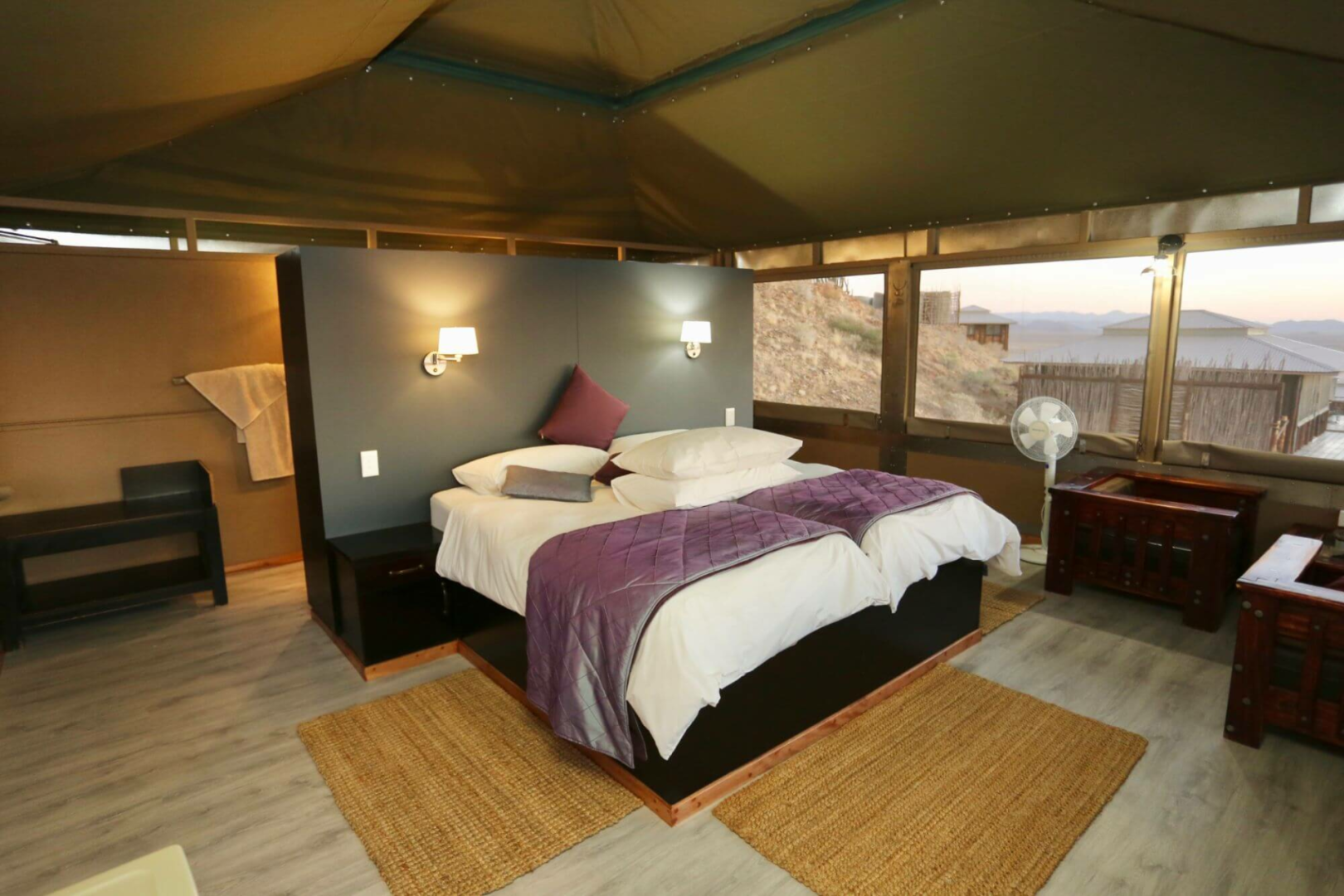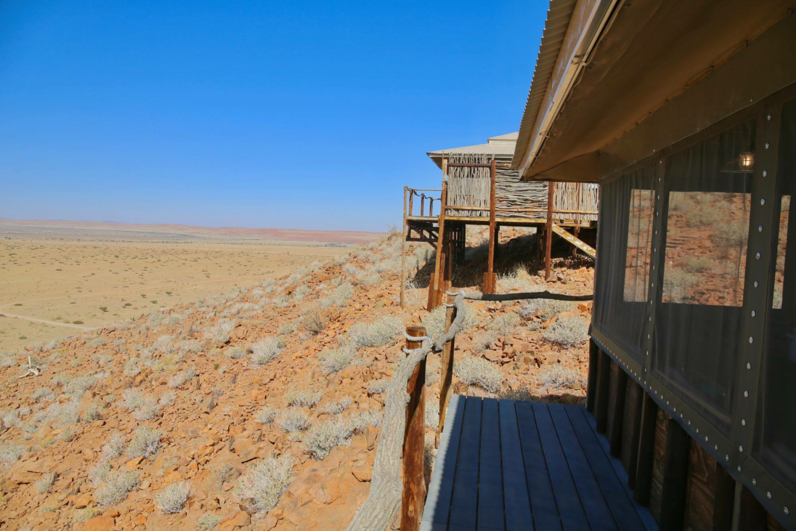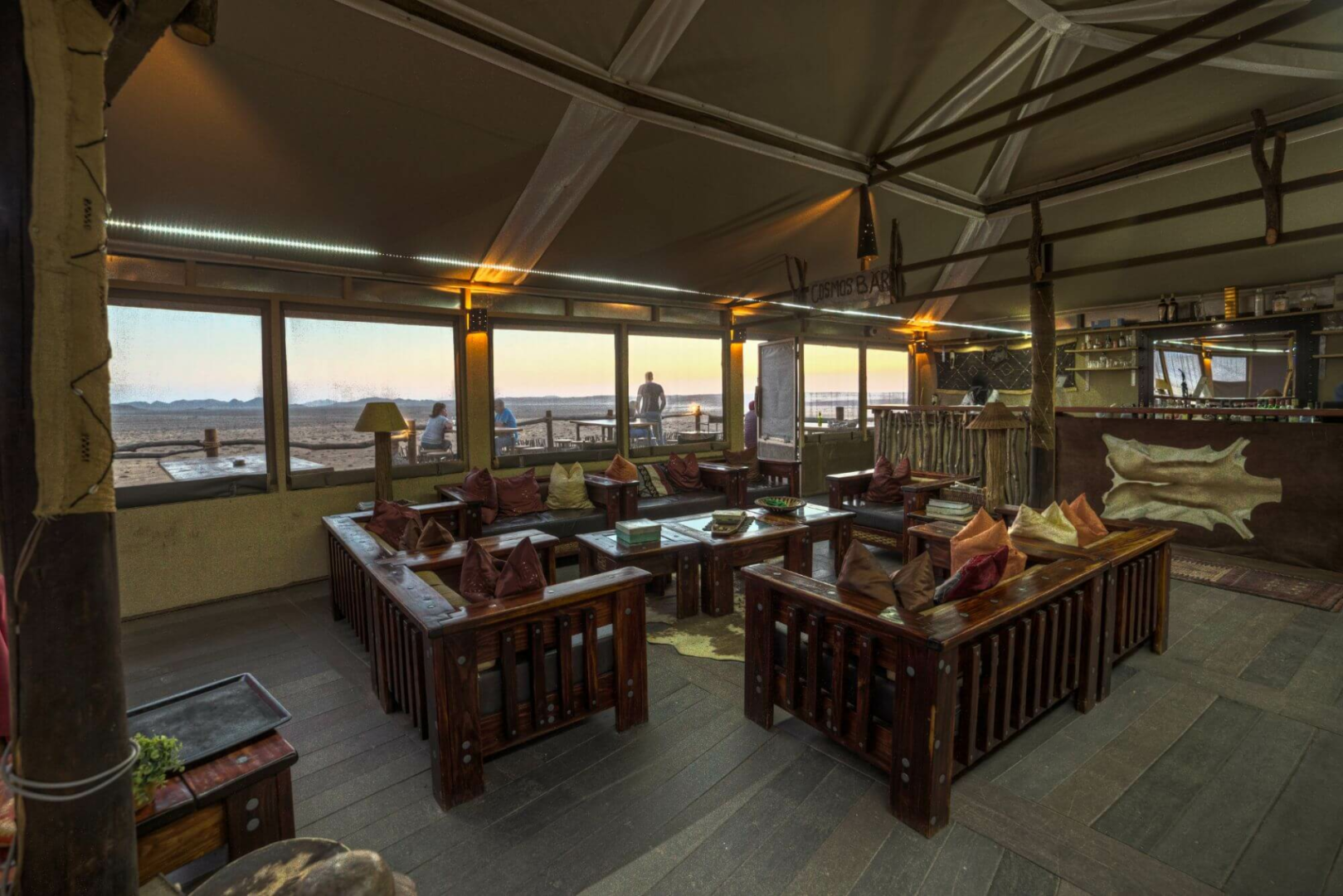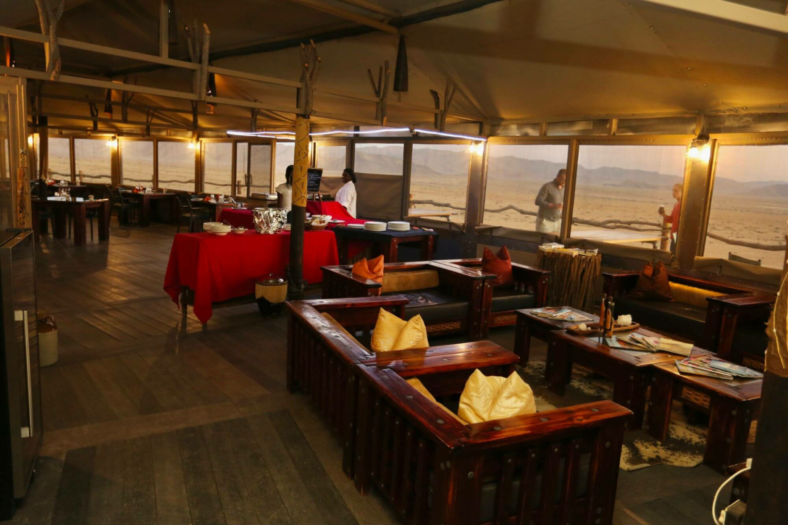 Kernstück der Lodge ist ein großer Zeltbau mit großen Panoramafenstern, die einen uneingeschränkten Blick über die Wüste ermöglichen. Im Messzelt werden die Mahlzeiten serviert. Die Hauptlodge ist in Richtung Westen gerichtet und bietet unglaubliche Sonnenuntergänge an.