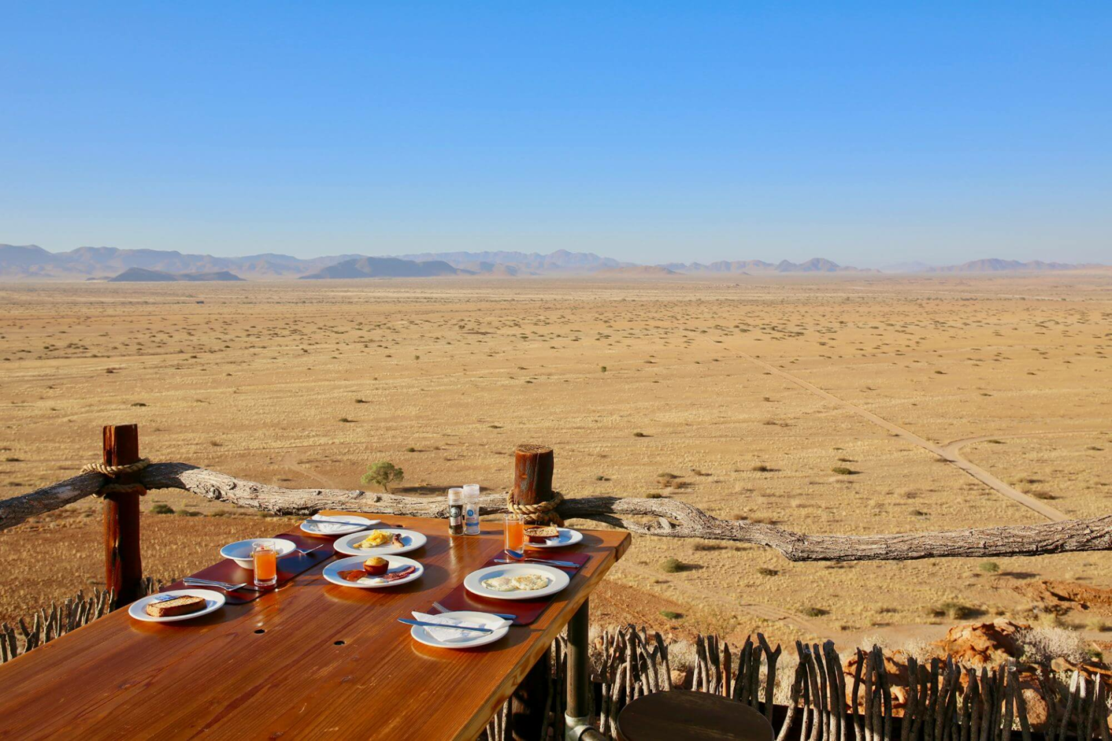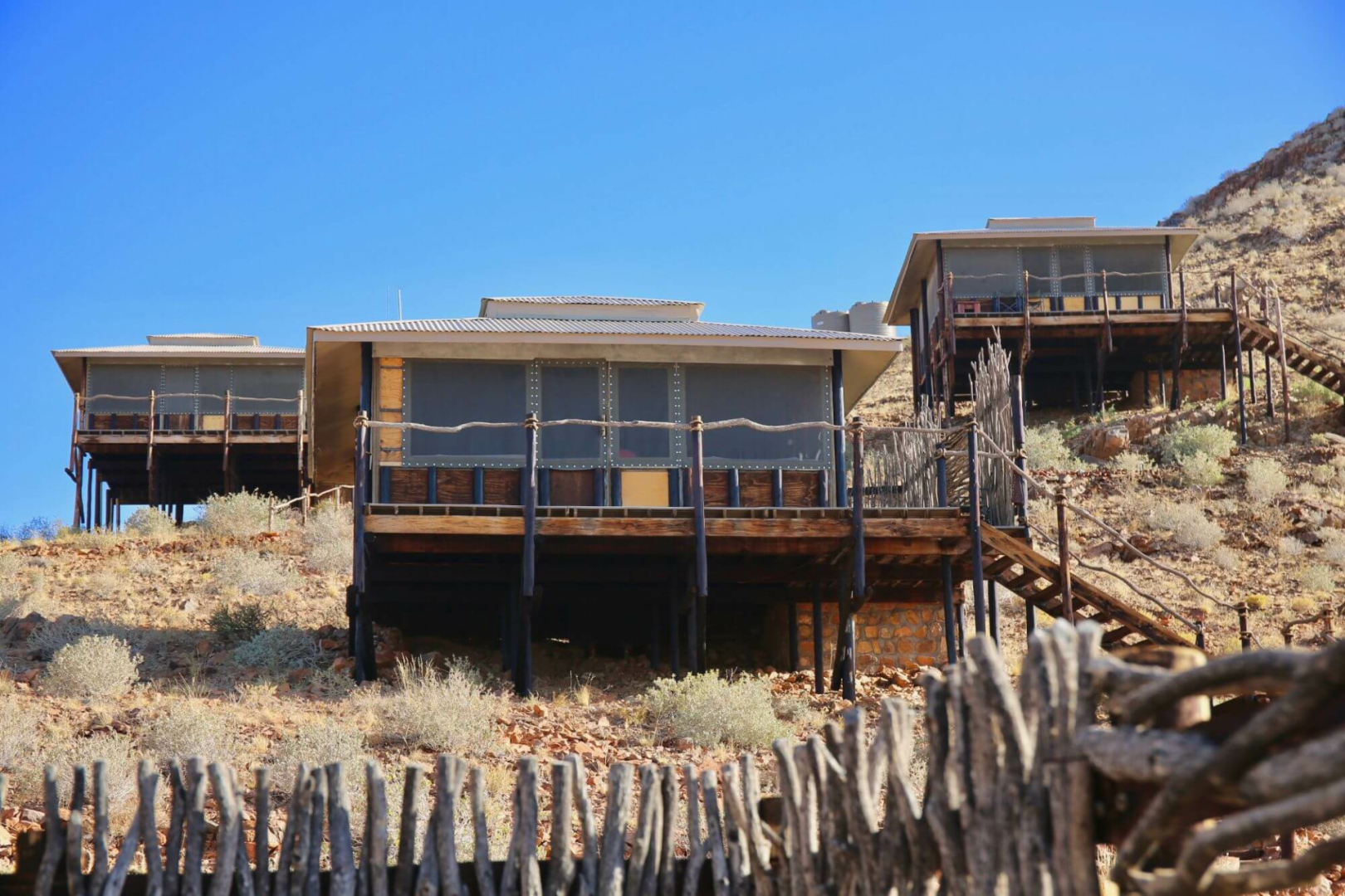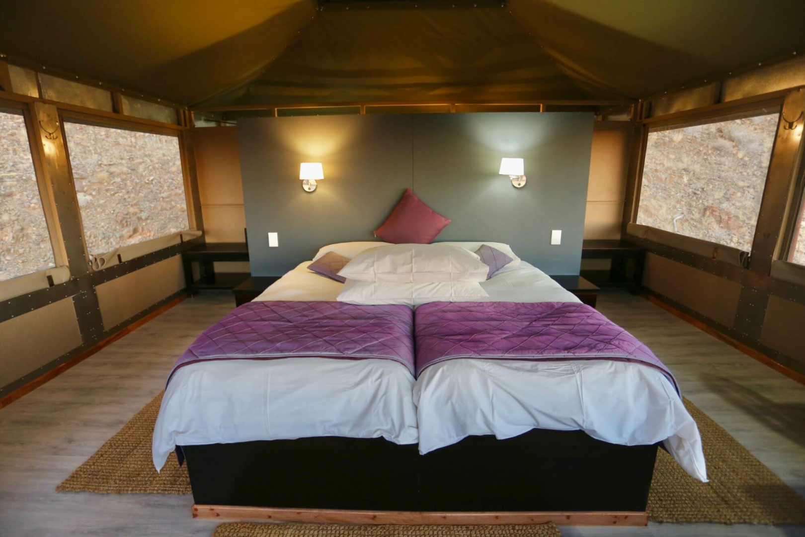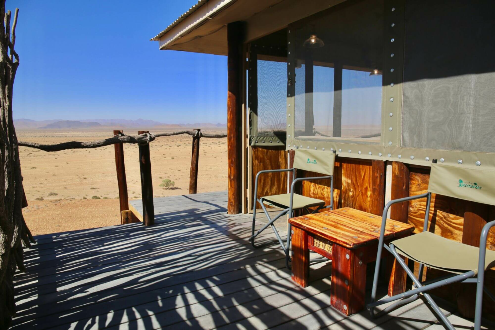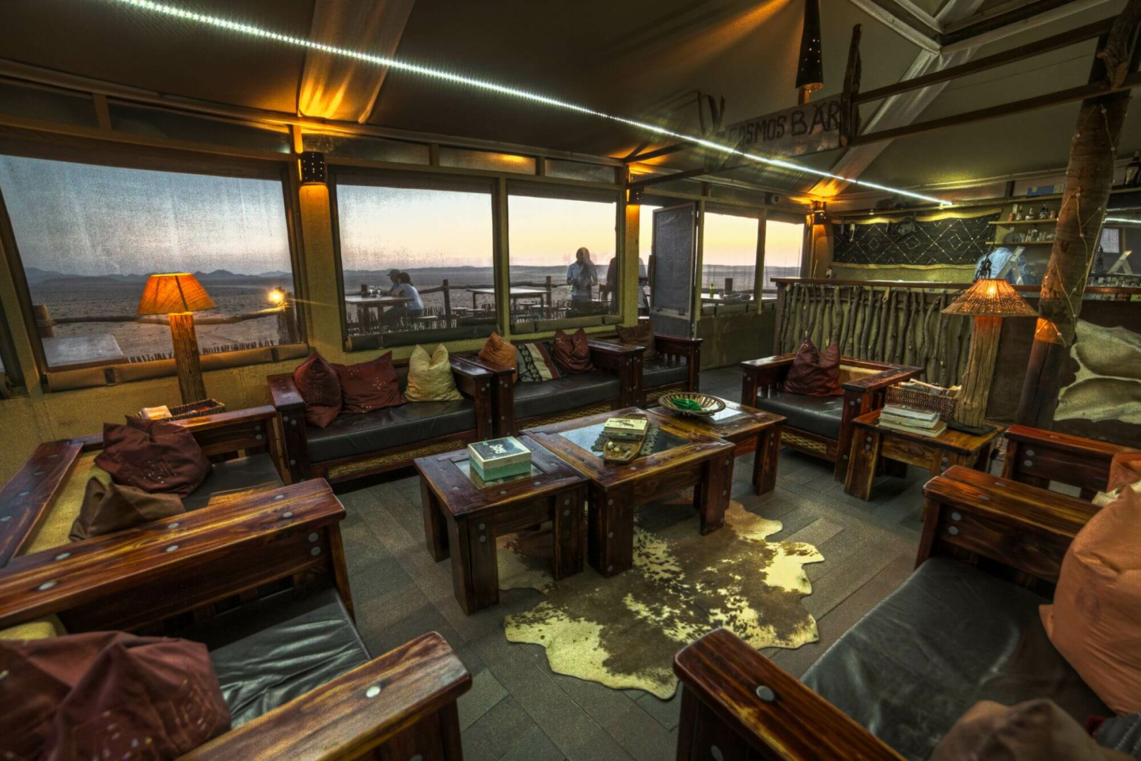 Kernstück der Lodge ist ein großer Zeltbau mit großen Panoramafenstern, die einen uneingeschränkten Blick über die Wüste ermöglichen. Im Messzelt werden die Mahlzeiten serviert. Die Hauptlodge ist in Richtung Westen gerichtet und bietet unglaubliche Sonnenuntergänge an.