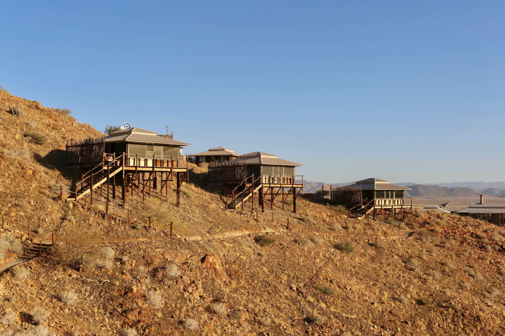 Die Moon Mountain Lodge liegt an einem Berghang etwa 7 km östlich der Straße C19 auf dem Weg nach Sesriem (Sossvuslei) in der Nord-Namib im Südwesten Namibias. Die Lodge, im Besitz der Protea-Gruppe, überblickt die karge Landschaft und vereint Luxuszelte mit Desert-Feeling mit dem Komfort eines Stadthotels.
