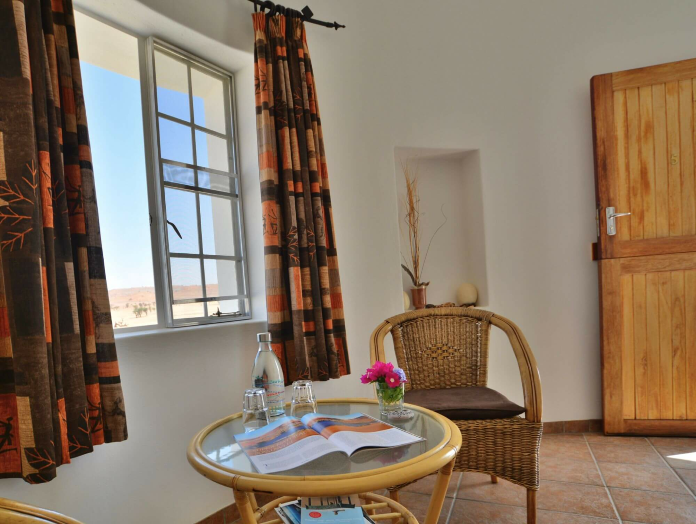 Eine ganz besondere Eigenschaft der Tsondab Valley Lodge ist die lodgeeigene Landebahn mit Leichtflieger, der Gastgeber Hans selbst bedient. Keinesfalls verpassen sollte man also die Möglichkeit, einen Rundflug über das Dünenmeer der Namibwüste zu unternehmen (Bezahlung vor Ort!) Der Flug dauert ca. 2 Stunden und 20 Minuten. Flüge bis zur Atlantikküste gehen nur am Nachmittag.