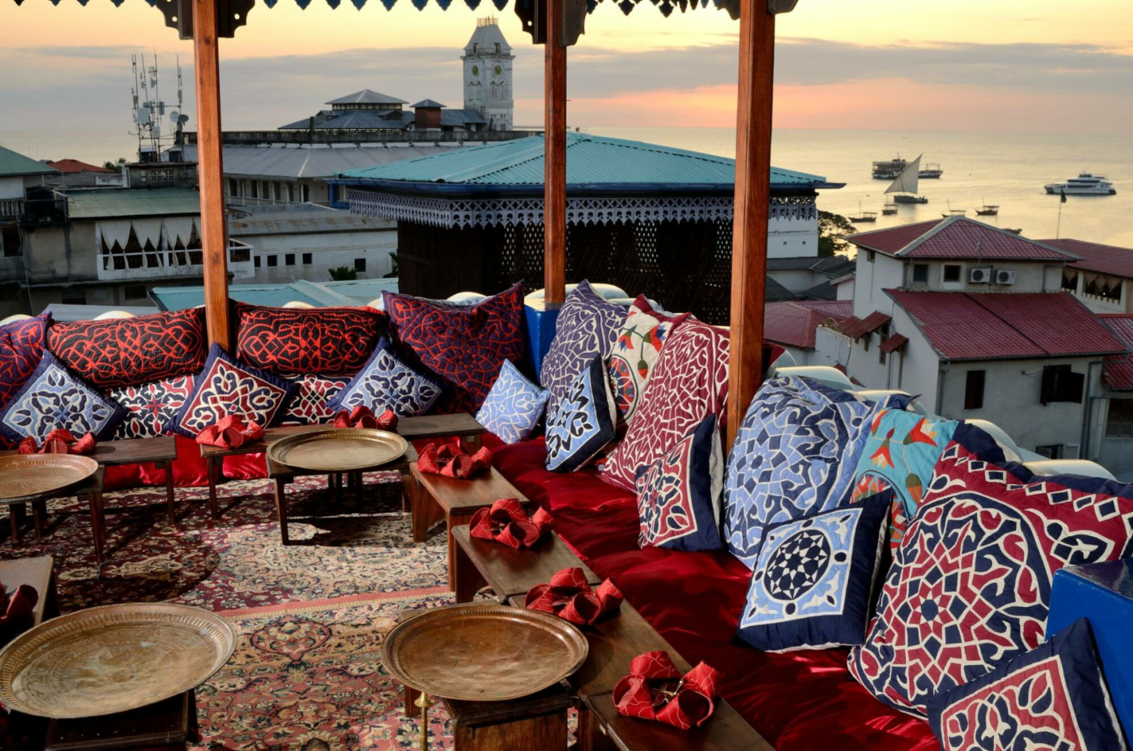 Berühmt in der ganzen Stadt ist das Tea House Rooftop Restaurant, eins der höchstgelegenen Punkte in Stone Town mit einem wunderbaren 360-Grad-Panorama über die Dächer der Altstadt, ein unvergesslicher Ort, um den Sonnenuntergang mit einem Drink bei traditioneller sansibari Live-Musik zu bestaunen! Traditionelles Suaheli-Essen wird zum Mittag- und Abendessen serviert.