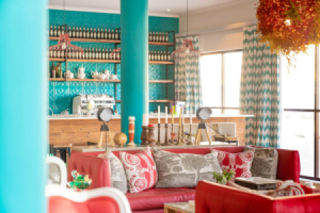 Der Zugang zum Gästehaus erfolgt durch einen angenehmen begrünten Innenhof, der von den Zimmern und dem gemeinsamen Bereich flankiert wird. Hinter der Rezeption befinden sich der gemeinschaftliche Essbereich, die Bar und die Lounge, in der kostenlose Zeitungen und WiFi zur Verfügung stehen. Die Inneneinrichtung ist modern und fast skandinavisch, mit schlichtem weiß und schwarz Mobilar und grau gestrichenen Wänden.